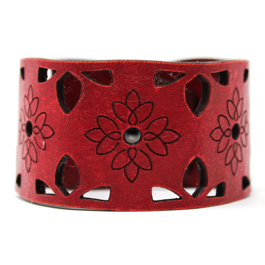 Simple, but elegant line of thick 100% leather Cuffs with laser engraved and cut designs featuring a...
