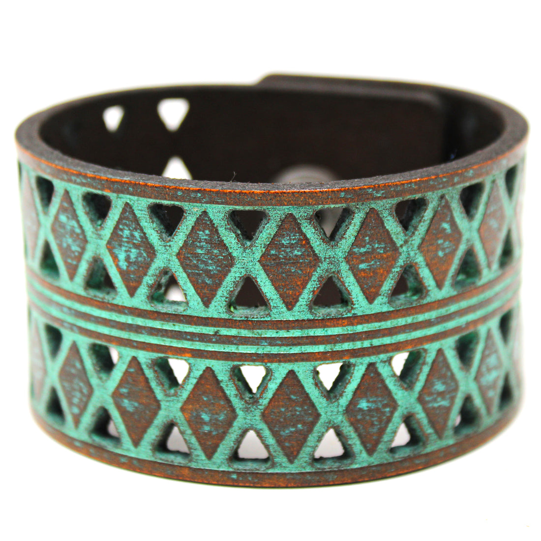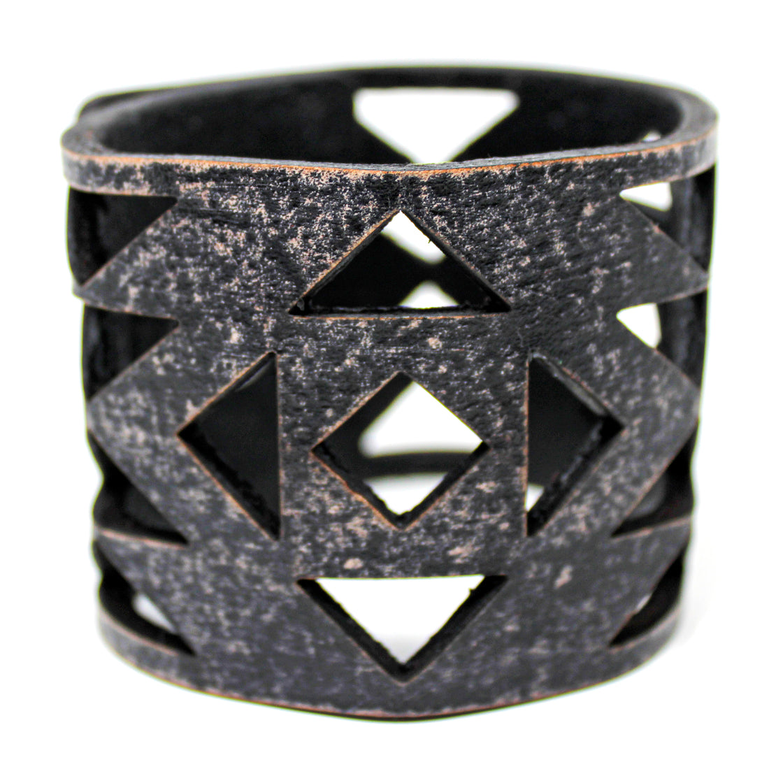 Simple, but elegant line of thick 100% leather Cuffs featuring a tribal triangular patterns with...