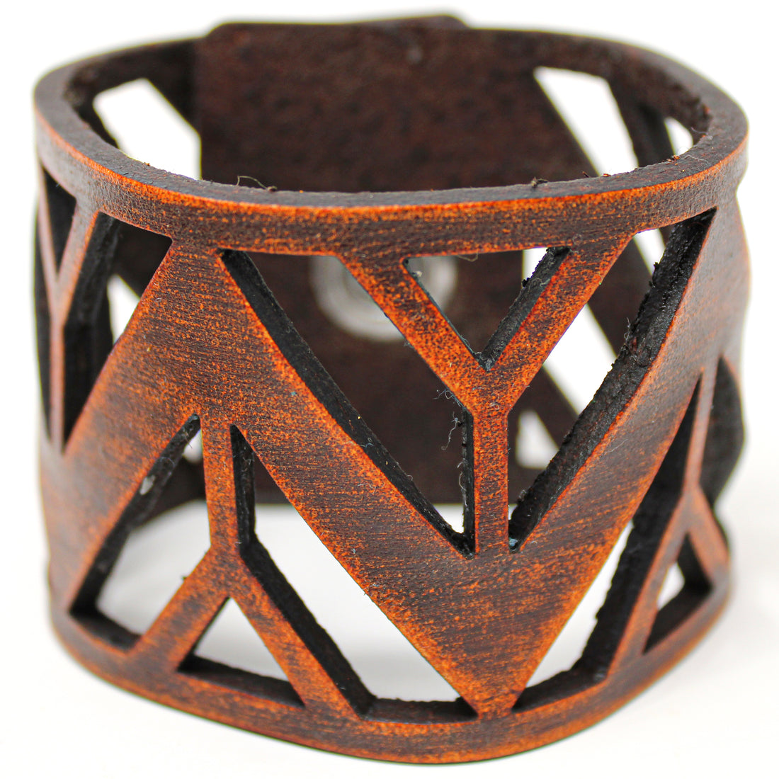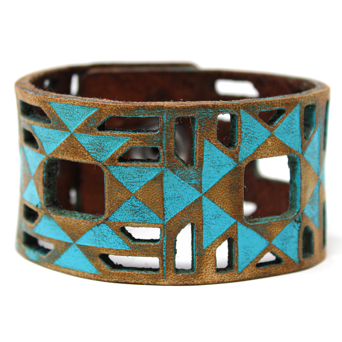 Simple, but elegant line of thick 100% leather Cuffs with laser engraved and cut bold triangles. Artisan...