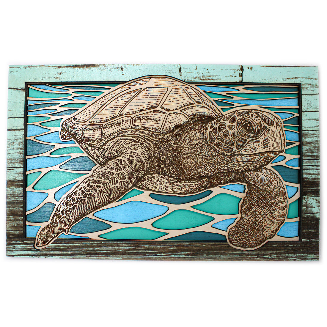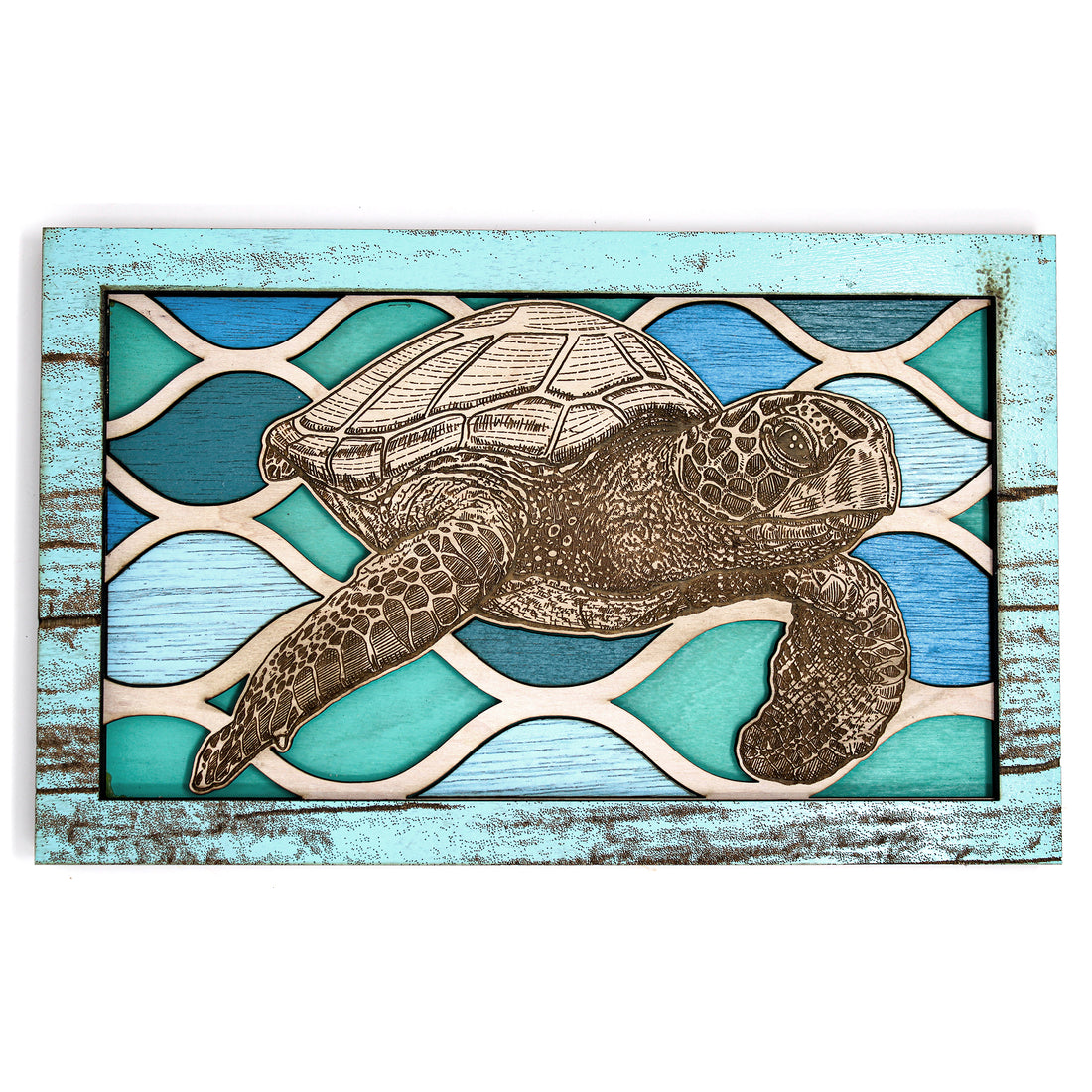This custom crafted wood 3D wall art shows a sea turtle flowing through the beautiful colorful...