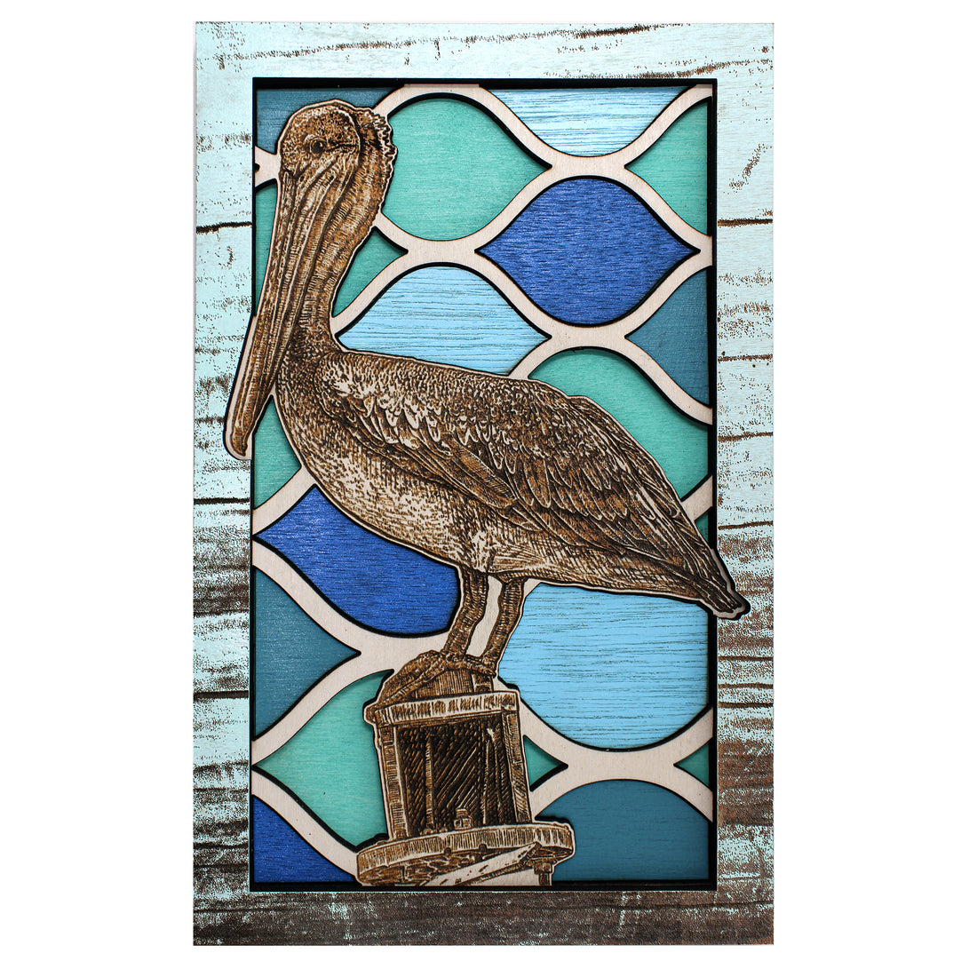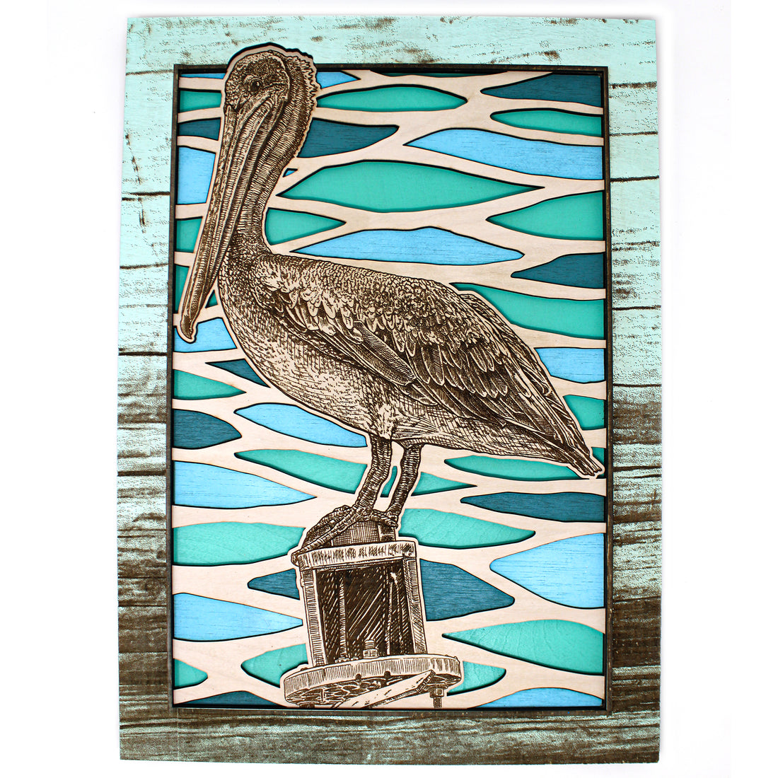 This custom crafted wood 3D wall art shows a Pelican Perched on a channel marker with the...
