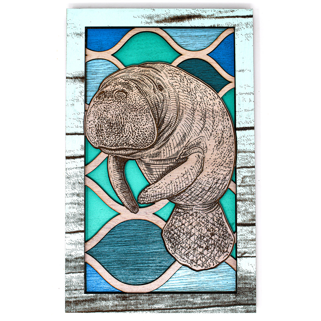 This custom crafted 3D wood wall art decor was created using one of Matt Herman’s illustrated Manatee...
