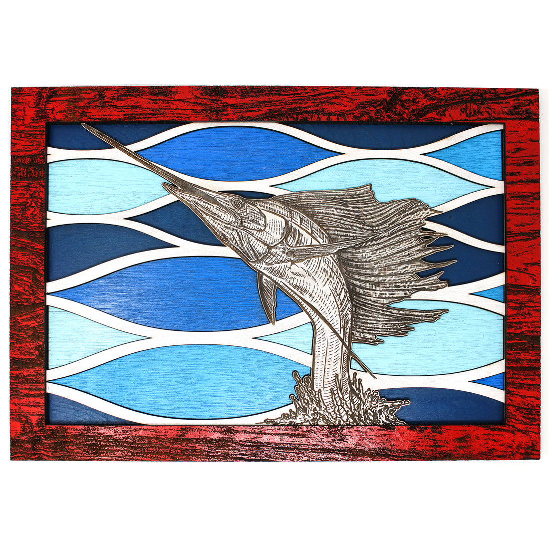 This custom crafted wood 3D wall art shows a Sailfish jumping out for it's next bite...