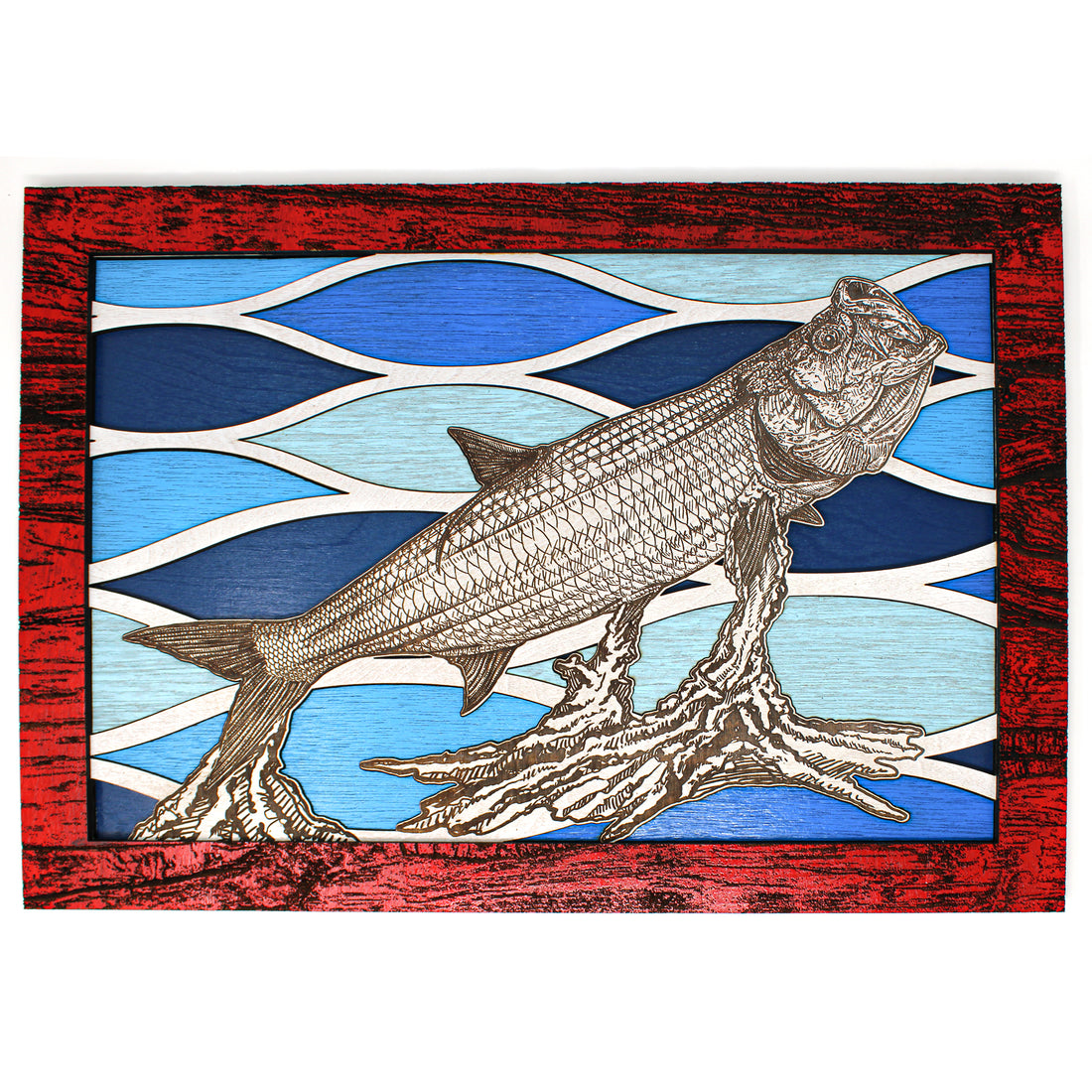 This custom crafted wood 3D wall art shows a Tarpon jumping out of the water successfully...