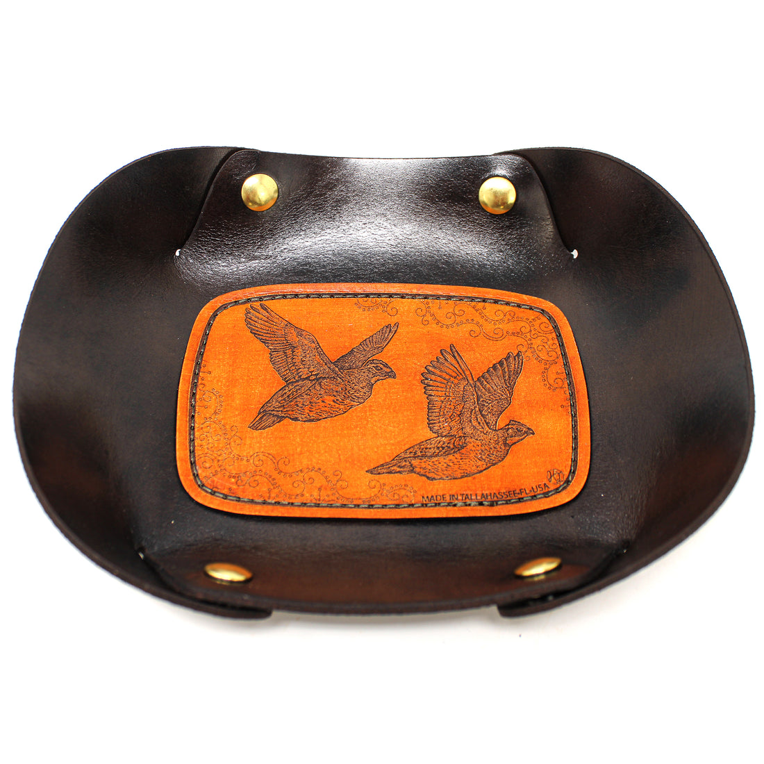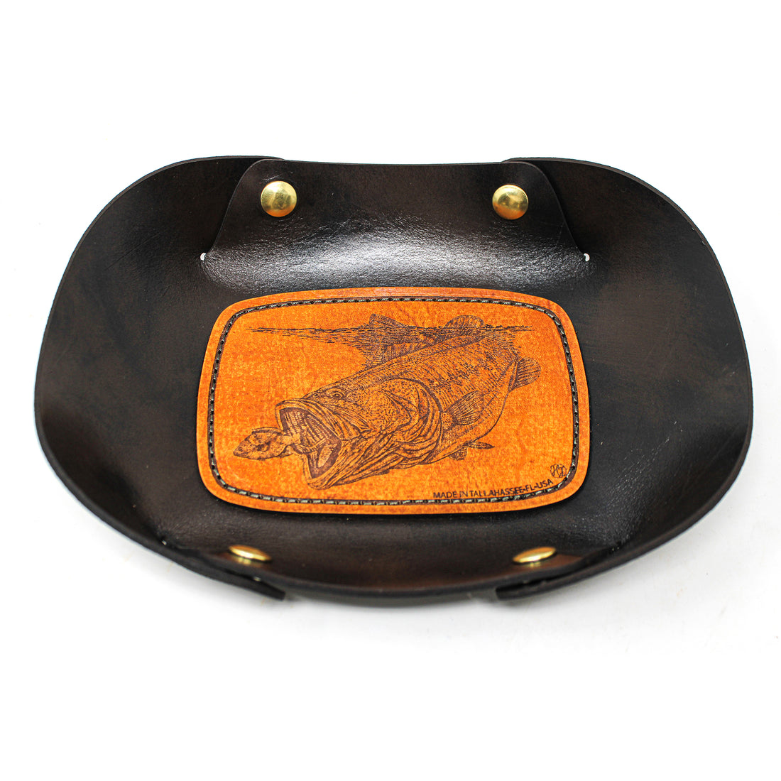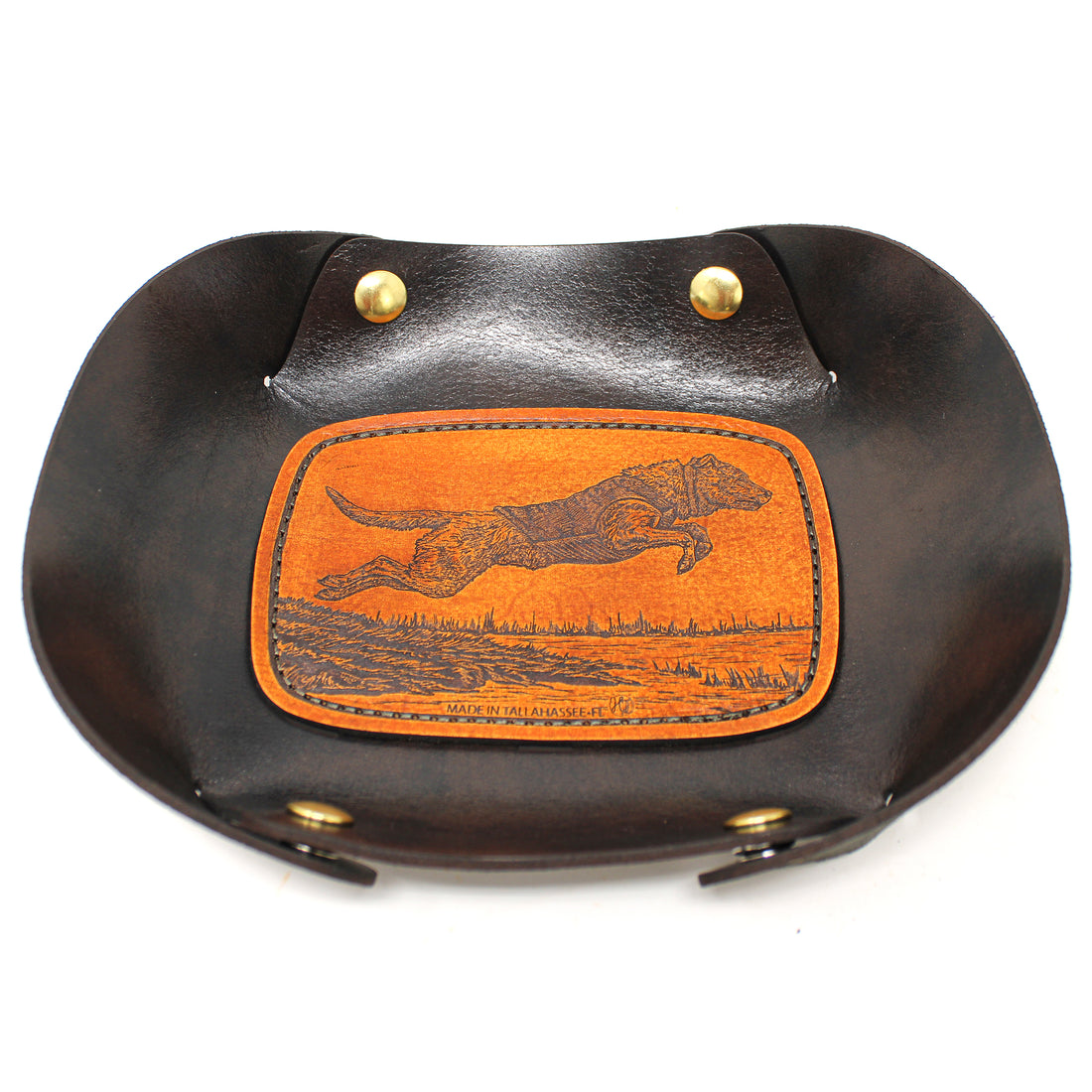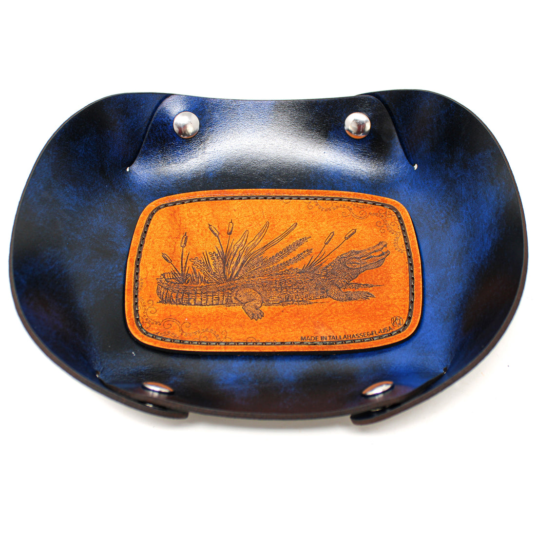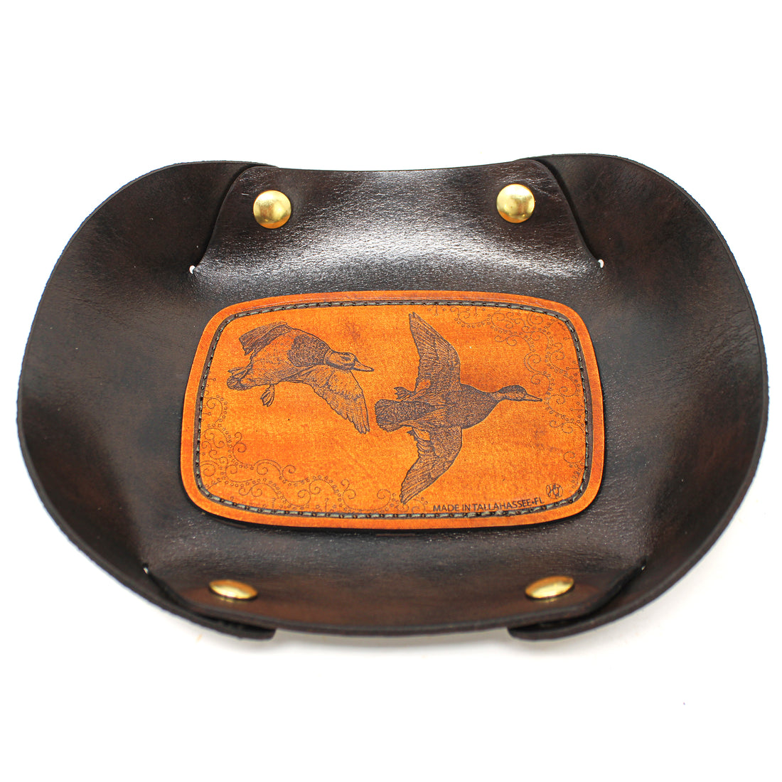 Our custom valet trays or catch alls are made by us using our original illustrations. We've developed this with the best leather for this product and strengthened the design concept with a patch of leather heavily sewn down in the center. Proudly made in Tallahassee, FL USA.