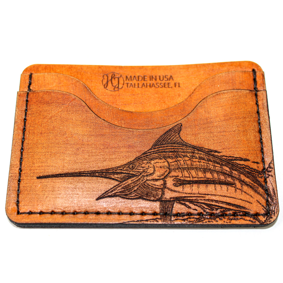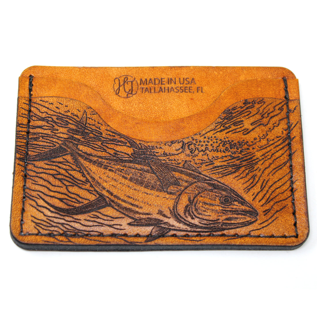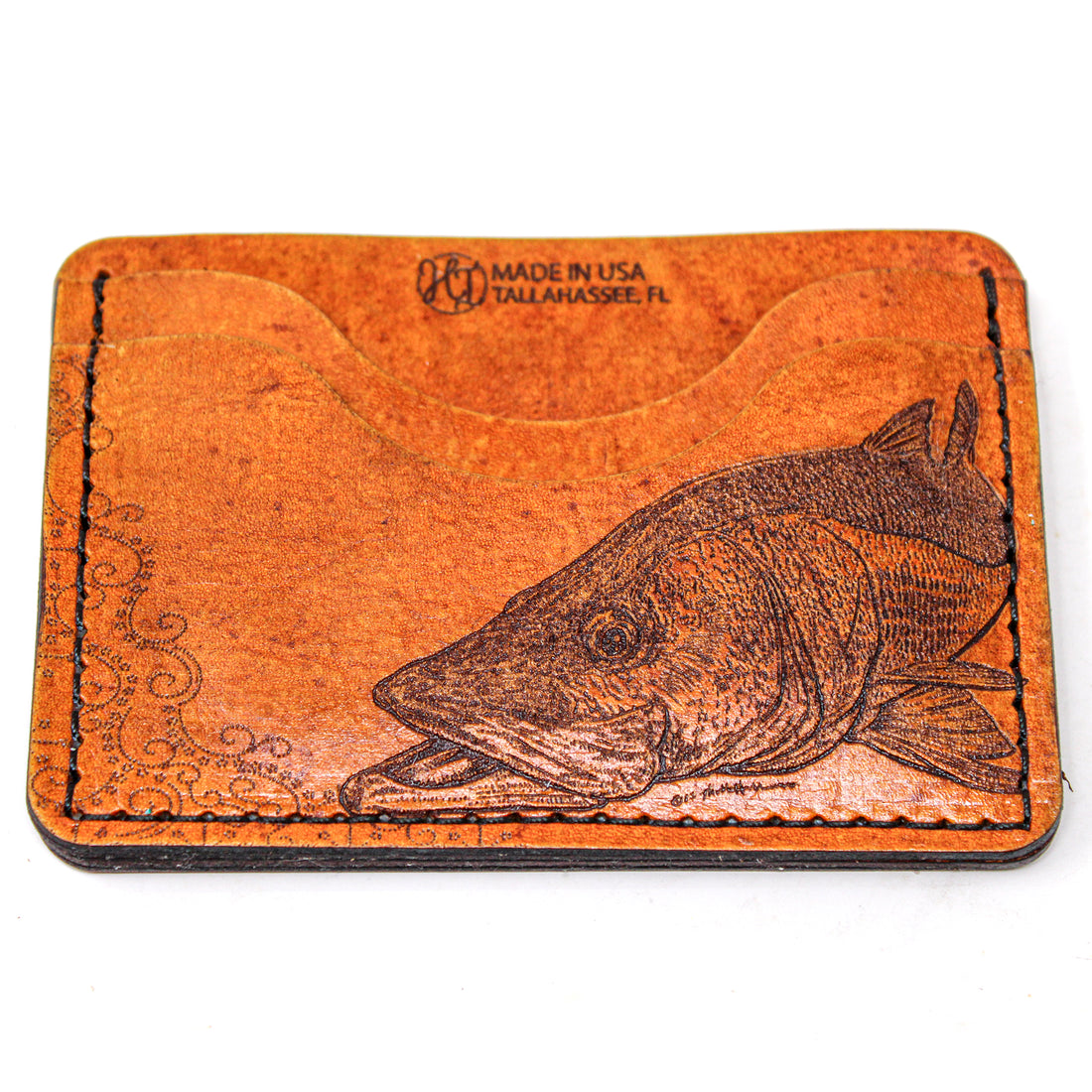 Hand stained. Hand distressed and conditioned. Each wallet is unique. Using sheets of cowhide that we laser etch our own illustrations and designs. Want something specific? Drop us an email at orders@hometowninspiration.com and we can start on your custom wallet today! Made by us, here in Tallahassee, FL.