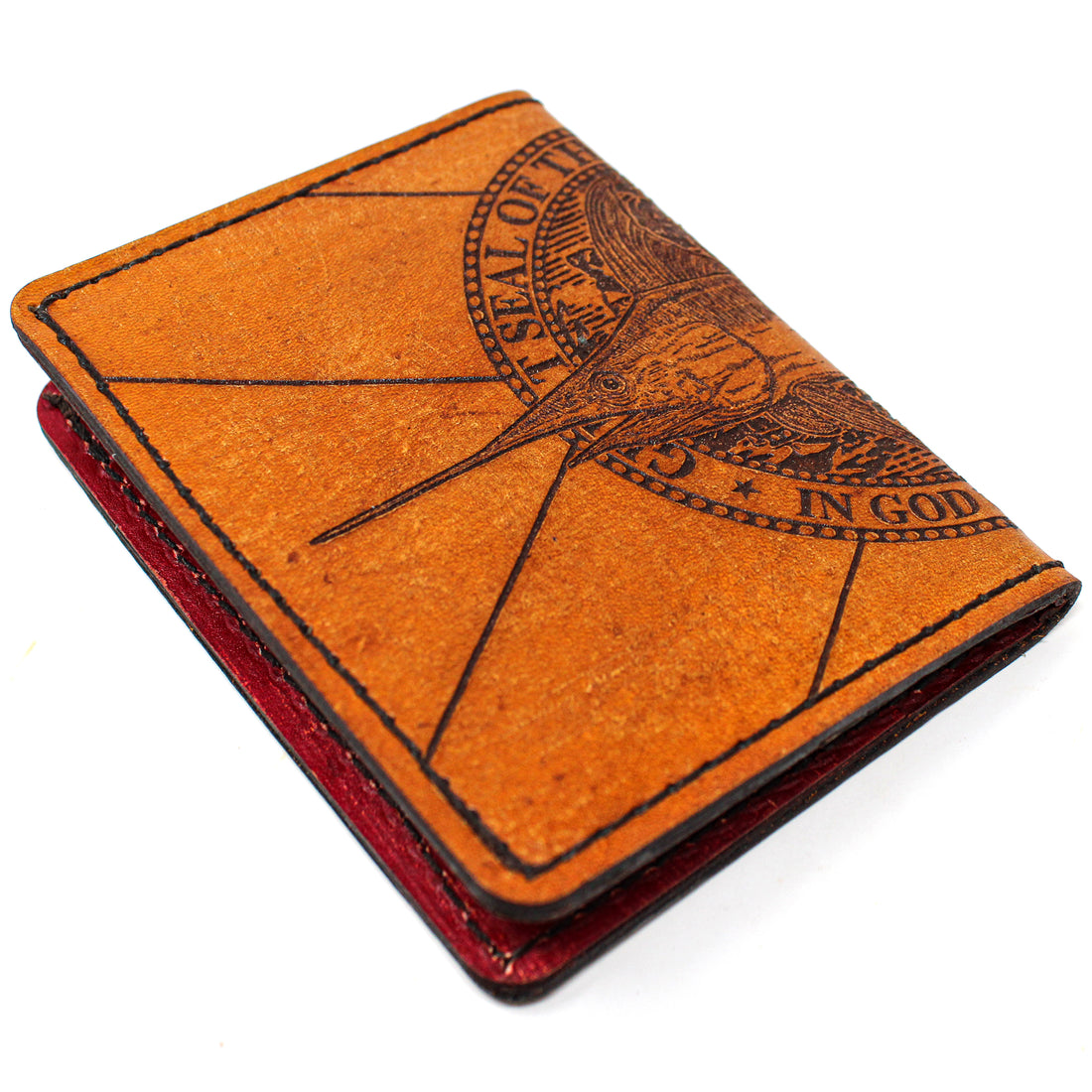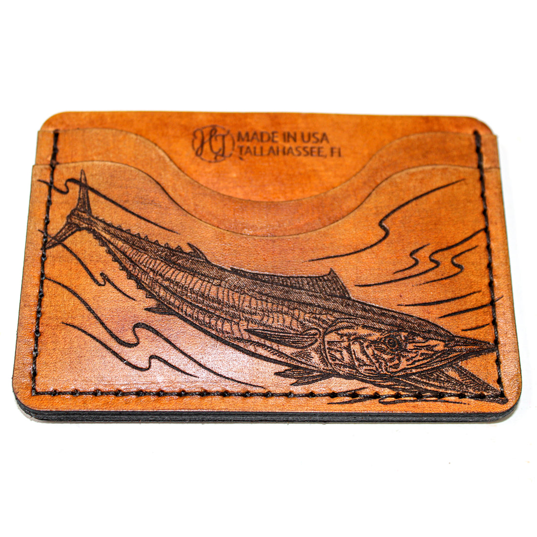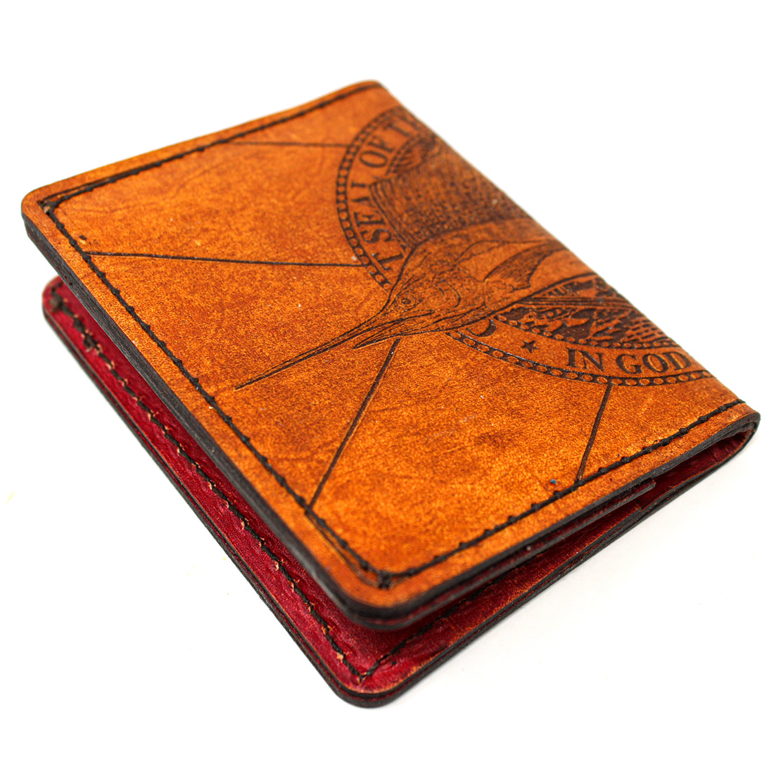 Hand stained. Hand distressed and conditioned. Each wallet is unique. Using sheets of cowhide that we laser etch our own illustrations and designs. Want something specific? Drop us an email at orders@hometowninspiration.com and we can start on your custom wallet today! Made by us, here in Tallahassee, FL.