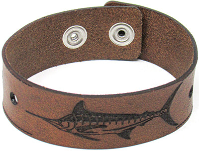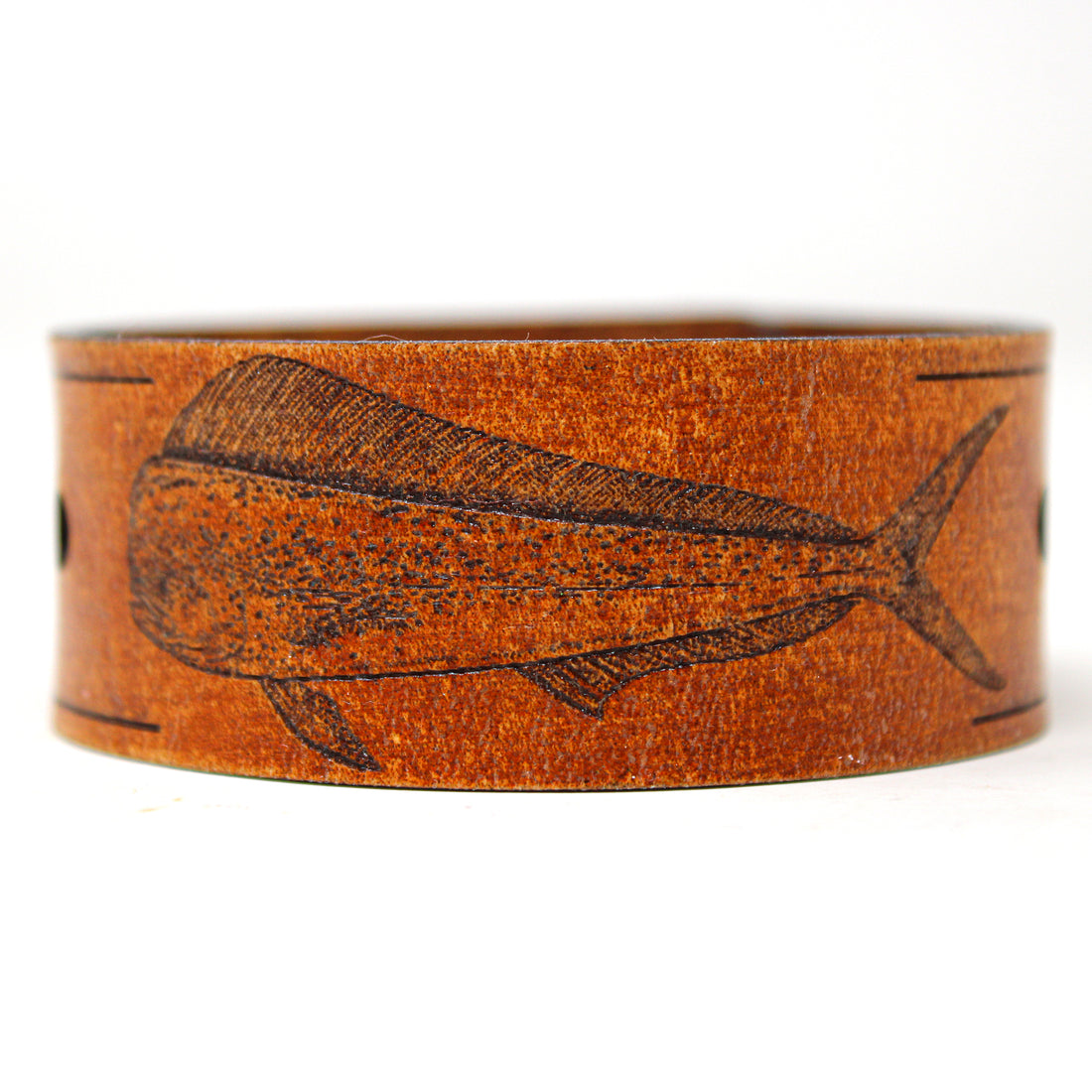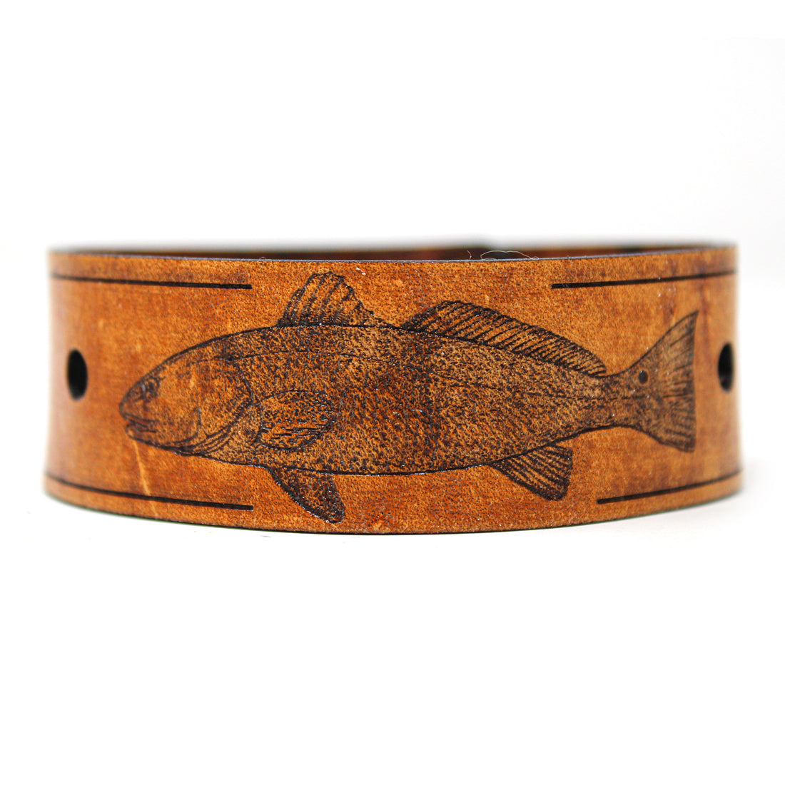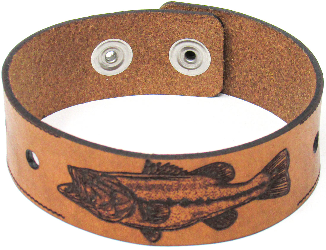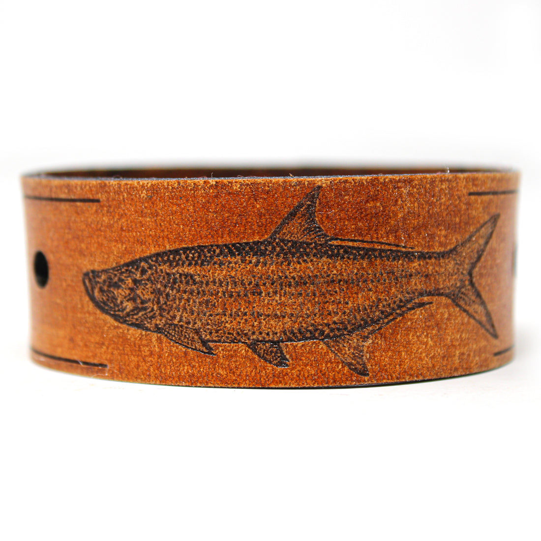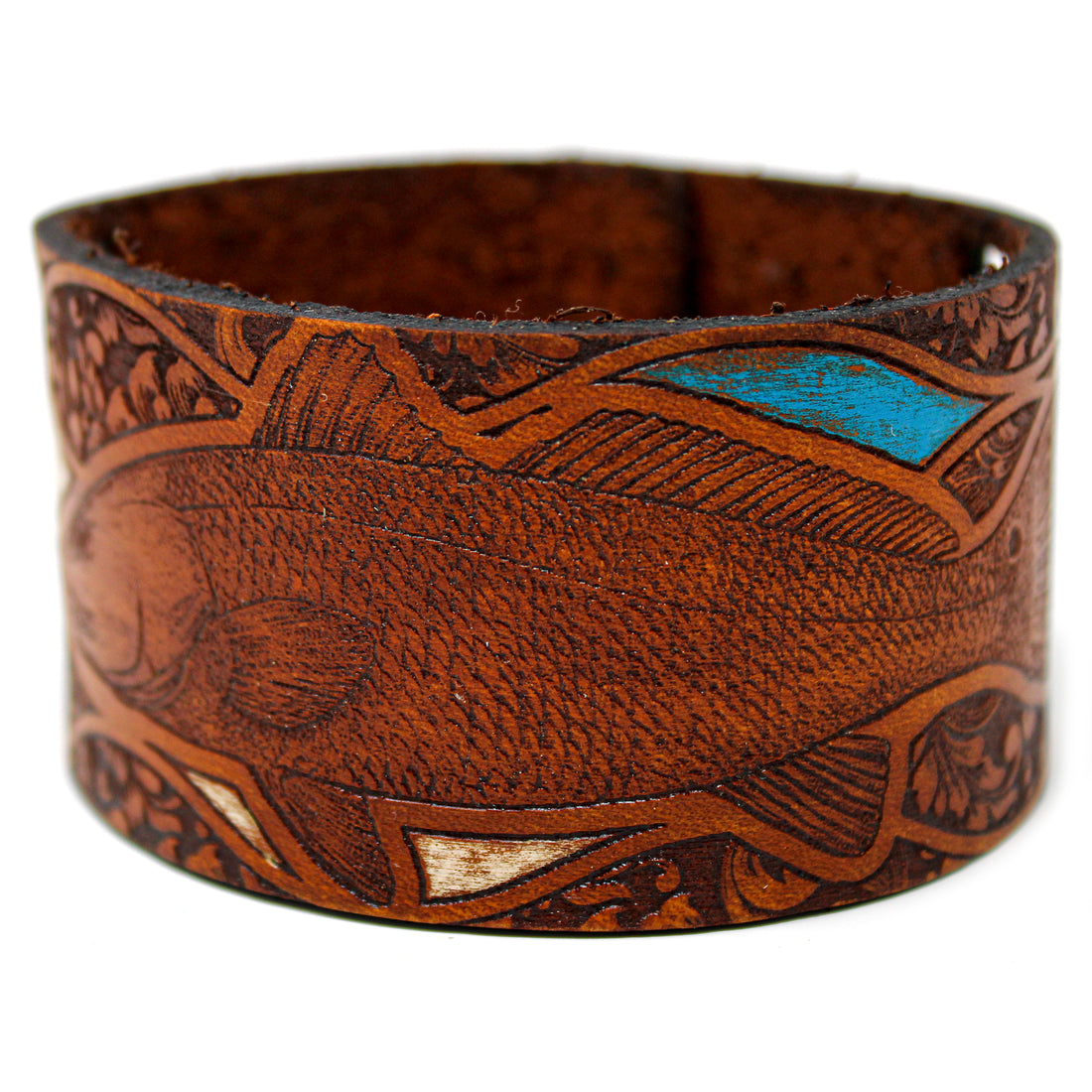 Men's Leather Wristband Series. Fishing inspired illustrated laser engraved 100% leather bracelet designs with Artisan hand finished treatments. Featuring stainless...