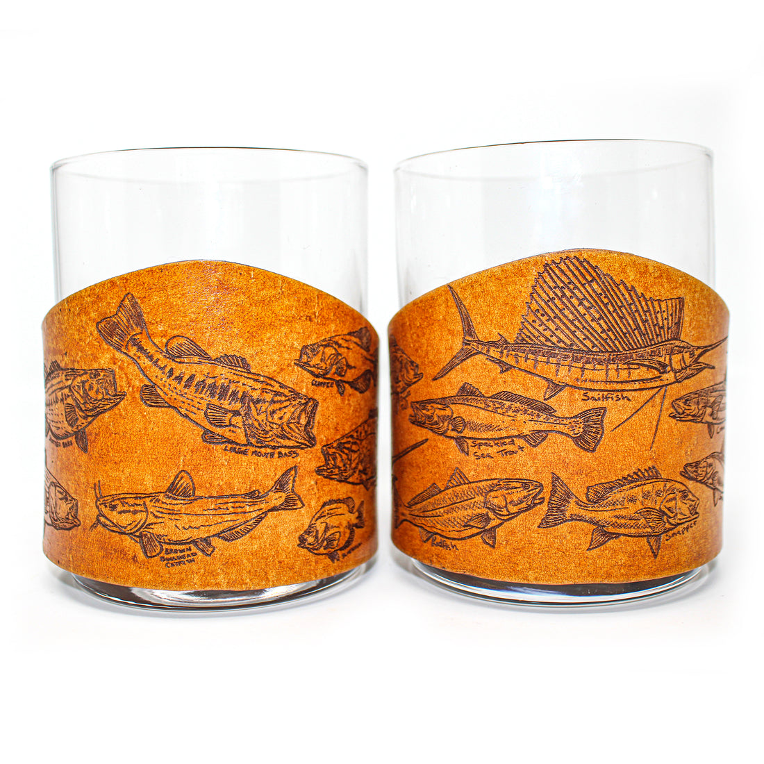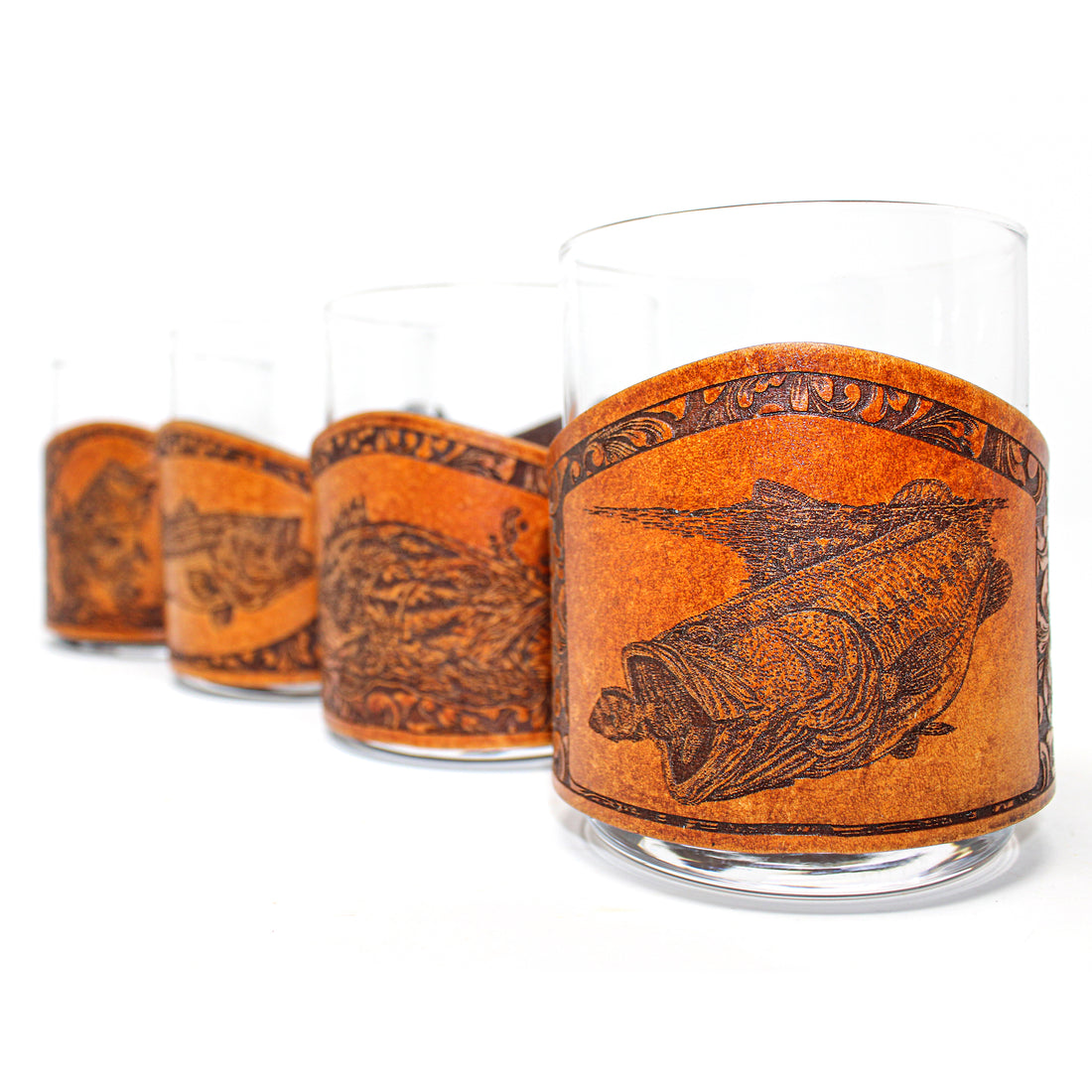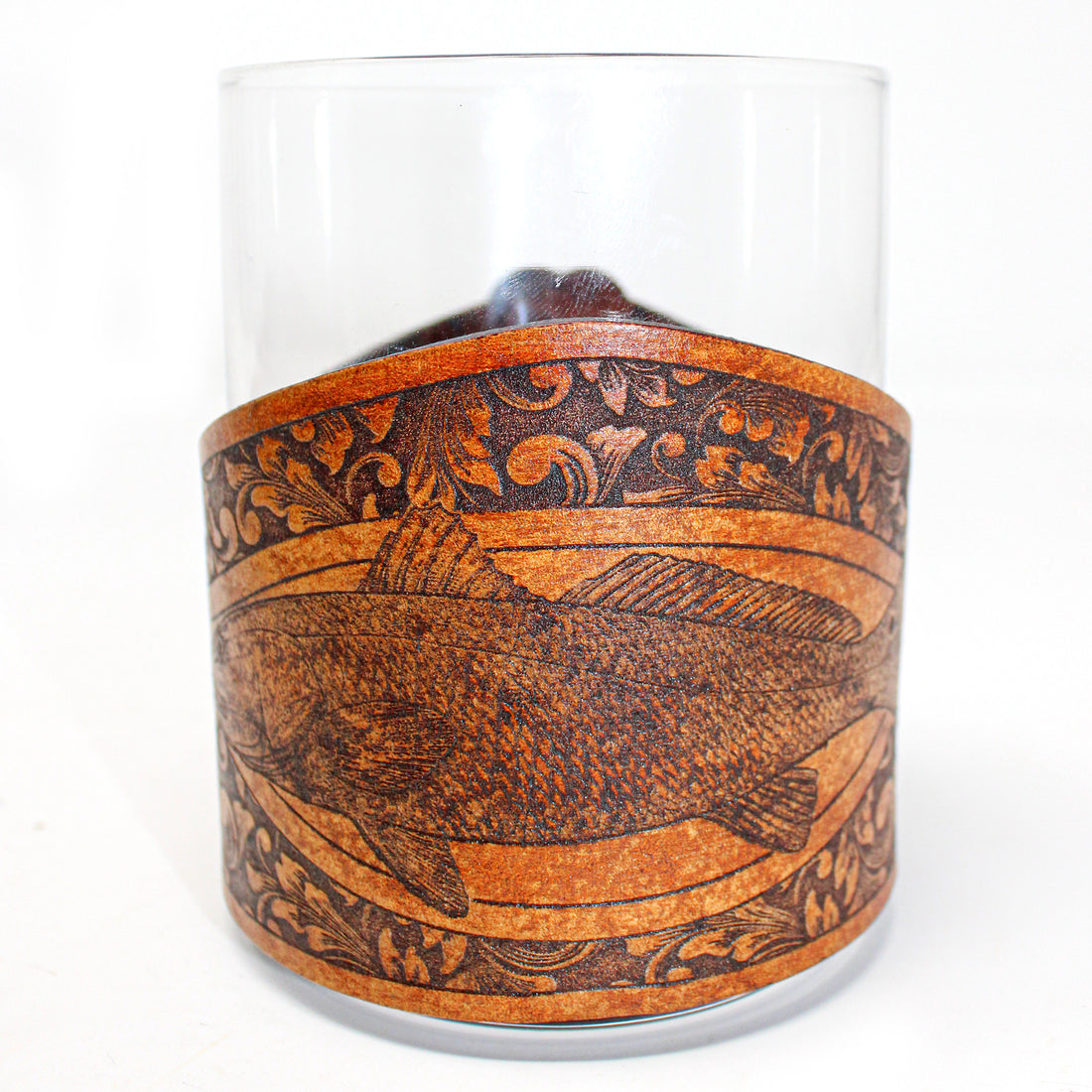 Envoltura de cuero para vaso de whisky - Vidrio grabador Redfish estilo SC