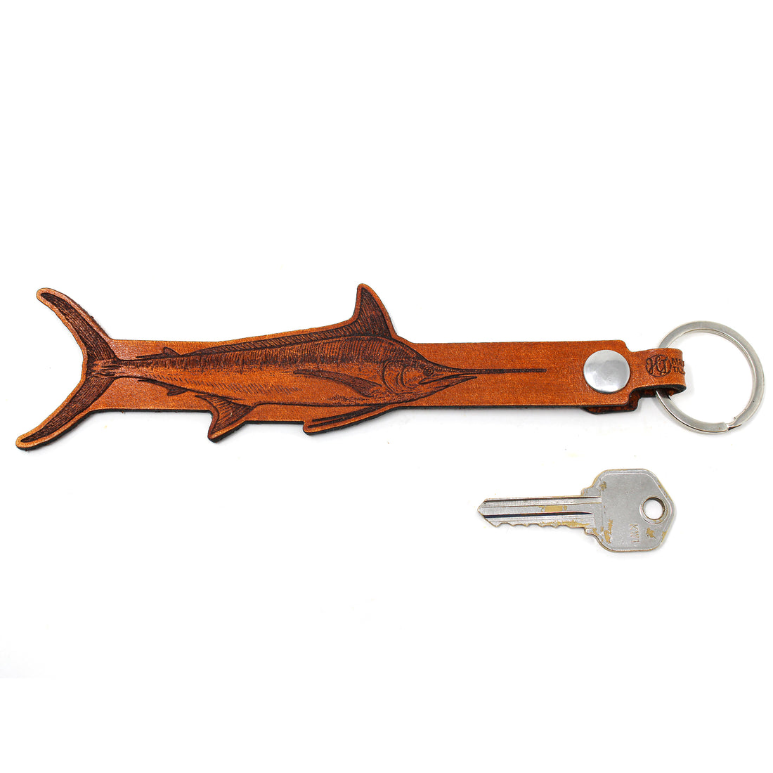 Llavero 100% Cuero. Diseños ilustrados grabados con láser inspirados en la pesca con tratamientos artesanales...