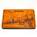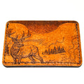 Teñido a mano. Mano angustiada. Cada billetera es única a su manera. ¡Un gran aspecto robusto! Usando una de las escenas ilustradas de Matt Herman de un gran dólar y dos ciervas... Equilibrada con un elemento simple de estilo grabado de rifle.