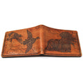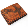 Teñido a mano. Mano angustiada. Cada billetera es única a su manera. ¡Un gran aspecto robusto! Usando uno de los ánades reales ilustrados por Matt Herman volando en un lado con el laboratorio que ha recuperado un ánade real en el otro lado.