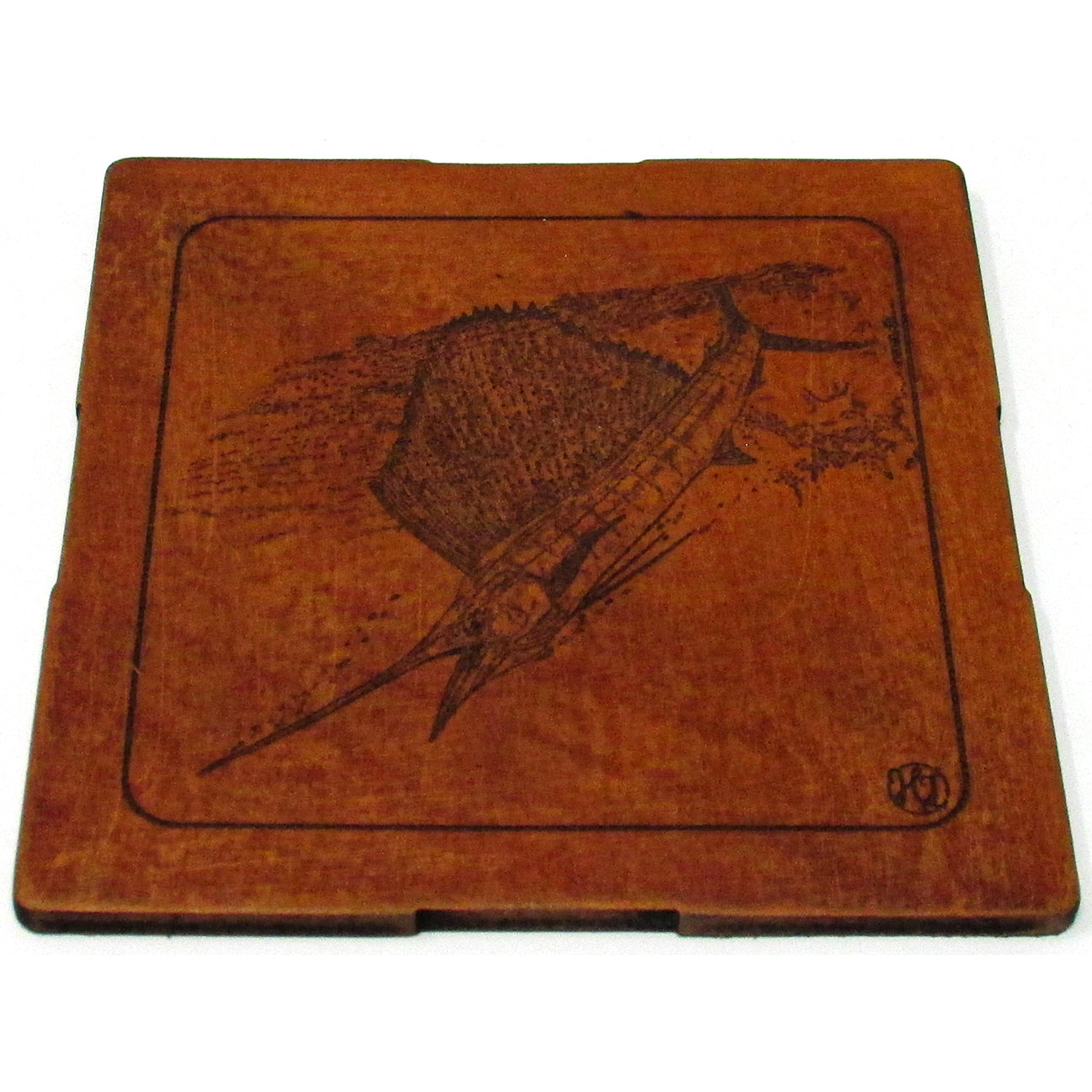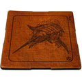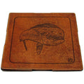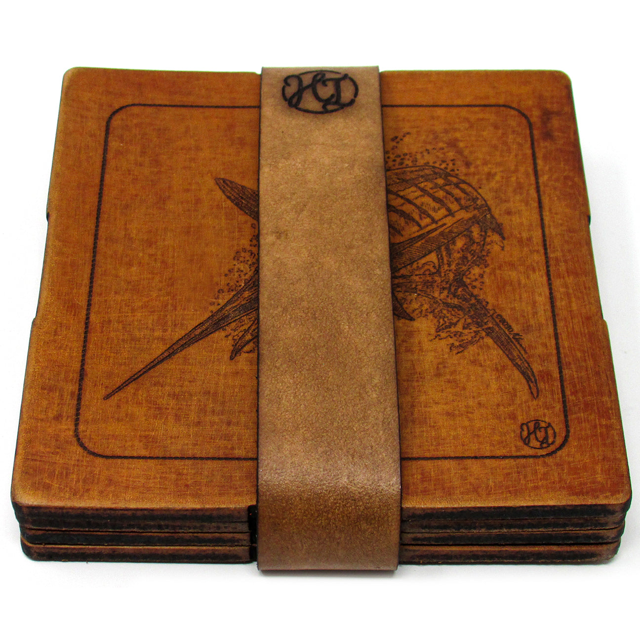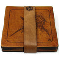 7-9 onzas. Posavasos con marco cuadrado 100% piel. Ilustraciones originales de Matt Herman. Ahora disponible para usted en esta línea de posavasos de alta gama. Cada posavasos está hecho a mano por artesanos, ricamente teñidos, desgastados y triplemente acondicionados. Los juegos incluyen 4 diseños. Cada juego se completa con una correa de cuero con broche para mantenerlos en su lugar cuando los guarda o viaja.