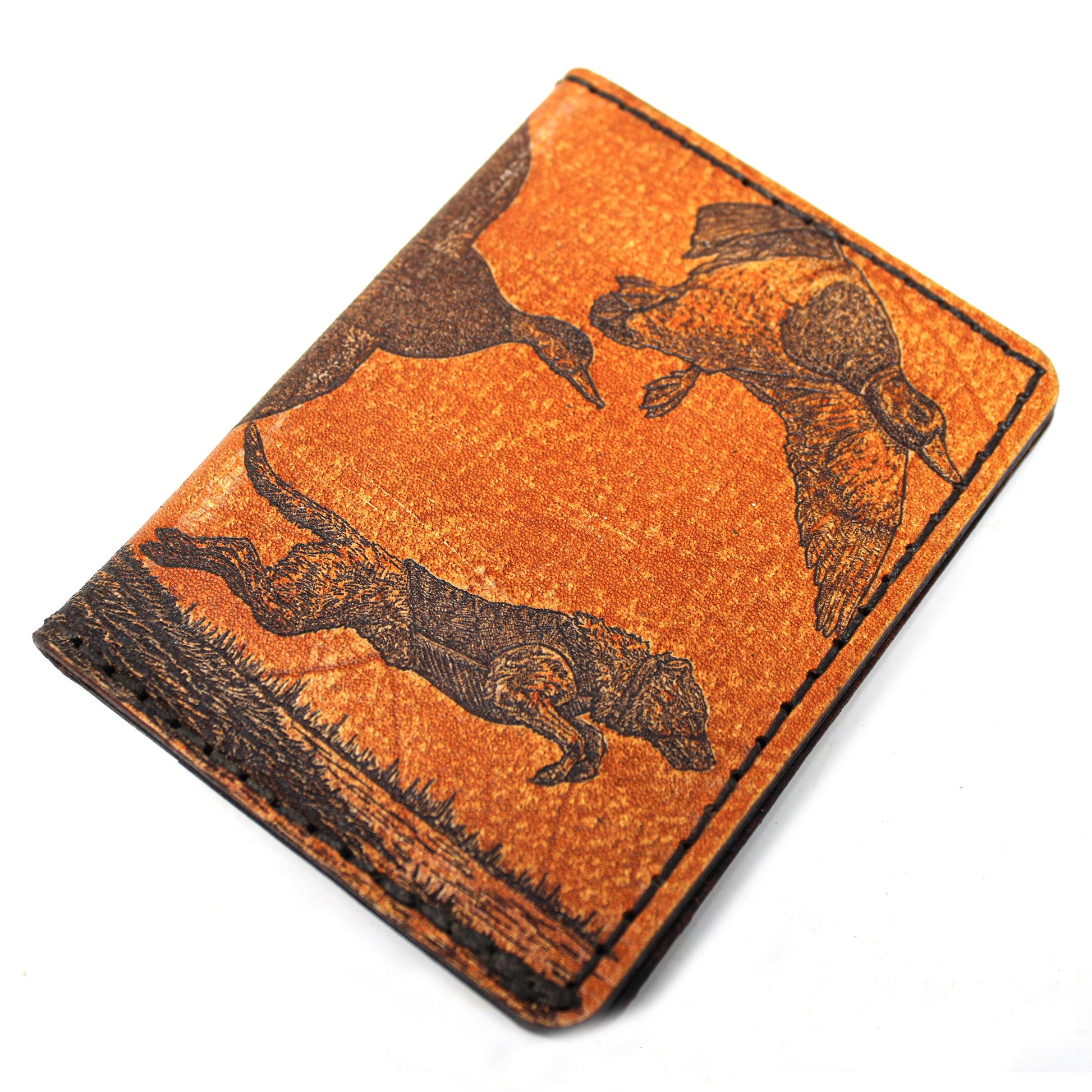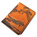 Teñido a mano. Mano angustiada. Cada billetera es única a su manera. ¡Un gran aspecto robusto! Usando uno de los Mallard ilustrados de Matt Herman... Equilibrado con un elemento simple de estilo grabado de rifle.