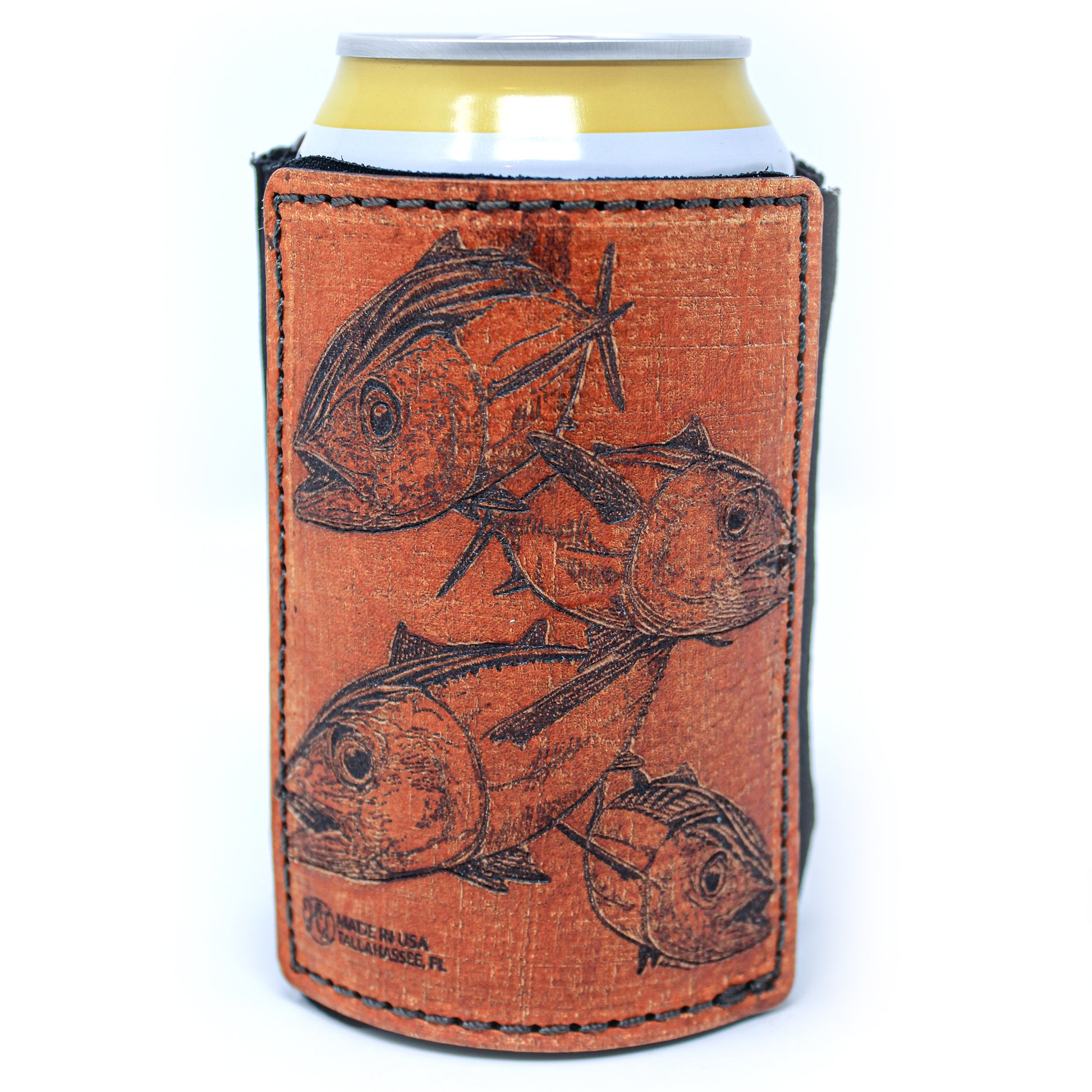 Esta funda para bebida presenta la ilustración de Matt Herman de un banco de atún de aleta negra. ¡Puedes encontrar este diseño de camiseta en STANZ Fishing! Fabricado con orgullo en Tallahassee, FL, EE. UU.
