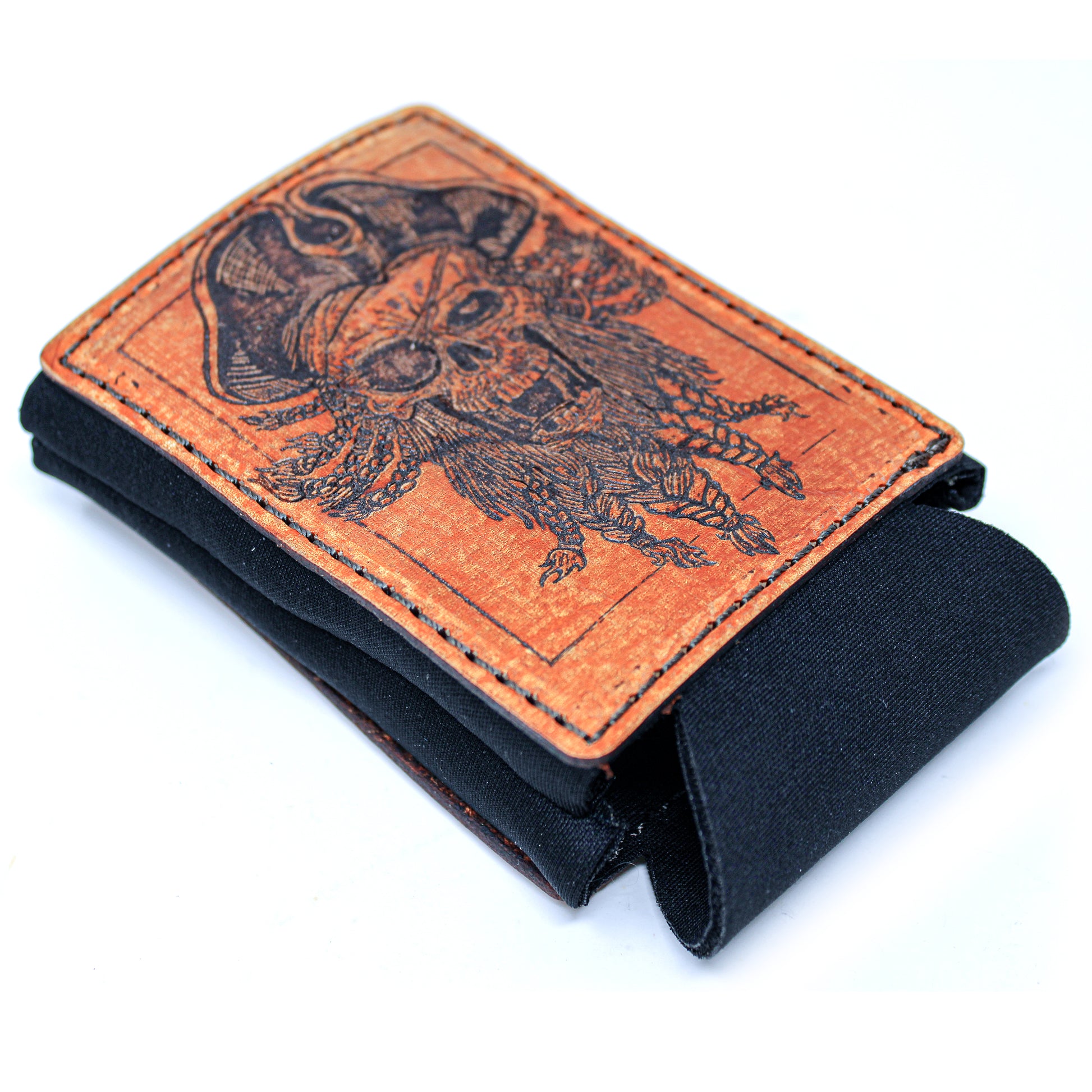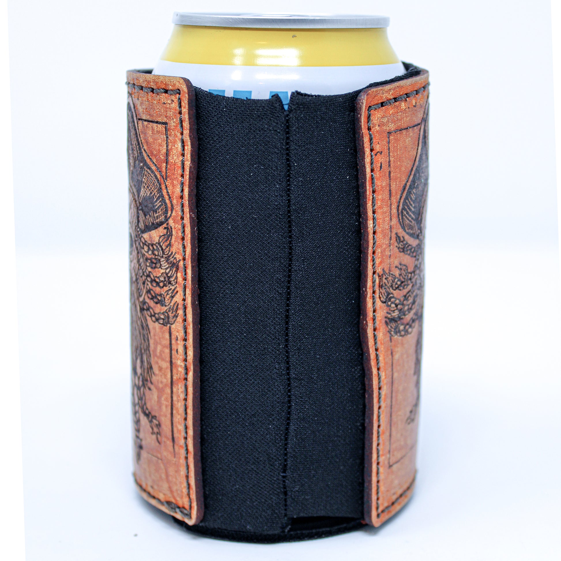 Esta es una de nuestras mejores series de fundas para bebidas con parches de cuero grandes. Totalmente construido desde cero. Usando tela de neopreno gruesa como forro interior para estiramiento con memoria y luego enmarcando con 2 parches decorativos de cuero grandes de 5-7 oz en ambos lados para agregar soporte. Teñido a mano y angustiado a mano haciendo que cada uno sea único. Una excelente apariencia general que no solo será un excelente identificador de su bebida, sino también un excelente iniciador de conversación.