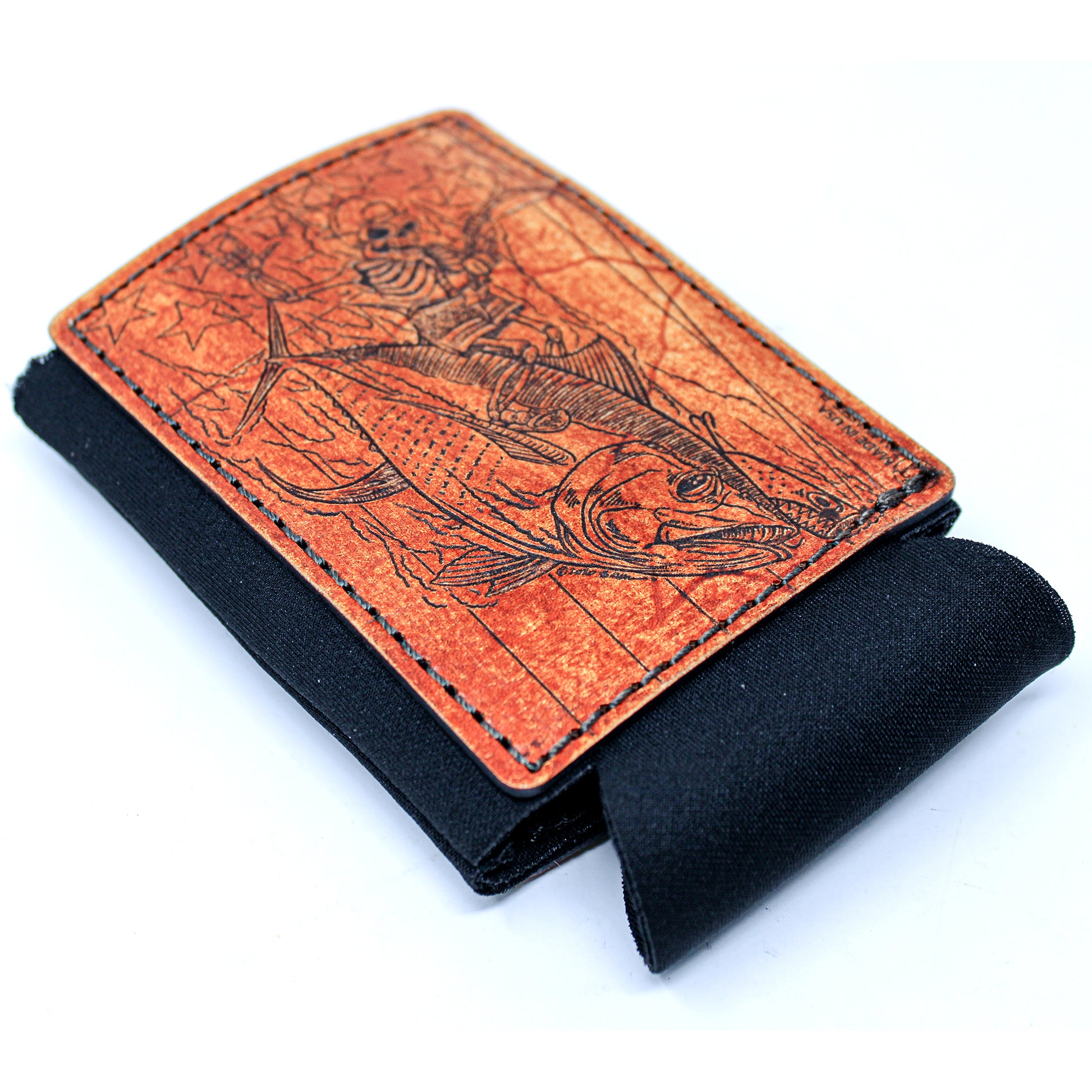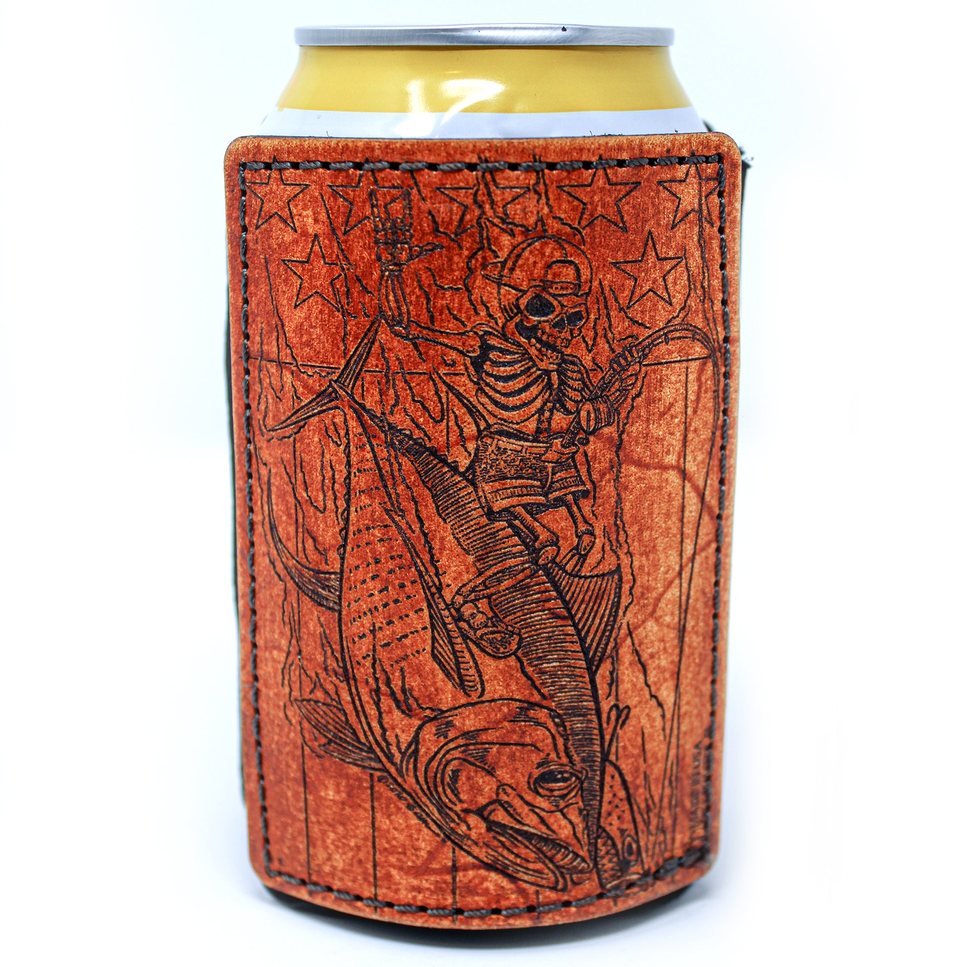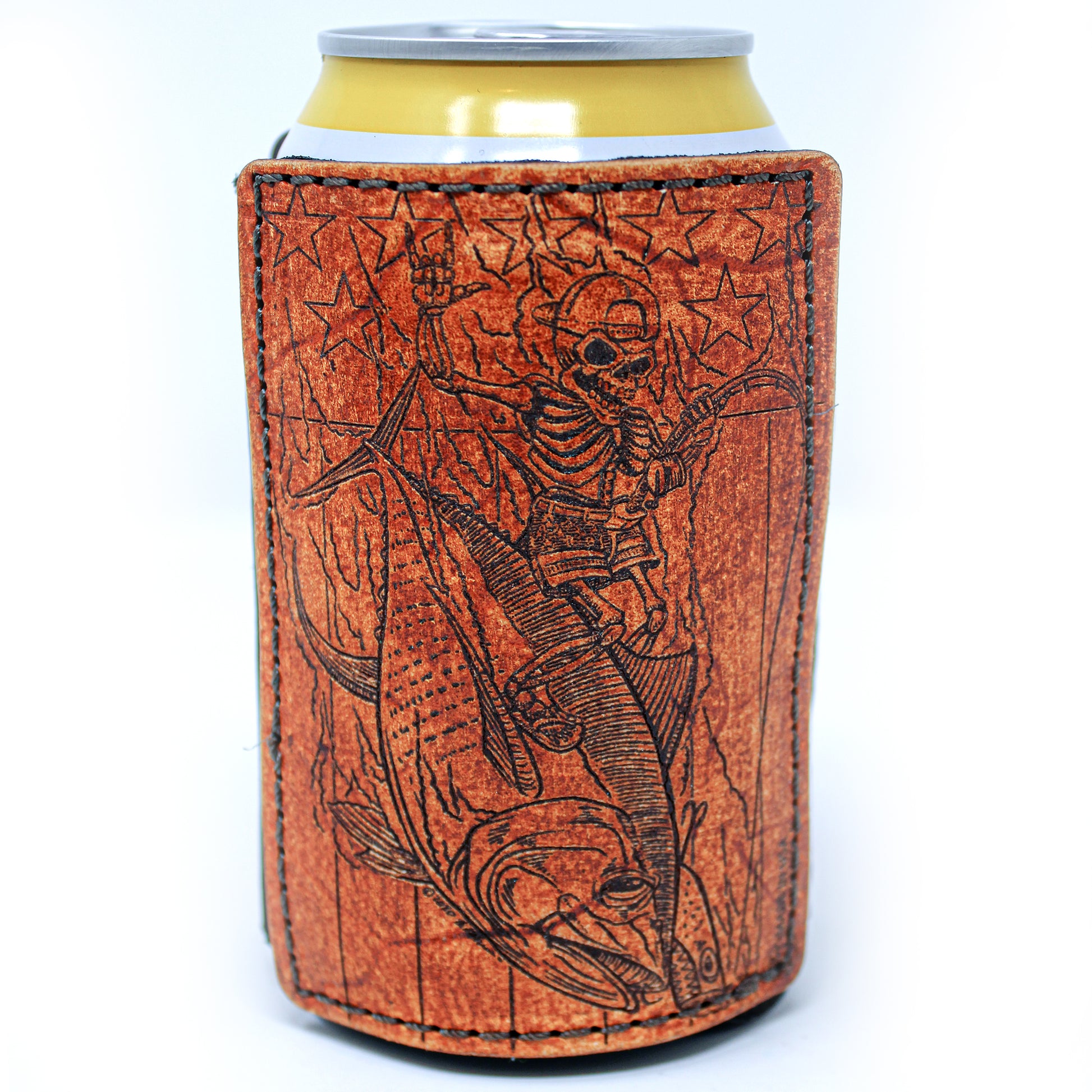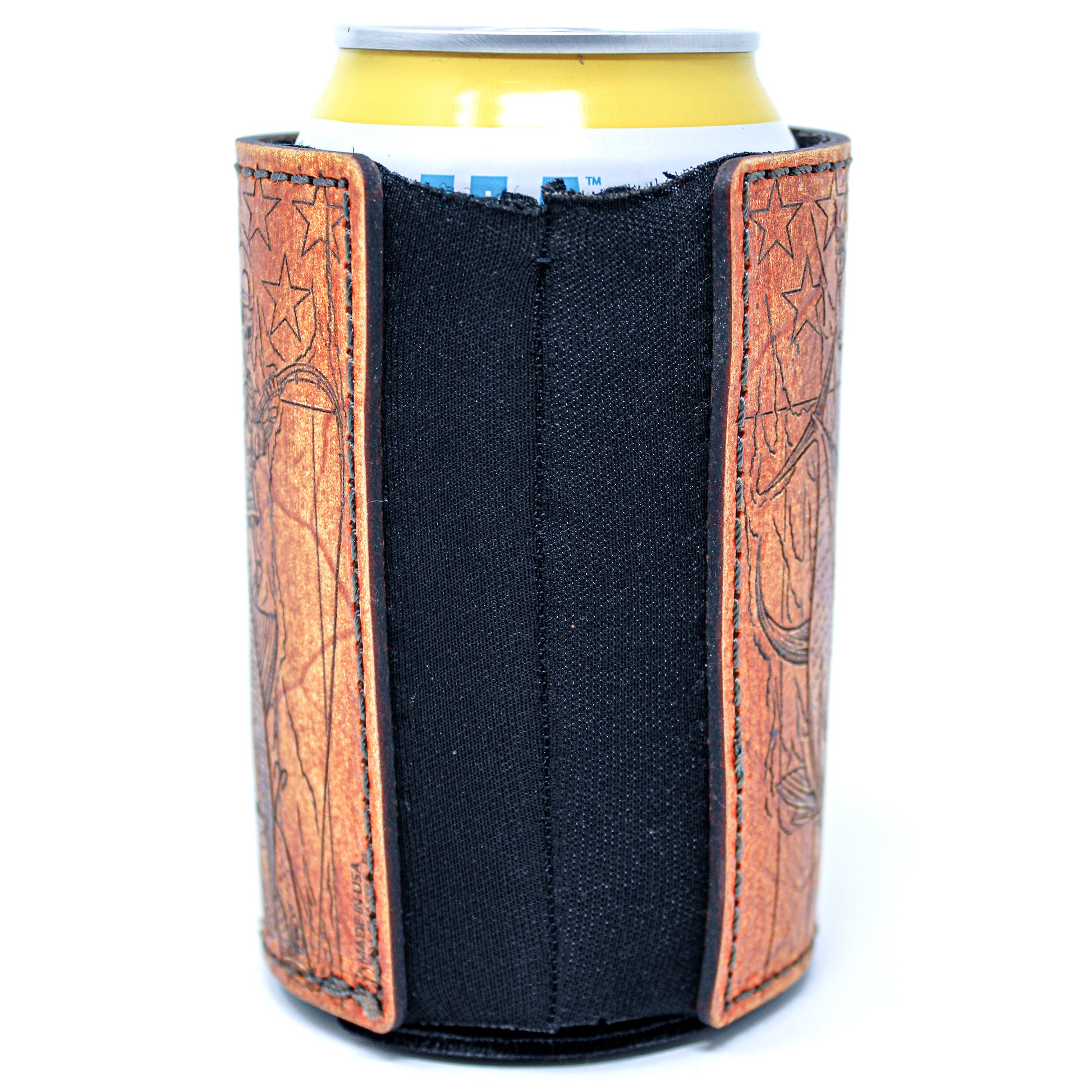 Esta es una de nuestras mejores series de fundas para bebidas con parches de cuero grandes. Totalmente construido desde cero. Usando tela de neopreno gruesa como forro interior para estirar la memoria y luego enmarcando con 2 parches decorativos de cuero grandes de 5-7 oz en ambos lados para agregar soporte. Teñido a mano y angustiado a mano haciendo que cada uno sea único. Una excelente apariencia general que no solo será un excelente identificador de su bebida, sino también un excelente iniciador de conversación.