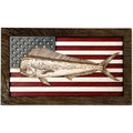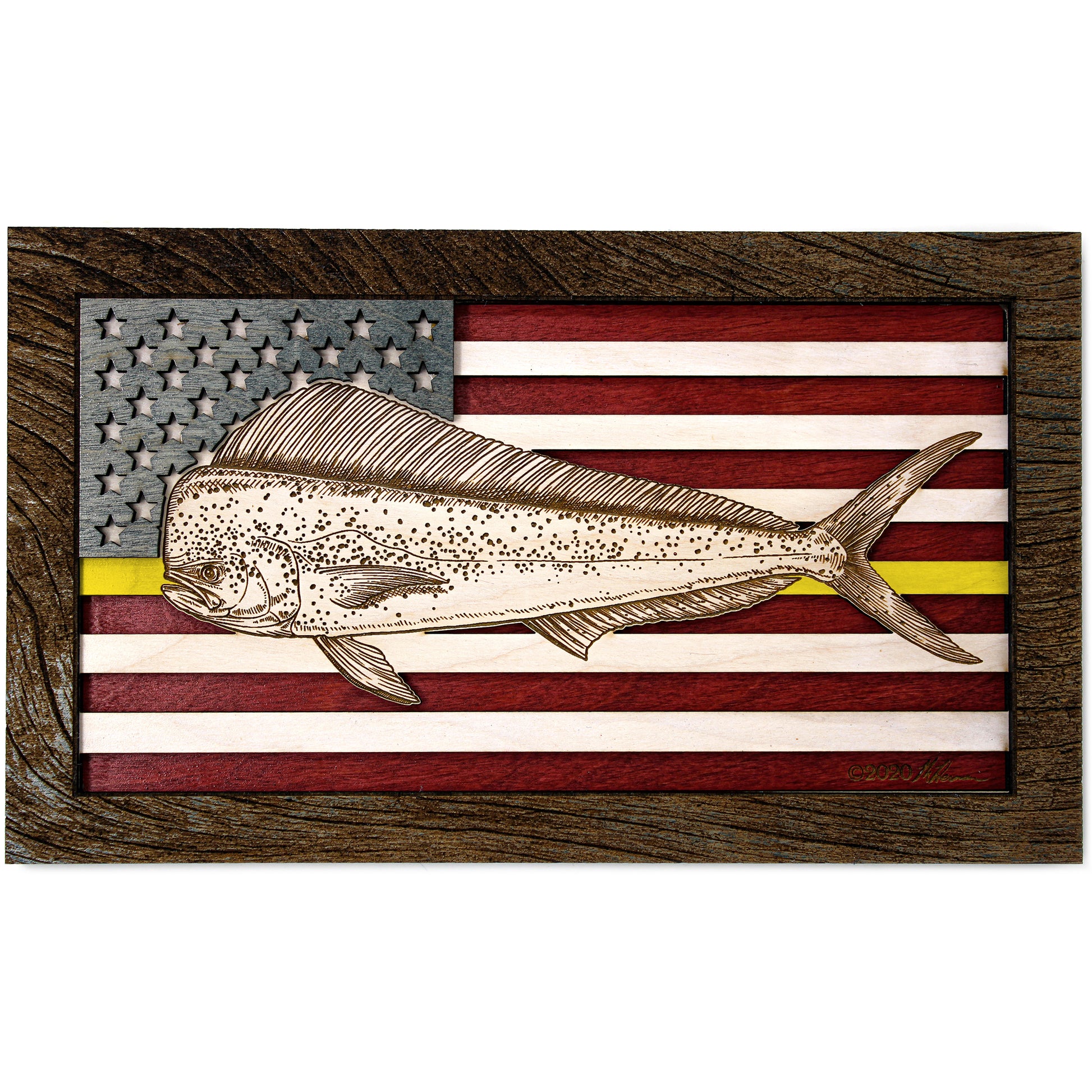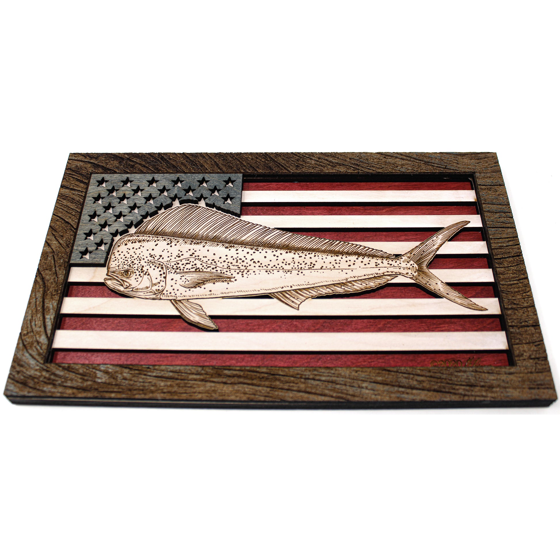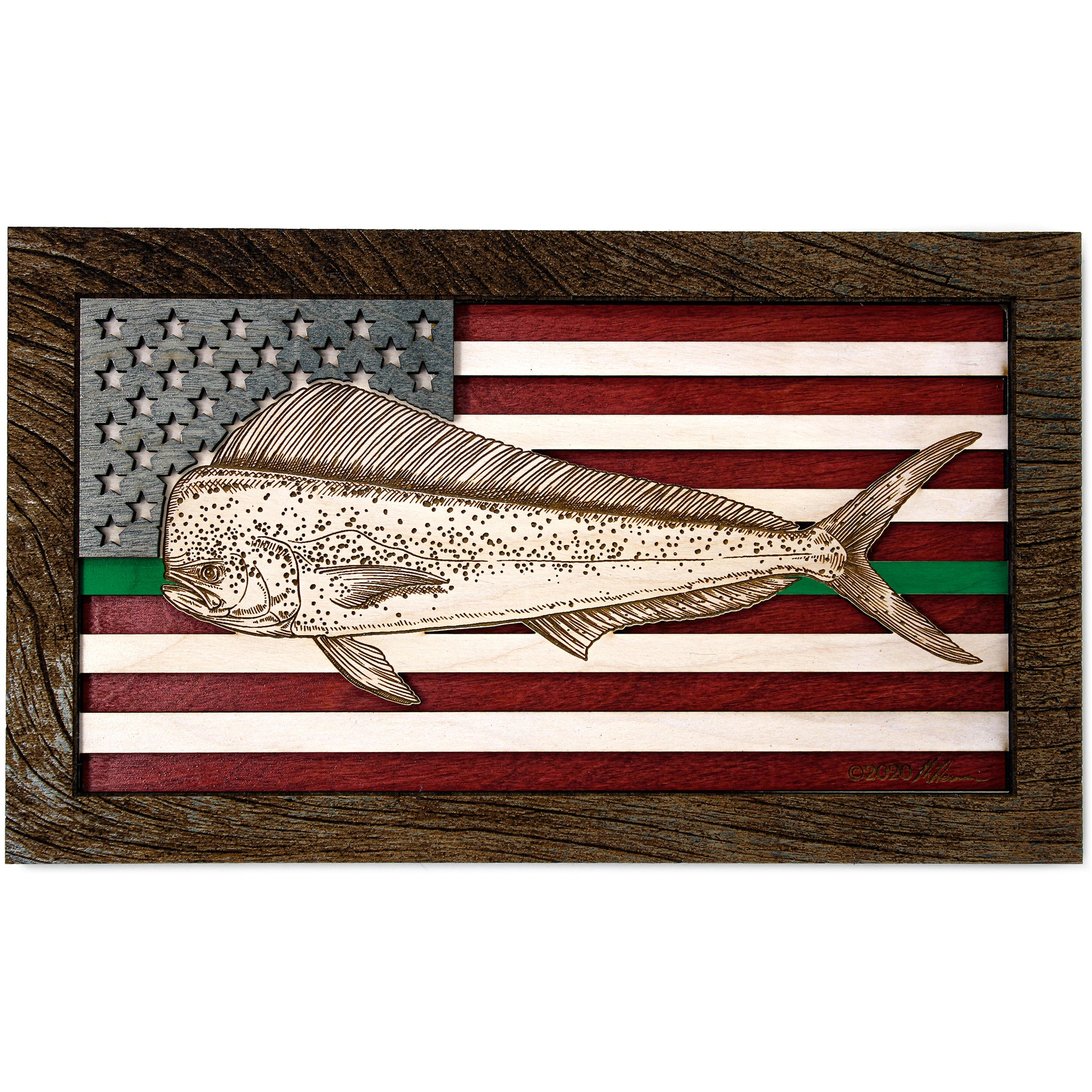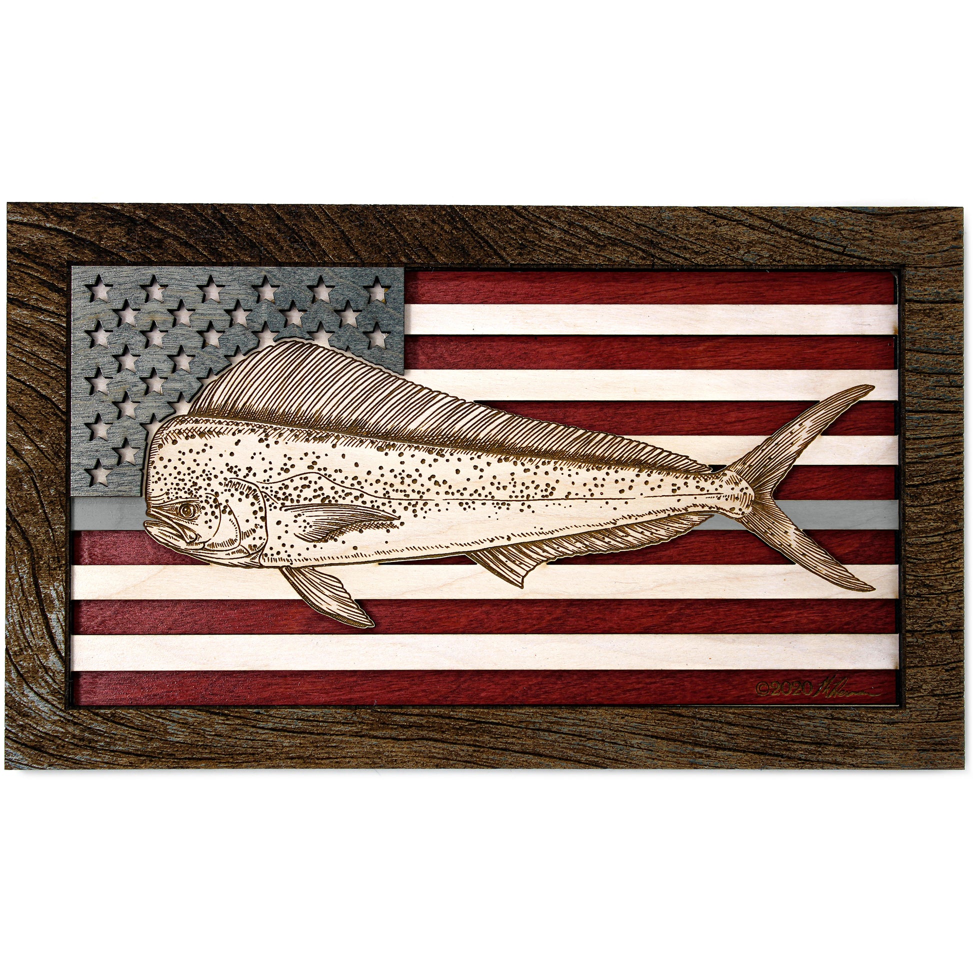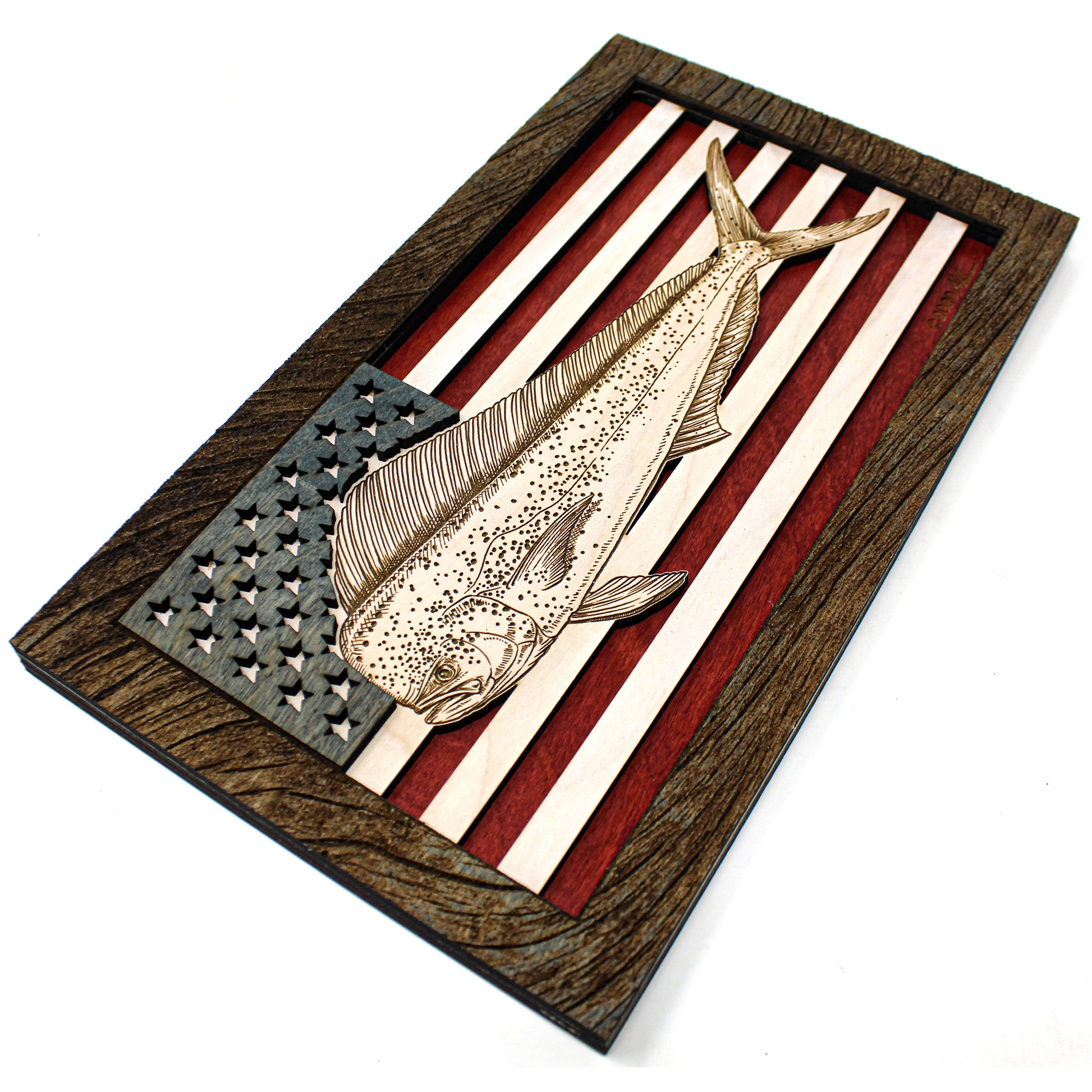Esta decoración de arte de pared de madera en 3D hecha a medida se creó utilizando una de las interpretaciones ilustradas del estudio científico de Matt Herman de un Mahi como punto focal con la bandera estadounidense como telón de fondo. Luego, el arte se programa mediante complejos procesos de grabado láser para garantizar detalles de alta calidad. El marco del borde de madera flotante, muy desgastado, se hizo a medida para esta serie. Cada pieza está diseñada con 3 capas de madera enchapada de abedul que muestran colores teñidos a mano de rojo granero, blanco lavado y tonos azul marino desgastados, lo que hace que cada una sea única a su manera . Orgullosamente hecho en Tallahassee, FL. EE.UU