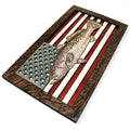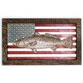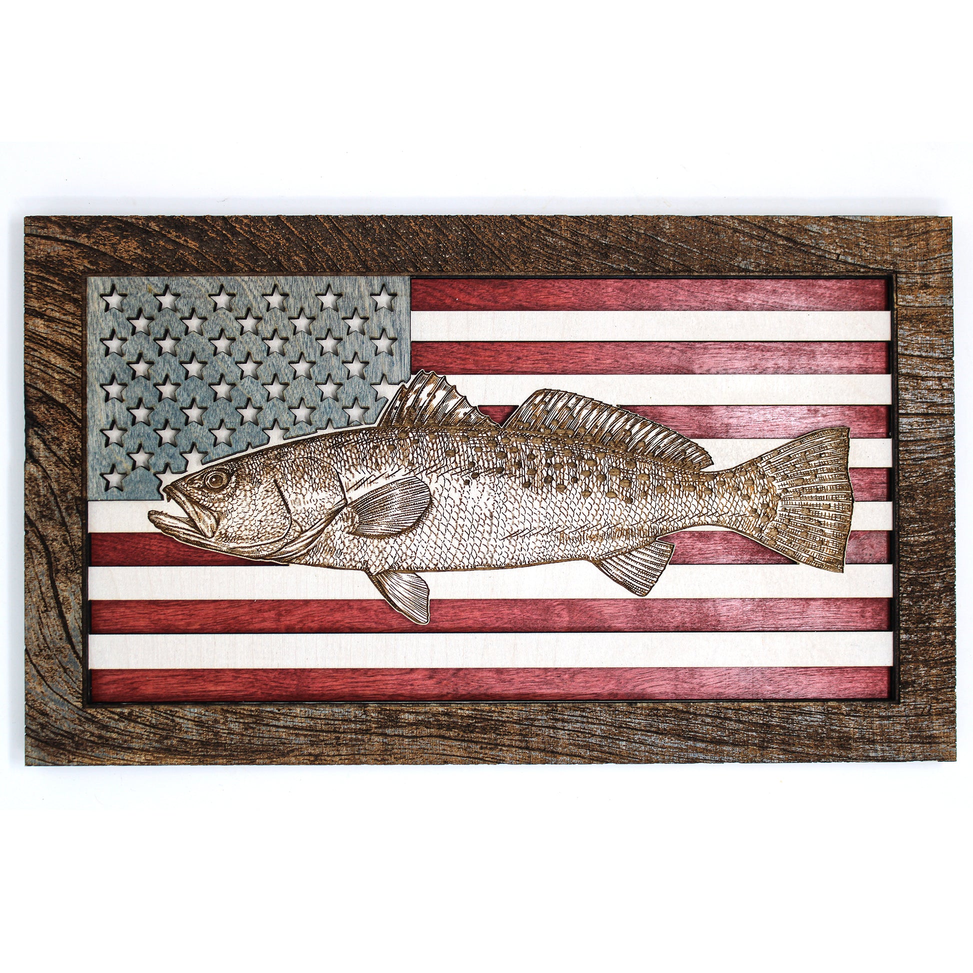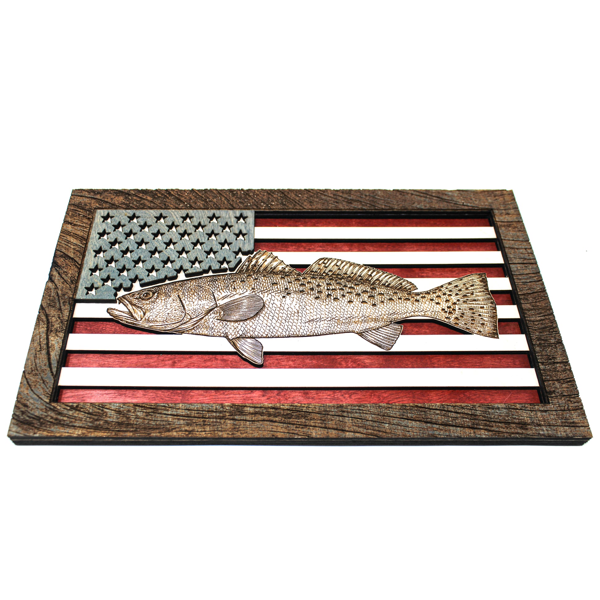 Esta decoración de arte de pared de madera en 3D hecha a medida se creó utilizando una de las interpretaciones ilustradas del estudio científico de Matt Herman de una trucha marina moteada como punto focal con la bandera estadounidense como telón de fondo. También se agregó el color de línea delgada en la bandera como una opción para representar a los héroes y trabajadores de nuestros países. Luego, el arte se programa mediante complejos procesos de grabado láser para garantizar detalles de alta calidad. El marco del borde de madera flotante, muy desgastado, se hizo a medida para esta serie. Cada pieza está diseñada con 3 capas de madera enchapada de abedul que muestran colores teñidos a mano de rojo granero, blanco lavado y tonos grises desgastados, lo que hace que cada una sea única a su manera . Orgullosamente hecho en Tallahassee, FL. EE.UU