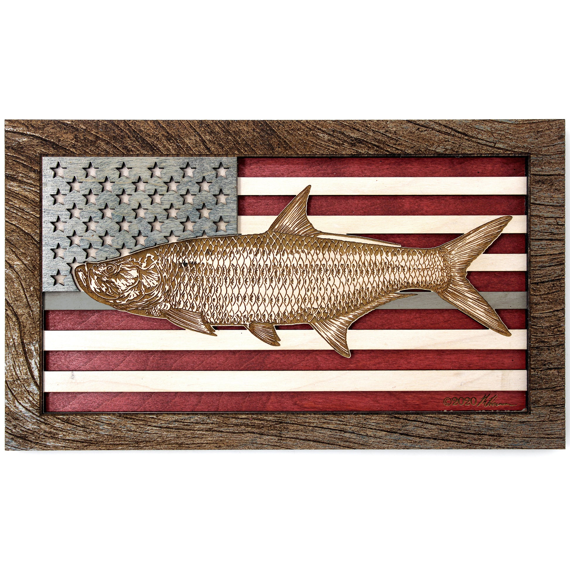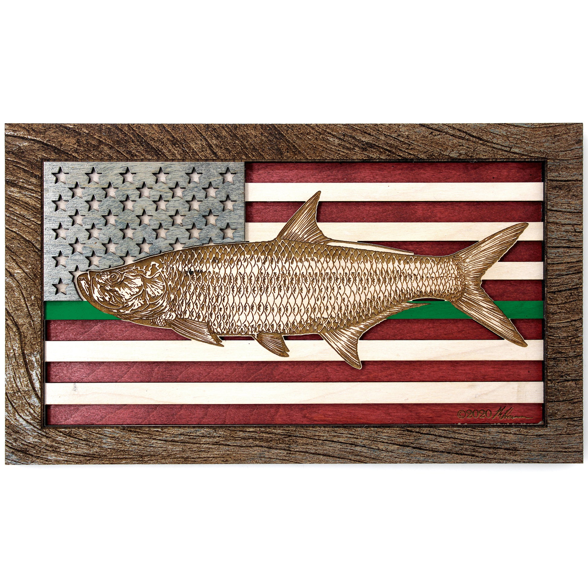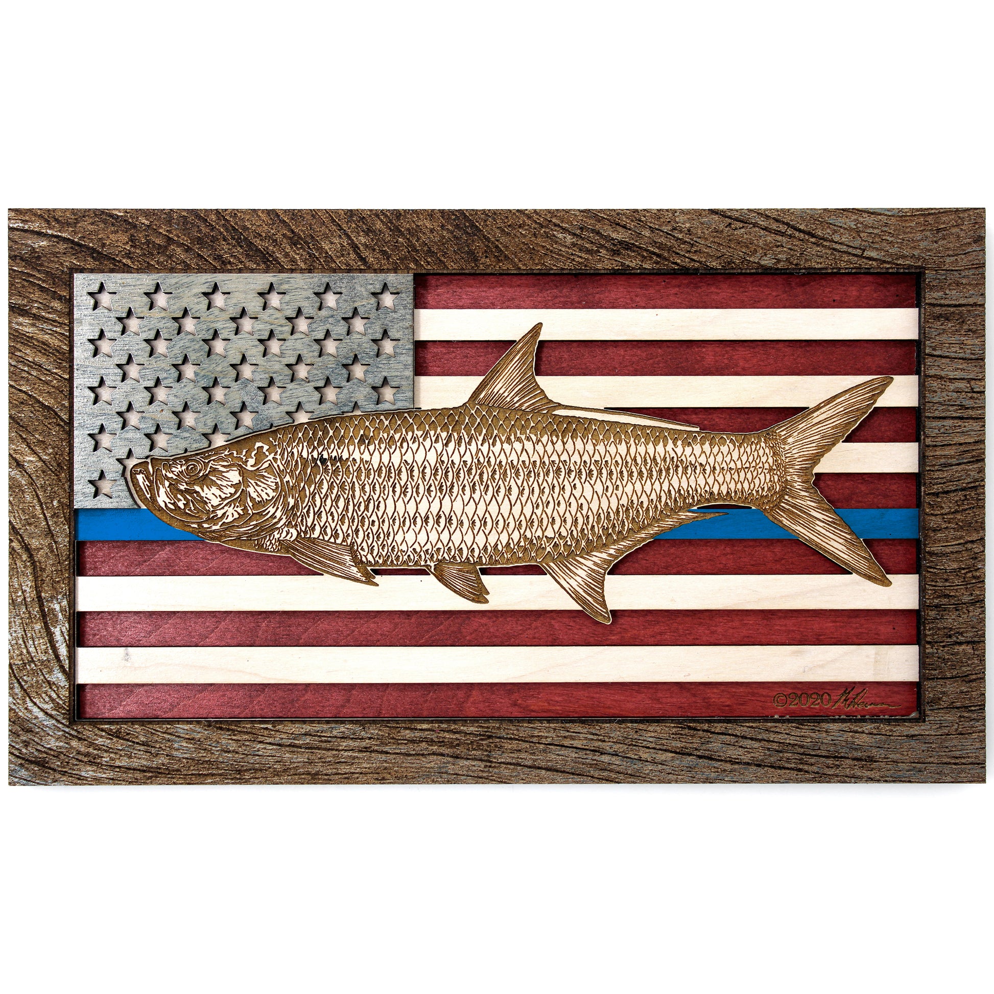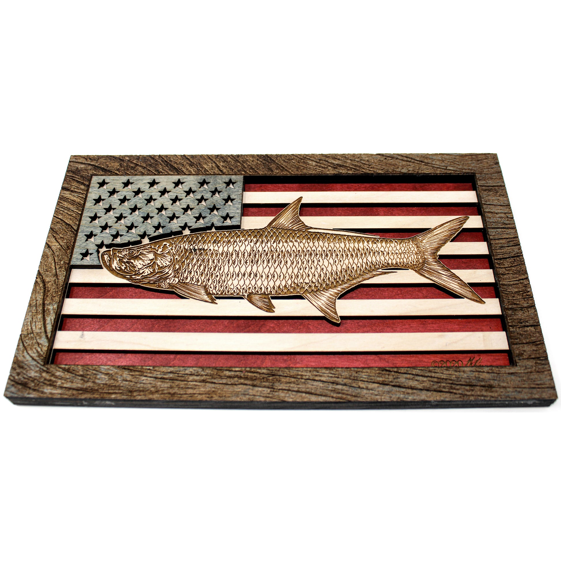 Esta decoración de arte de pared de madera en 3D hecha a medida se creó utilizando una de las interpretaciones ilustradas del estudio científico de Matt Herman de un Tarpon como punto focal con la bandera estadounidense como telón de fondo. Luego, el arte se programa mediante complejos procesos de grabado láser para garantizar detalles de alta calidad. El marco del borde de madera flotante, muy desgastado, se hizo a medida para esta serie. Cada pieza está diseñada con 3 capas de madera enchapada de abedul que muestran colores teñidos a mano de rojo granero, blanco lavado y tonos grises desgastados, lo que hace que cada una sea única a su manera . Orgullosamente hecho en Tallahassee, FL. EE.UU