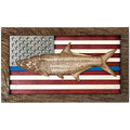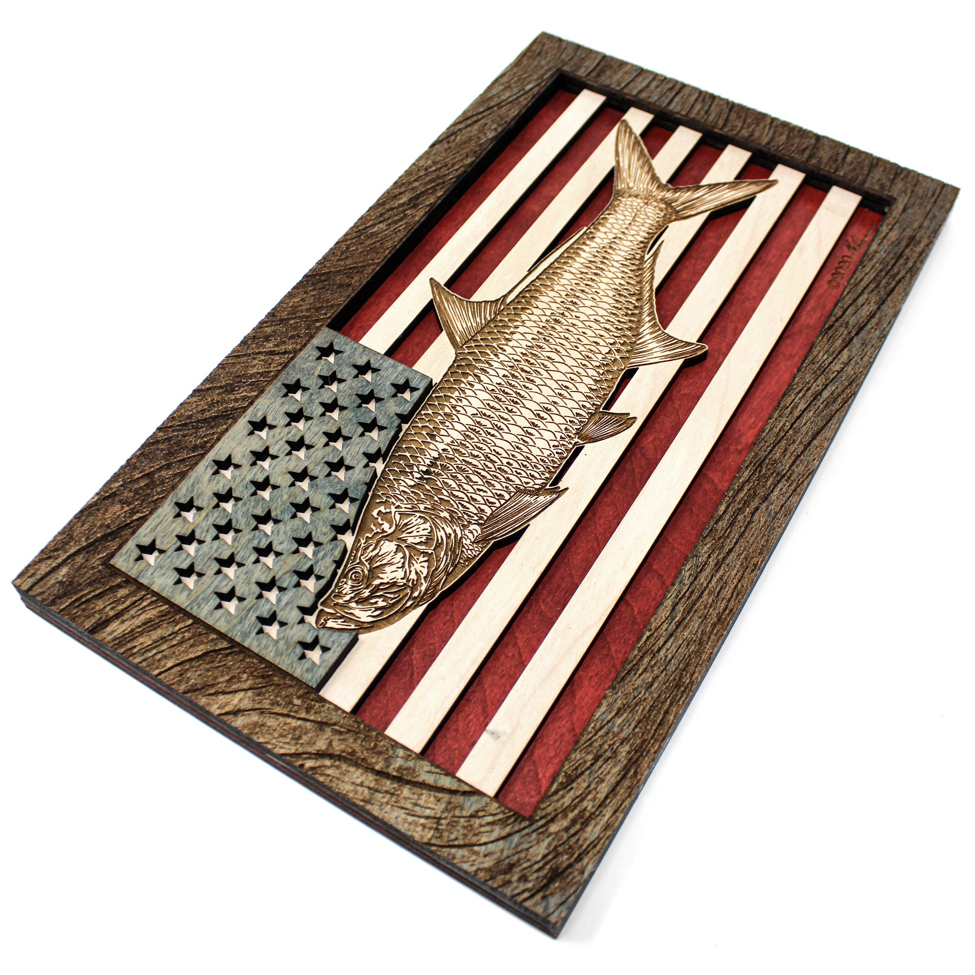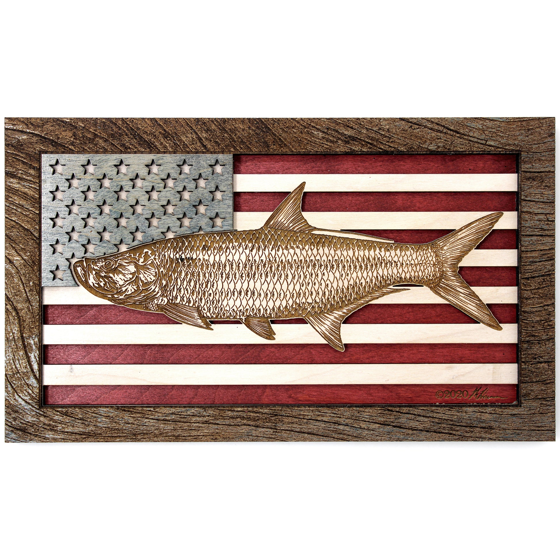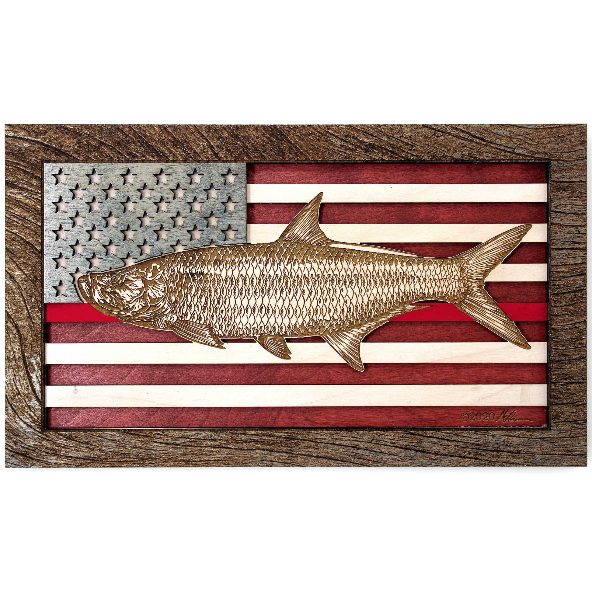 Esta decoración de arte de pared de madera en 3D hecha a medida se creó utilizando una de las interpretaciones ilustradas del estudio científico de Matt Herman de un Tarpon como punto focal con la bandera estadounidense como telón de fondo. Luego, el arte se programa mediante complejos procesos de grabado láser para garantizar detalles de alta calidad. El marco del borde de madera flotante, muy desgastado, se hizo a medida para esta serie. Cada pieza está diseñada con 3 capas de madera enchapada de abedul que muestran colores teñidos a mano de rojo granero, blanco lavado y tonos grises desgastados, lo que hace que cada una sea única a su manera . Orgullosamente hecho en Tallahassee, FL. EE.UU