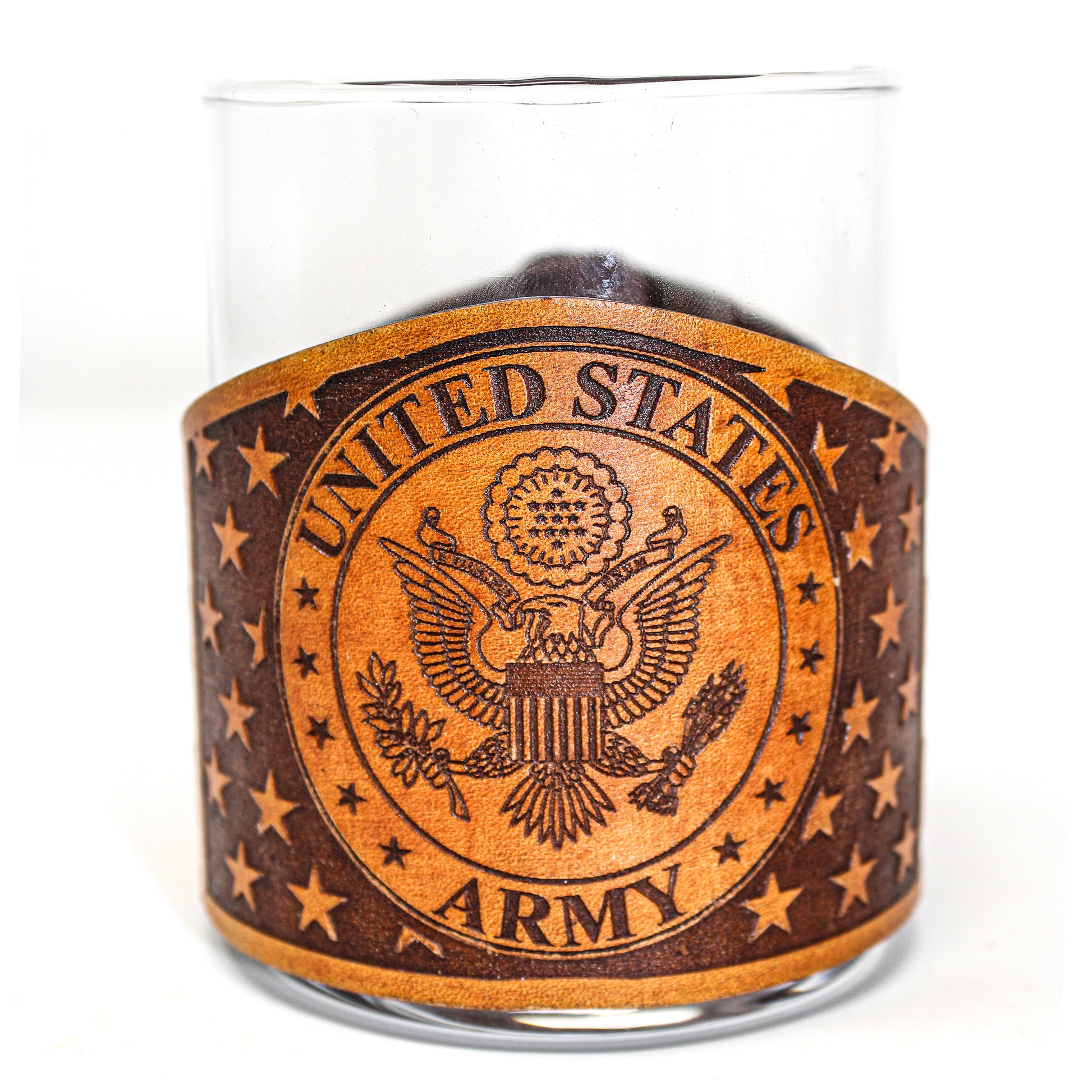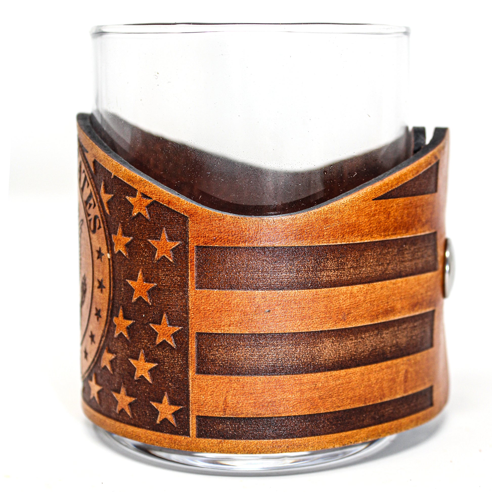 Nuestra serie Military consta de una gran variedad de wraps americanos con vasos bajos de 11 oz. Este estilo está decorado con el sello ARMY colocado sobre la bandera estadounidense. Utiliza cuero grueso de 7 a 10 oz con grabado láser programado de precisión y se sujeta con un resistente broche de acero inoxidable de grado marino. Este concepto de diseño hace que las envolturas de cuero sean fáciles de desabrochar para fines de limpieza o simplemente para guardarlas y cambiarlas por otro estilo de envoltura. Todo el cuero está teñido, desgastado y acabado a mano, lo que le da a cada pieza su propio aspecto único.