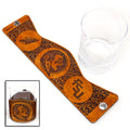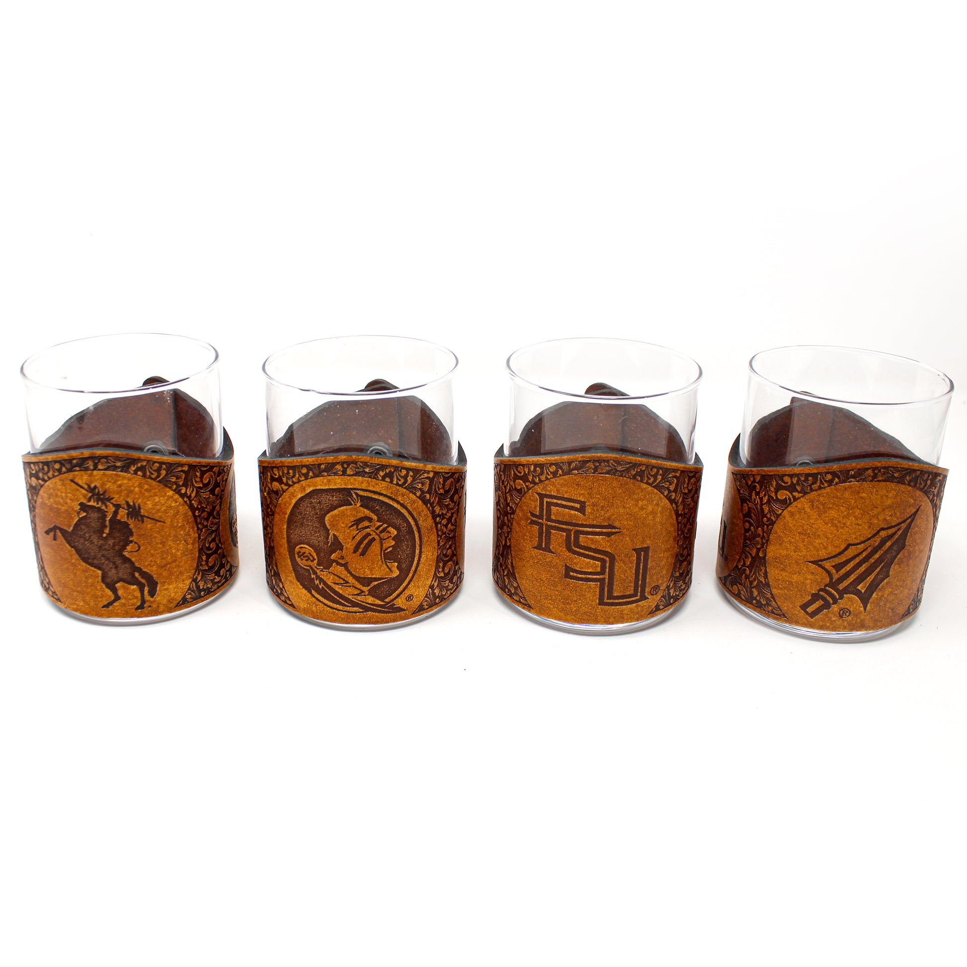 Nuestro juego FSU Classic consta de una gran variedad de envoltorios de la marca FSU con vasos bajos de 11 oz. Este juego está decorado con elementos del estado de Florida en 3 lados de cada vaso enmarcados con un patrón clásico de grabados de rifle. Utiliza cuero grueso de 7 a 10 oz con grabado láser programado de precisión y se sujeta con un resistente broche de acero inoxidable de grado marino. Este concepto de diseño hace que las envolturas de cuero sean fáciles de desabrochar para fines de limpieza o simplemente para guardarlas y cambiarlas por otro estilo de envoltura. Todo el cuero está teñido, desgastado y acabado a mano, lo que le da a cada pieza su propio aspecto único.