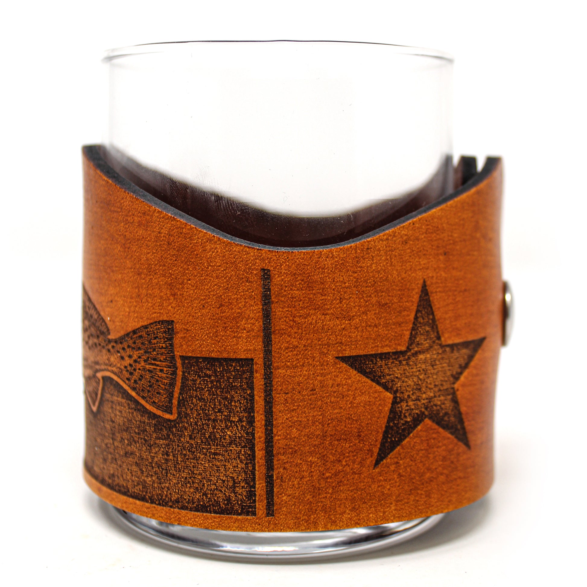 Nuestra serie Fish Engraver consta de una gran variedad de especies de peces envueltas con vasos bajos de 11 oz. Este estilo está decorado con la interpretación del estudio científico ilustrado de Redfish y el icónico Crescent Moon Palmetto. Luego enmarcado con un patrón clásico de grabadores de rifle. Utiliza cuero grueso de 7 a 10 oz con grabado láser programado de precisión y se sujeta con un resistente broche de acero inoxidable de grado marino. Este concepto de diseño hace que las envolturas de cuero sean fáciles de desabrochar para fines de limpieza o simplemente para guardarlas y cambiarlas por otro estilo de envoltura. Todo el cuero está teñido, desgastado y acabado a mano, lo que le da a cada pieza su propio aspecto único.