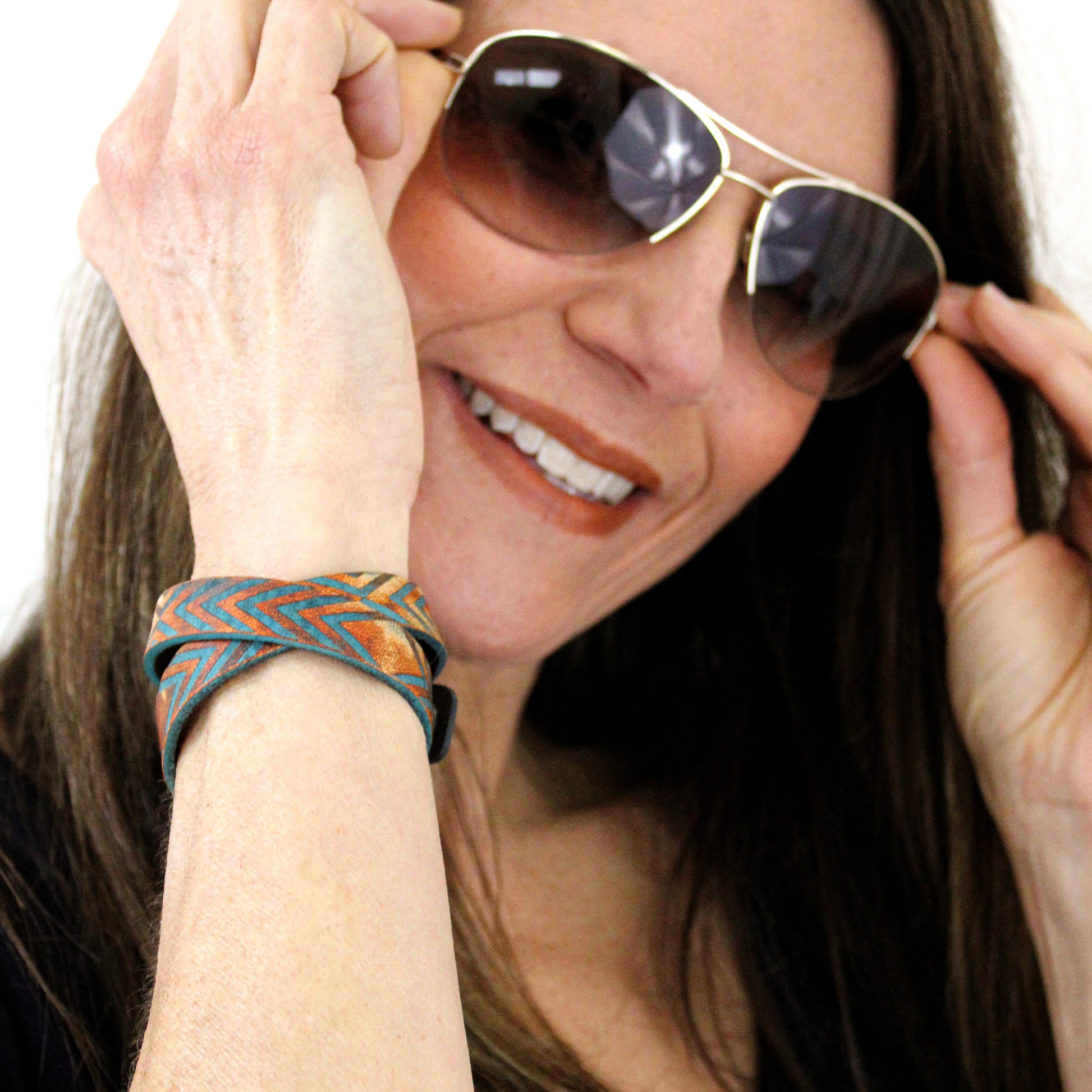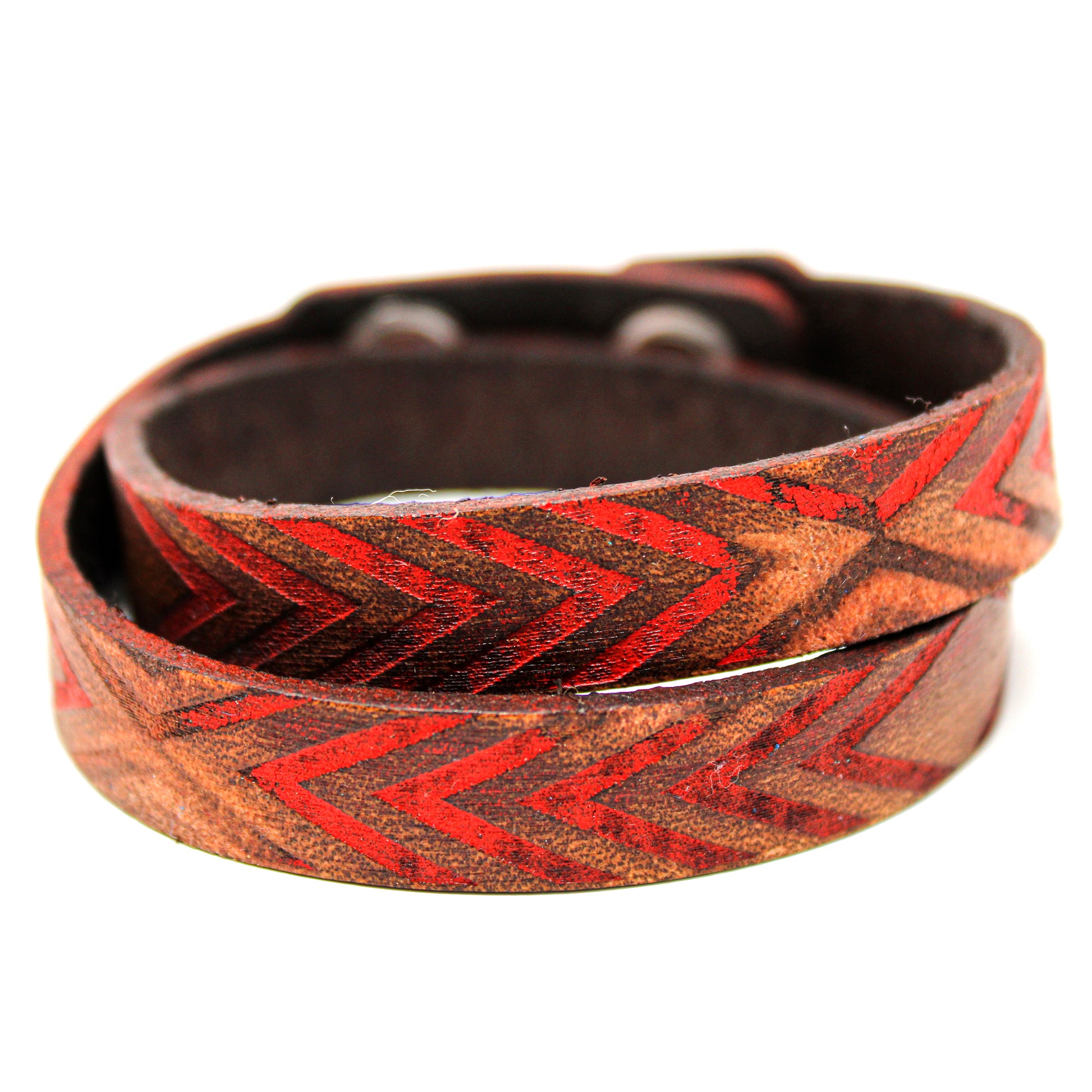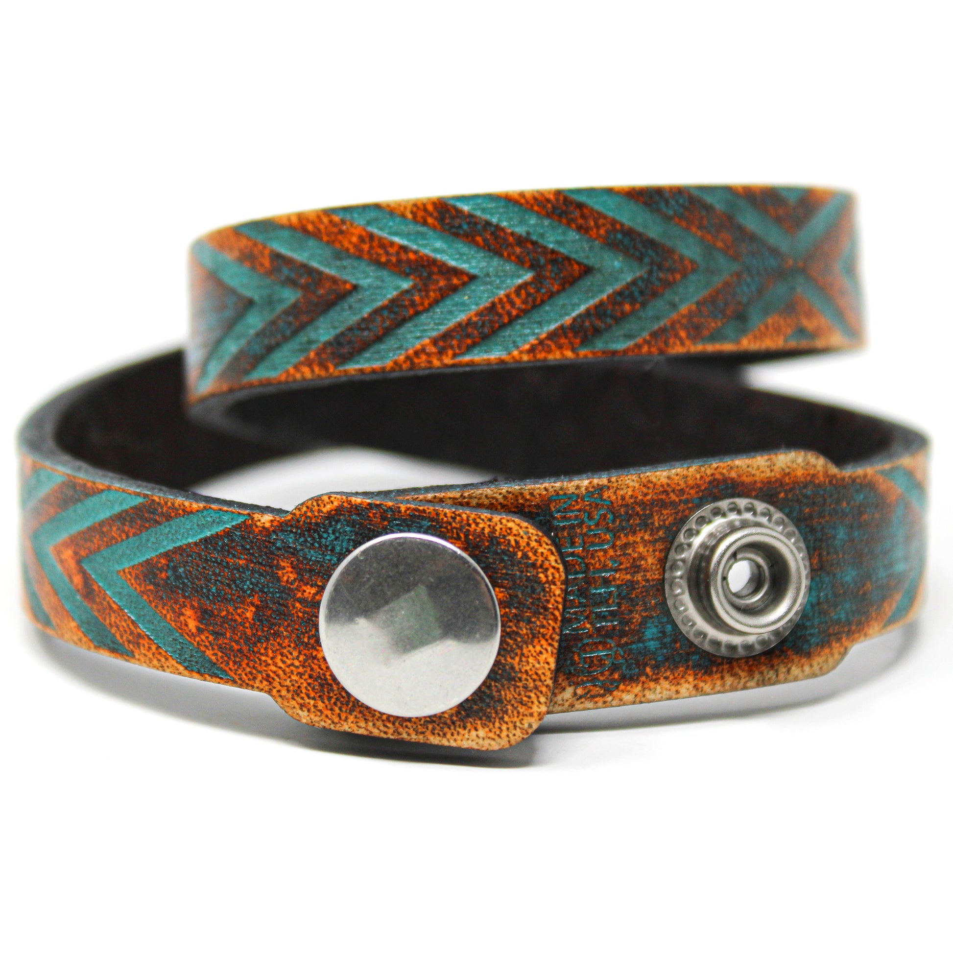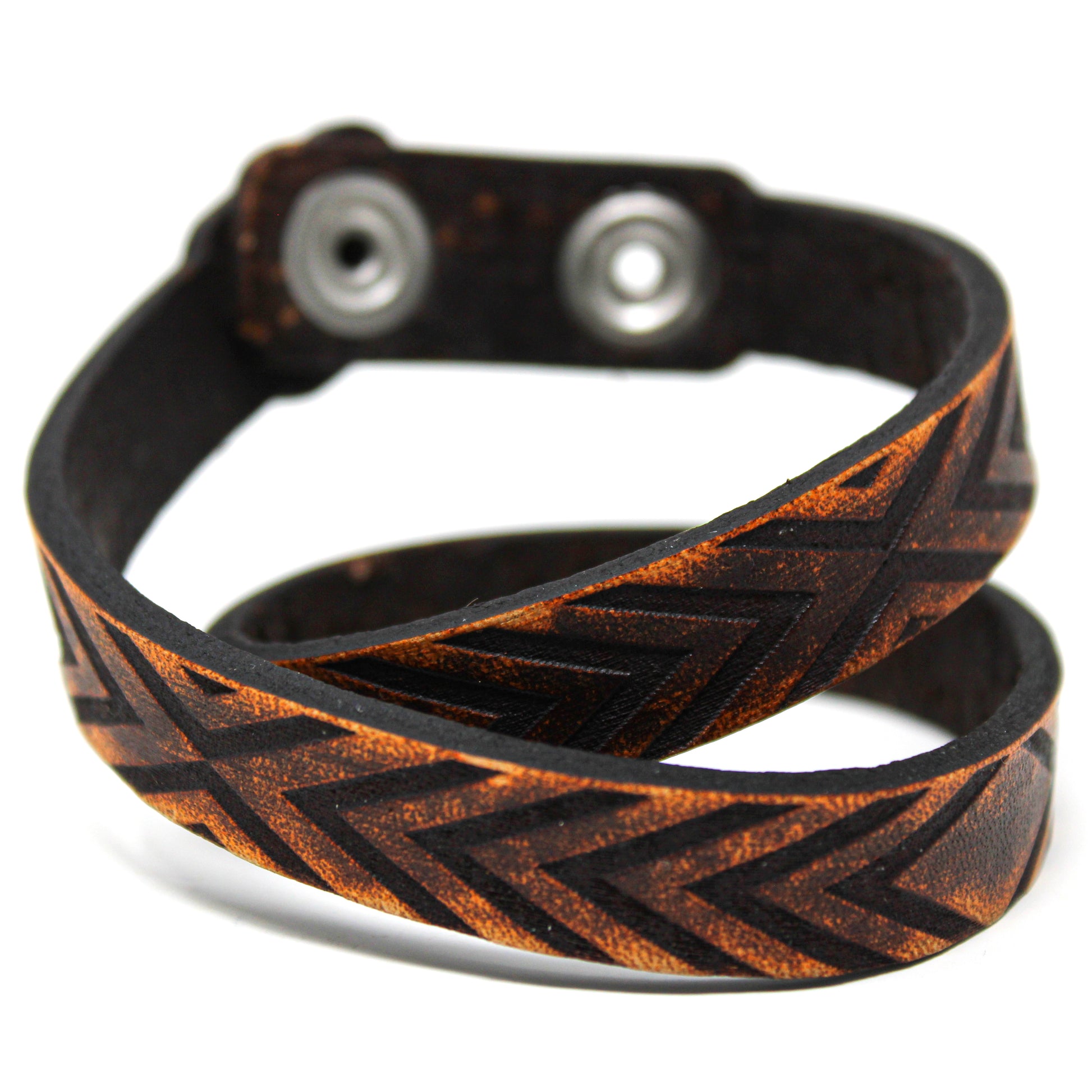 Diseño simple pero elegante con nuestro patrón reflectante tribal. Hecho de 100% cuero con un grosor estándar de 4 a 6 oz. Con broches de acero inoxidable para aquellos días de diversión en la playa bajo el sol. Fabricado con orgullo en Tallahassee, FL, EE. UU.