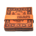 9-13oz. 100% leather square framed coasters. Original concepts by Matt Herman. Now available for you in this high end line of coasters. Each coaster is hand Artisan richly dyed, distressed, and triple conditioned. Sets include 4 designs. Each set is complete with a leather strap with snap to keep them in place when storing or on the go.