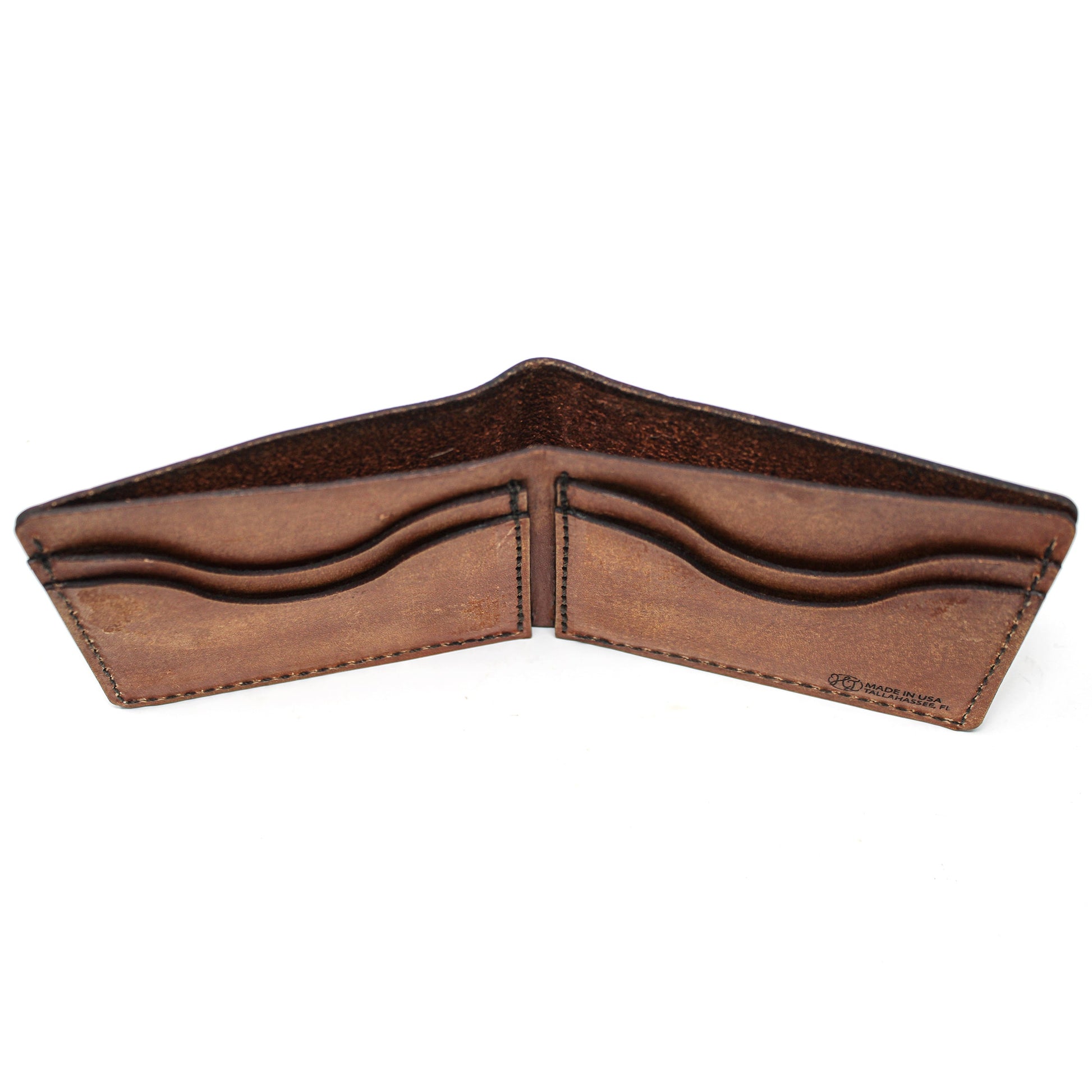 - Leather BiFold Wallet Folded Dimensions: 4.25 inches wide x 3.25 inches tall