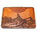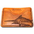 Hand stained. Hand distressed. Each wallet is unique in it's own way. A great rugged look! Using one of Matt Herman’s illustrated scene showing blue marlin jumping with a boat in the distance.. Balanced with a simple rifle engraving style element.