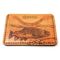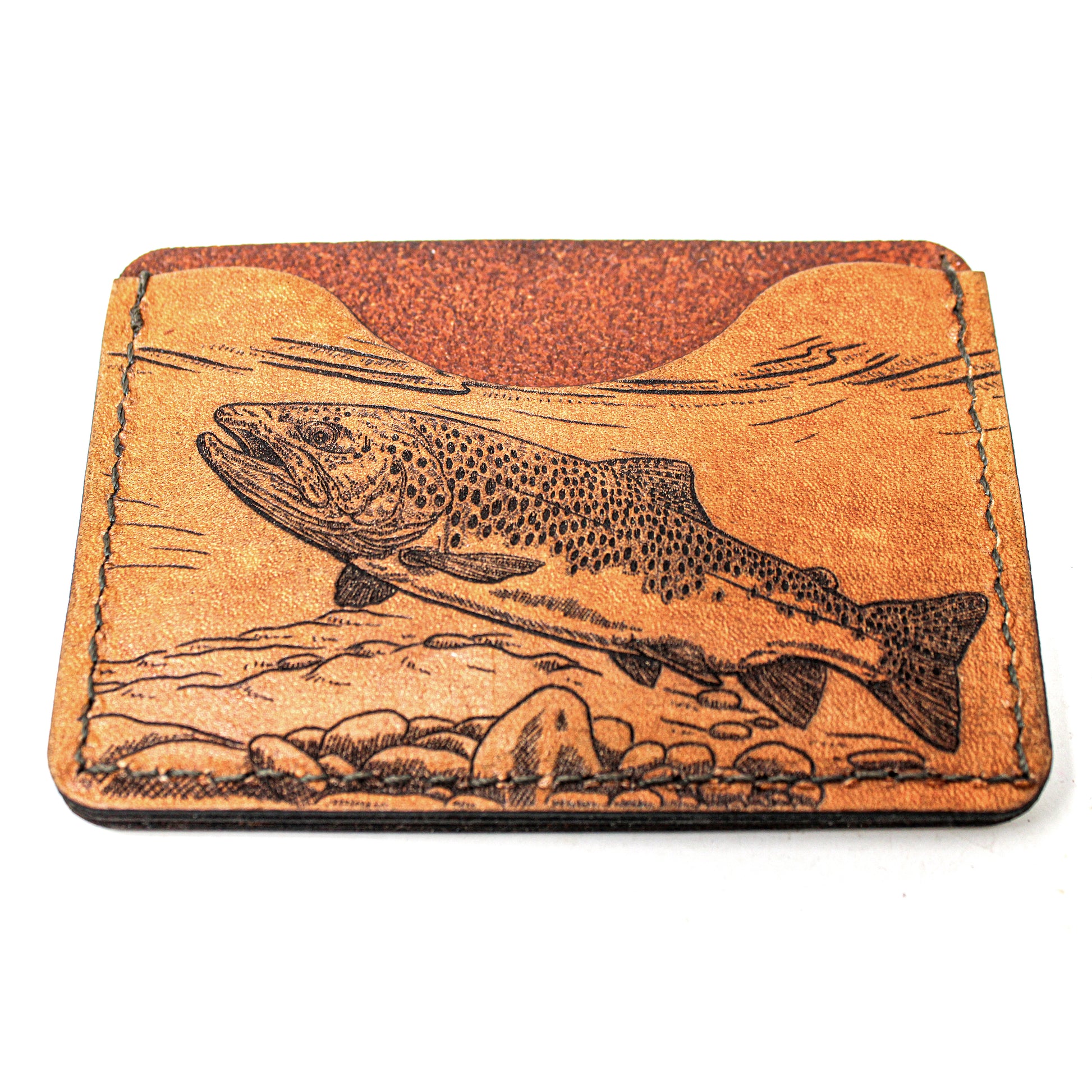 Hand stained. Hand distressed. Each wallet is unique in it's own way. A great rugged look! Using Artist Matt Herman’s illustrated Brown Trout... Balanced with a simple water line and rock bed elements.