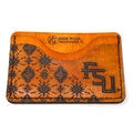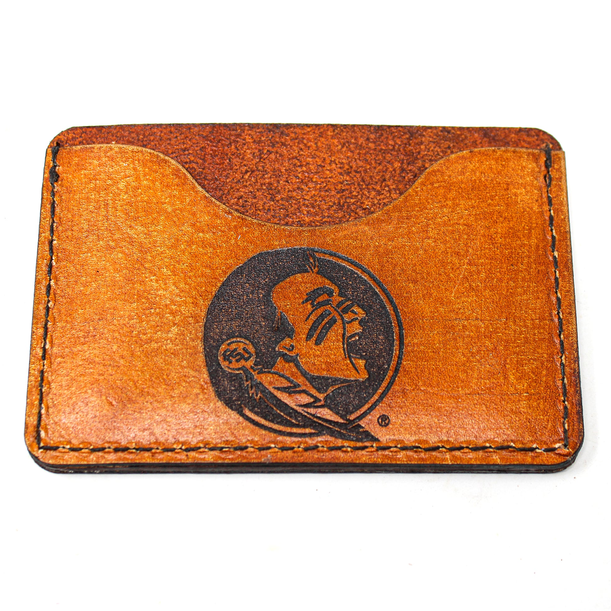 Hand stained. Hand distressed. Each wallet is unique in it's own way. A great rugged look! Using FSU licensed Branding with our pattern we developed in the spirit of the Seminoles.