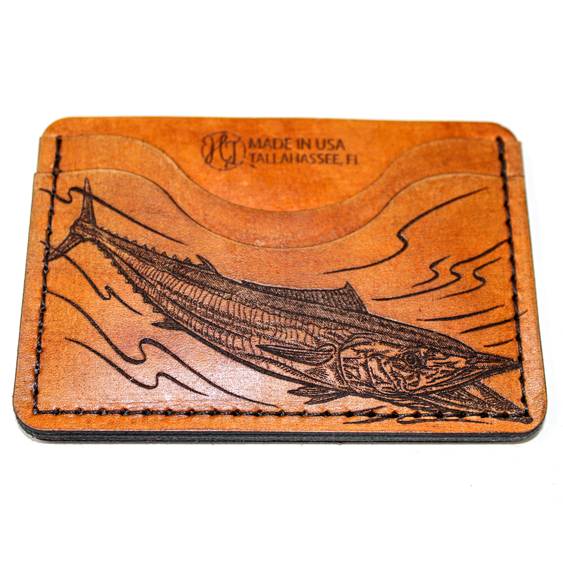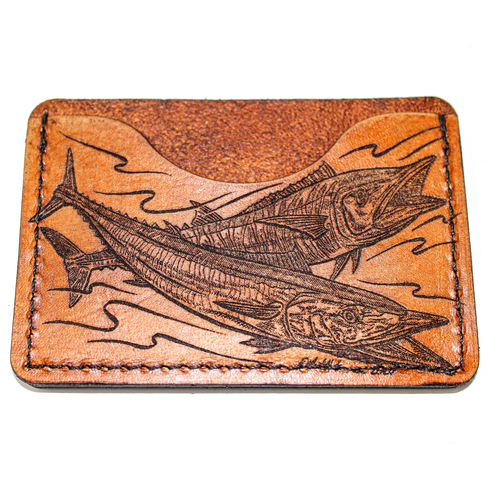 Hand stained. Hand distressed. Each wallet is unique in it's own way. A great rugged look! Using one of Matt Herman’s illustrated scene showing wahoo running.. Balanced with a simple rifle engraving style element.