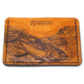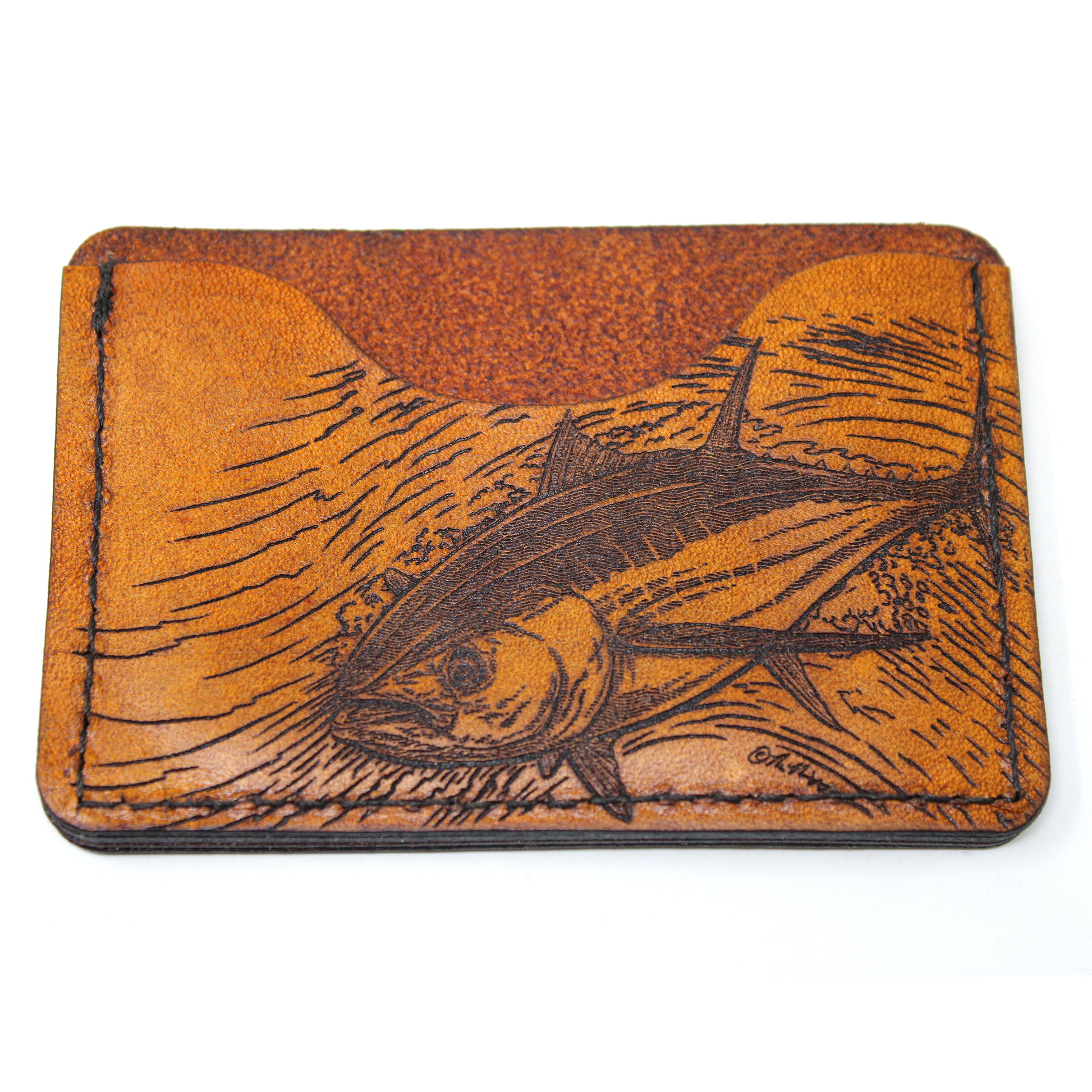 Hand stained. Hand distressed. Each wallet is unique in it's own way. A great rugged look! Using Artist Matt Herman’s illustrated Yellofin Tunas... Balanced with a simple water line style elements.