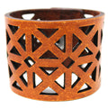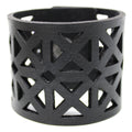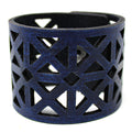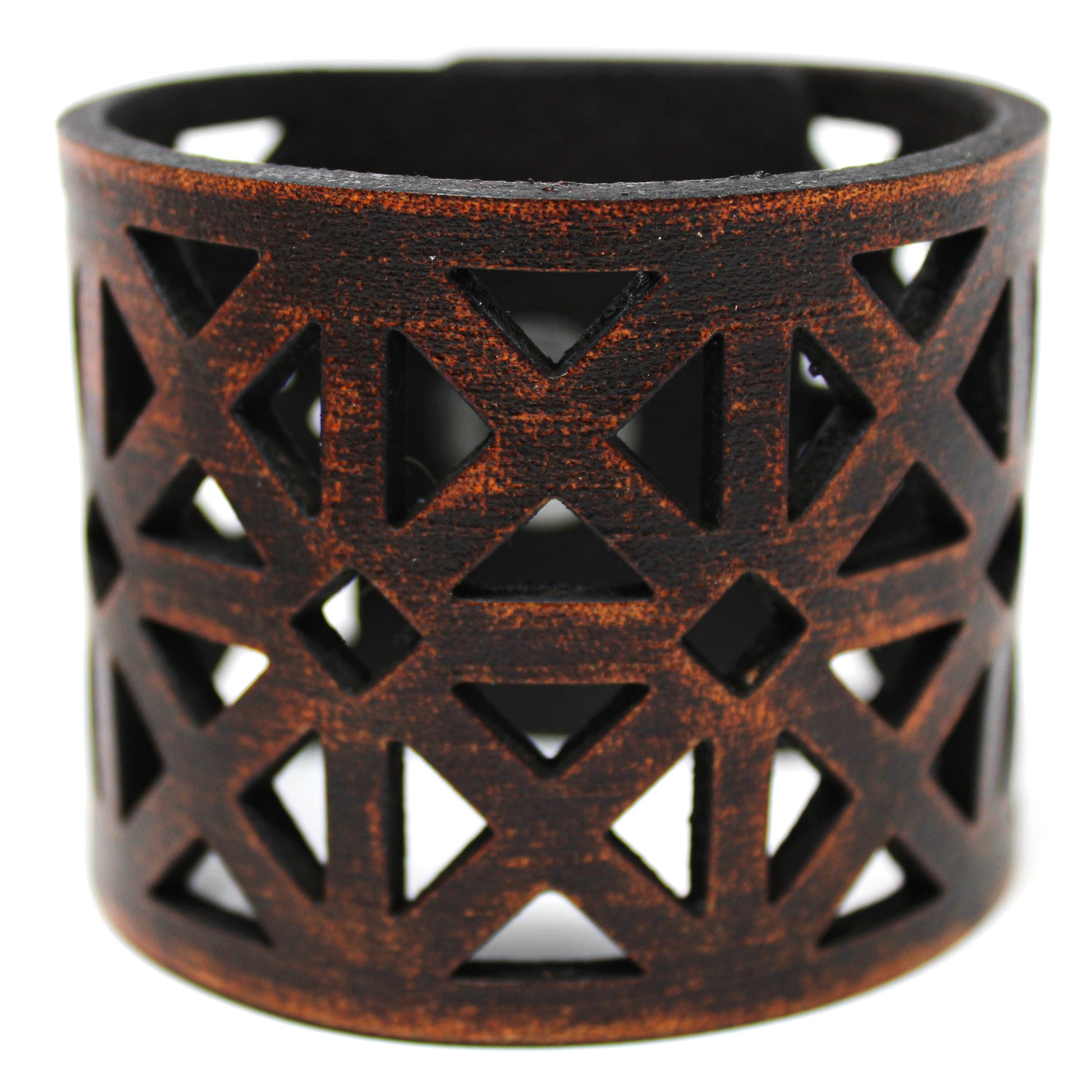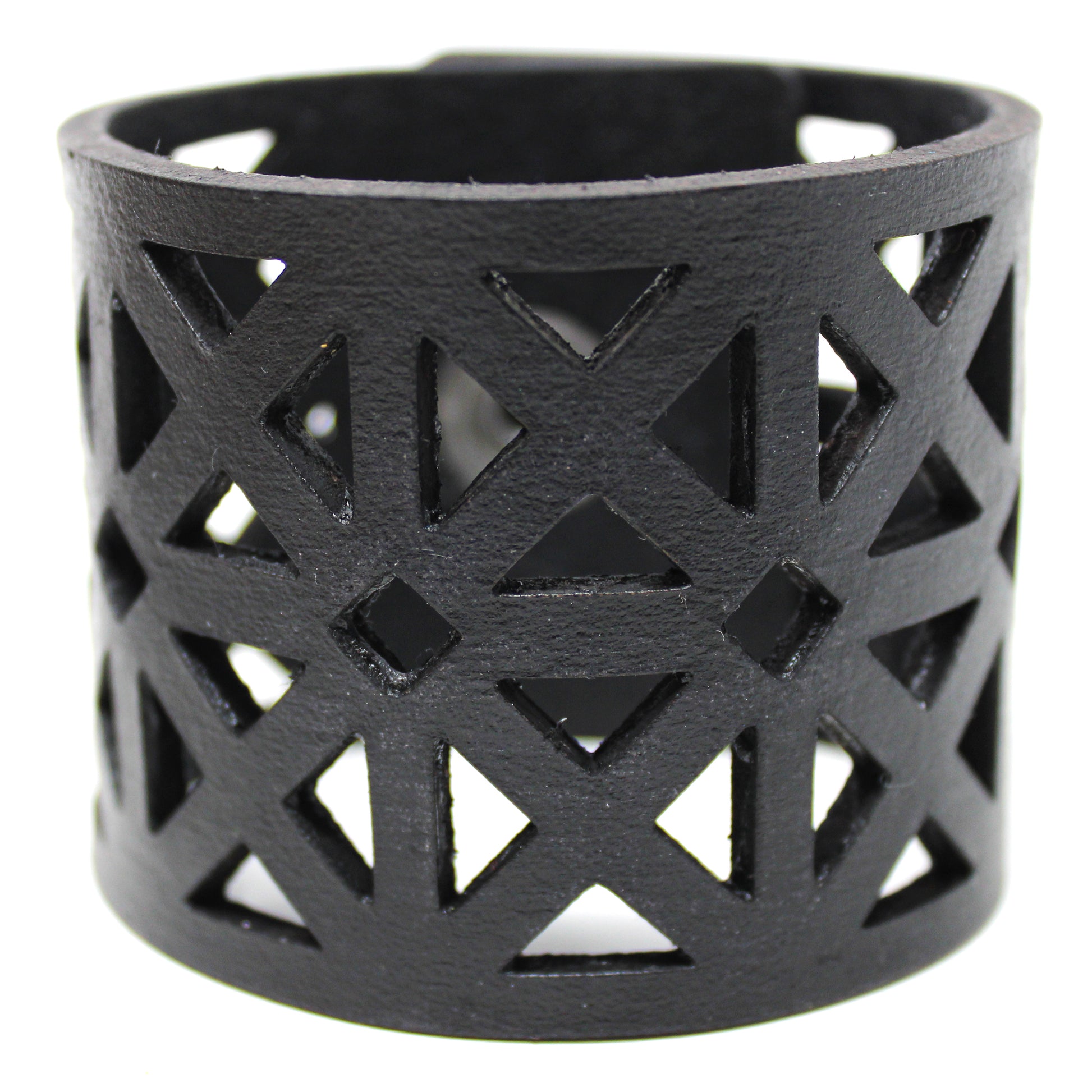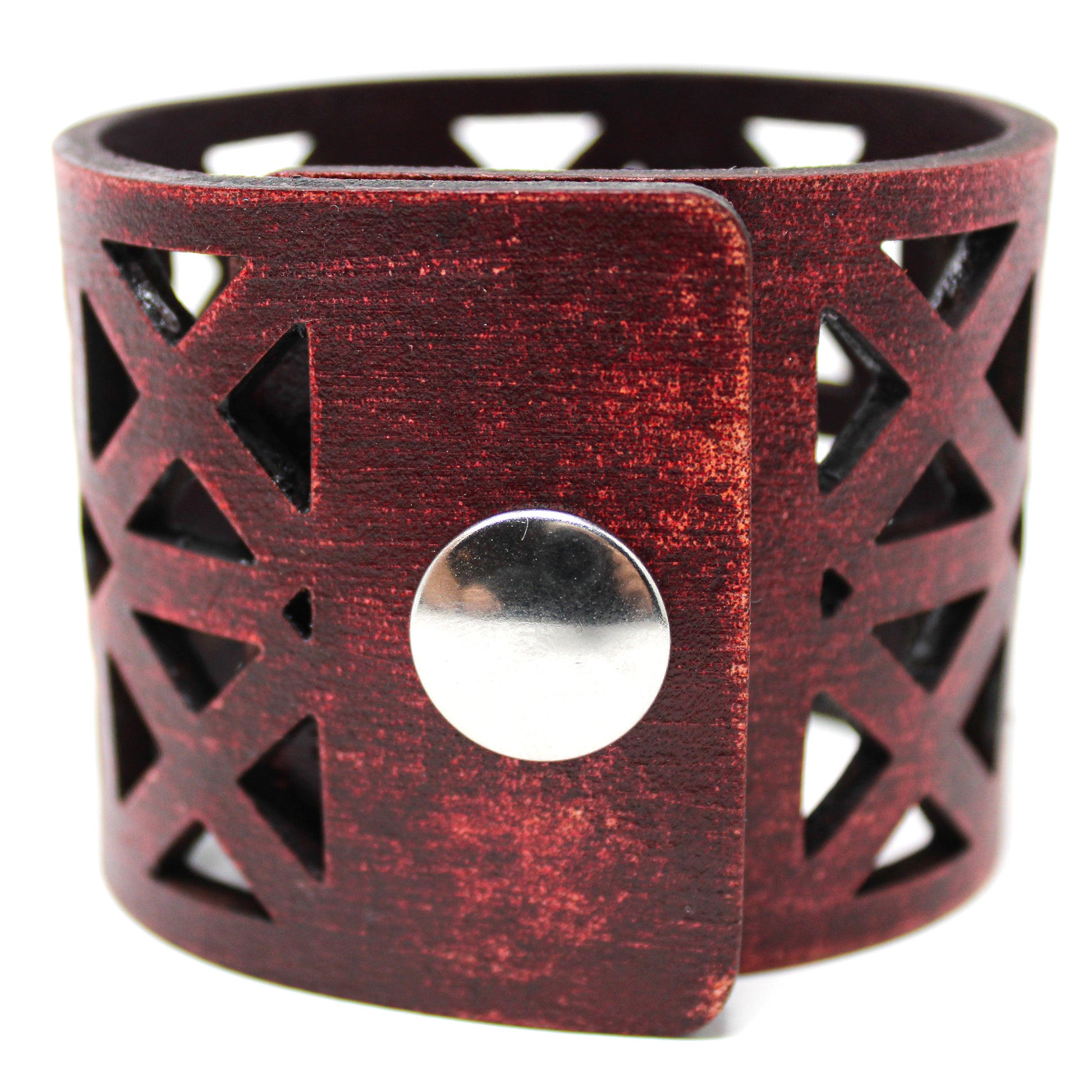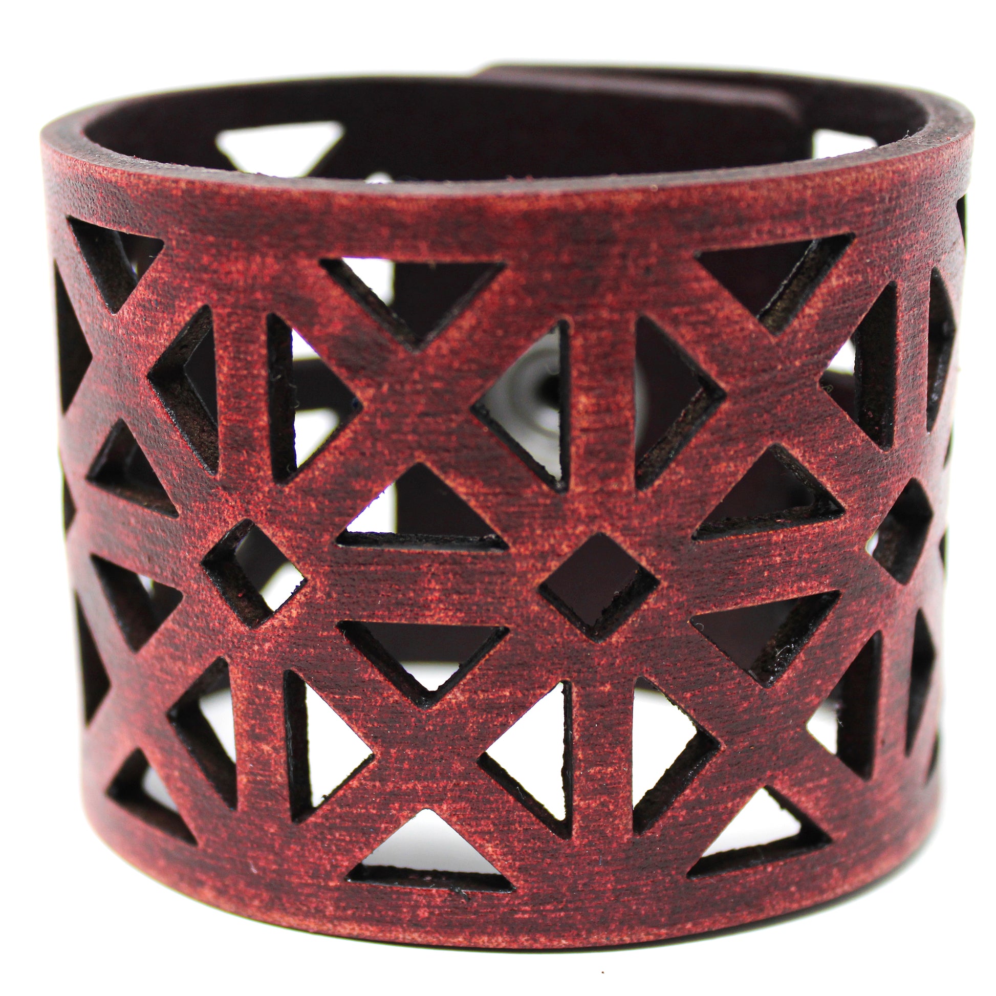 Simple, but elegant line of thick 100% leather Cuffs with laser engraved and cut bold triangles. Artisan hand finished treatments. Featuring stainless steel snaps for those fun in the sun days on the beach. Proudly made in Tallahassee, FL USA.