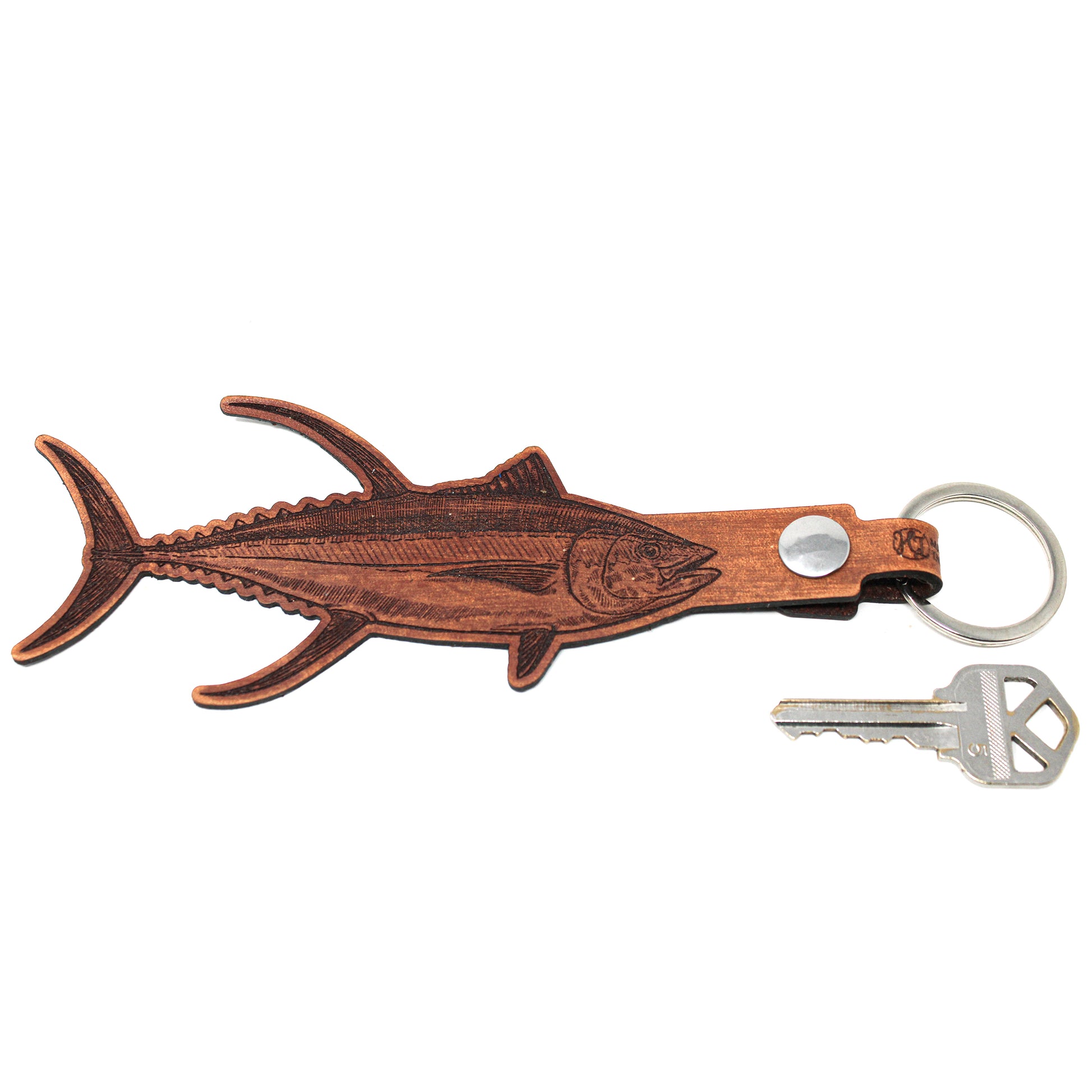 100% Leather Keychain. Fishing inspired illustrated laser engraved designs with Artisan hand finished treatments. Featuring stainless steel snaps for taking the boat out for the day. The color is a light brown dye. Proudly made in Tallahassee, FL USA.