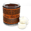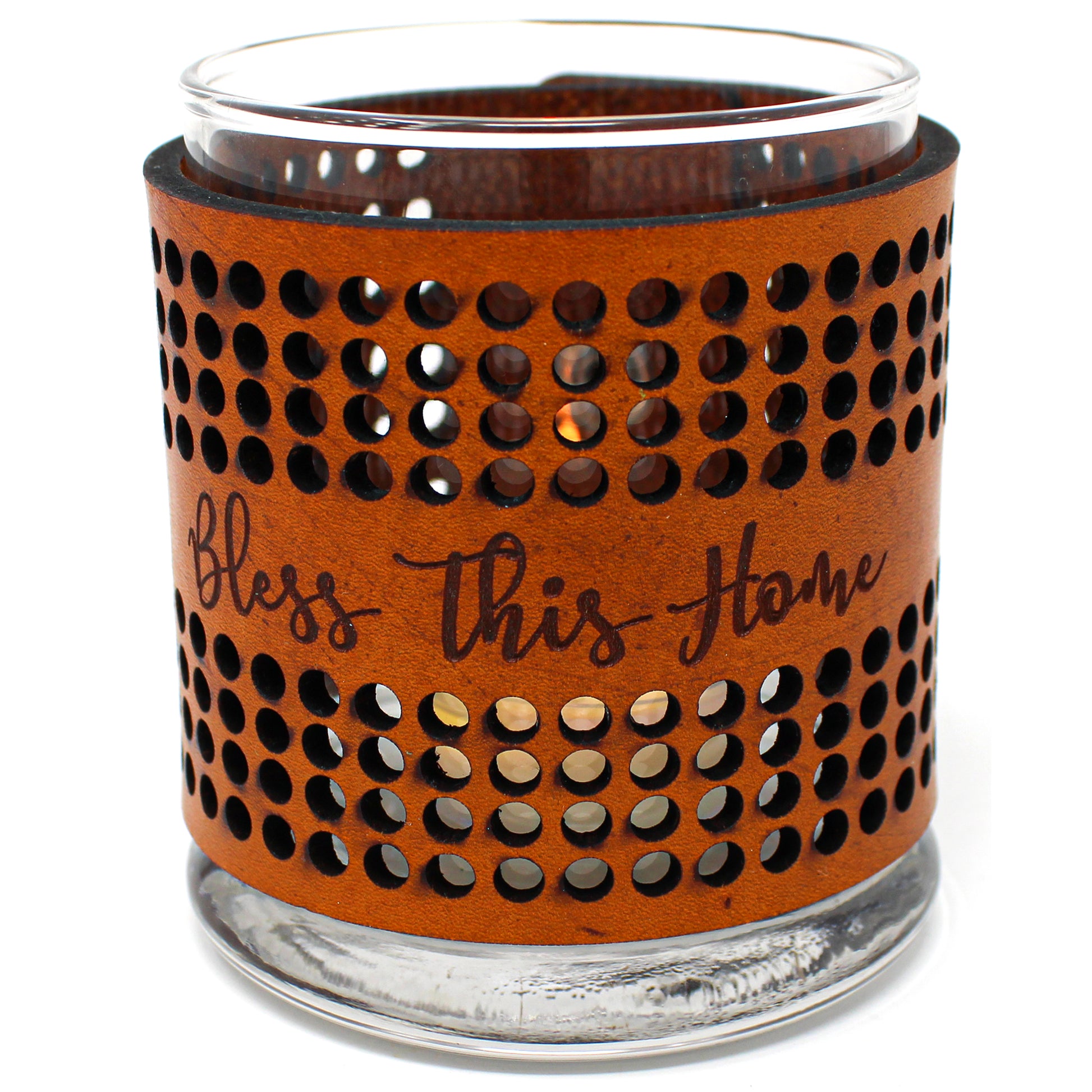 Innovative combination using a 12 oz. glass Libby candle holder and then adding our own unique twist of cut leather which we wrap around it and fasten with a sturdy stainless steel snap. Comes with 3 hand poured seasonal scented tea light candles of our choice to start you out.