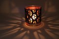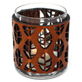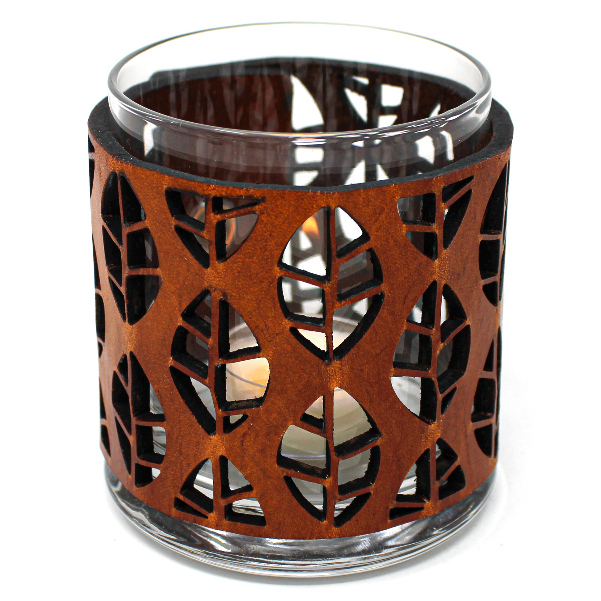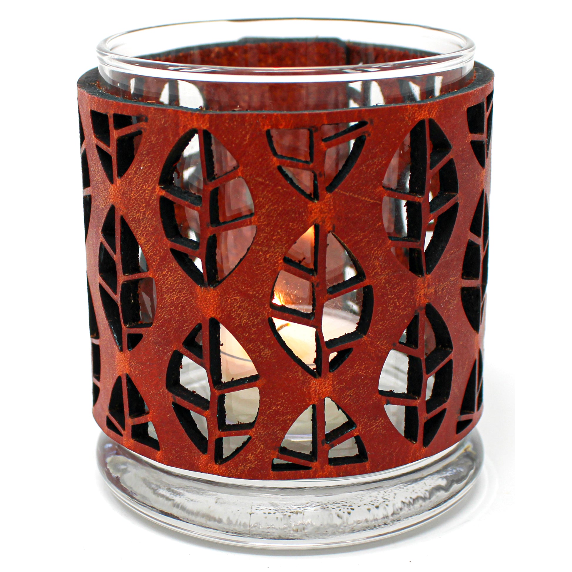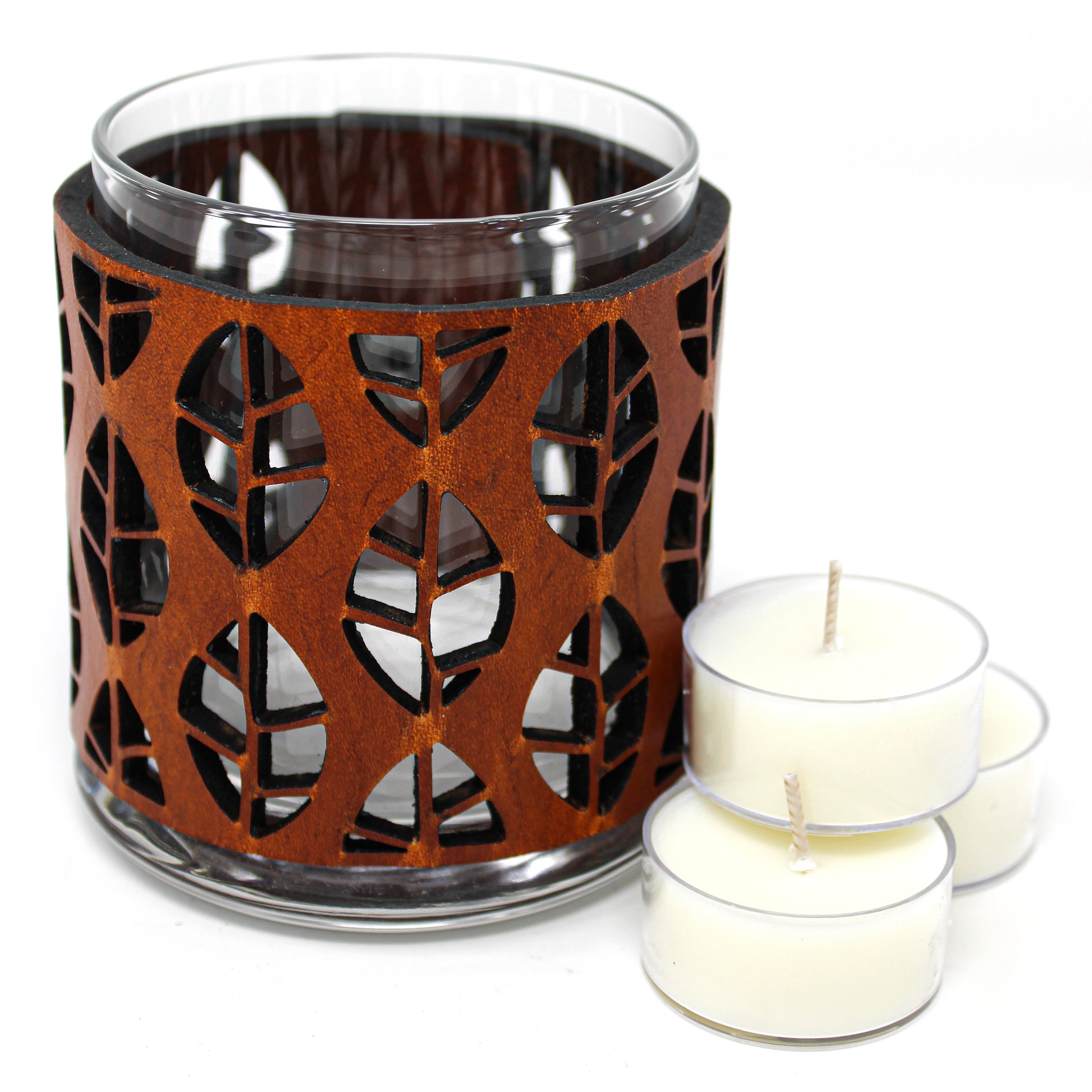 Innovative combination using a 12 oz. glass Libby candle holder and then adding our own unique twist of cut leather which we wrap around it and fasten with a sturdy stainless steel snap.