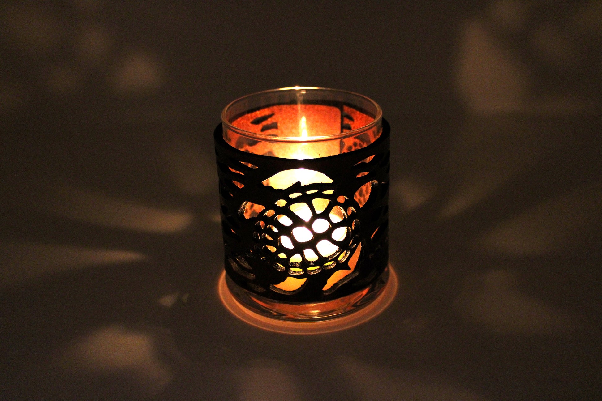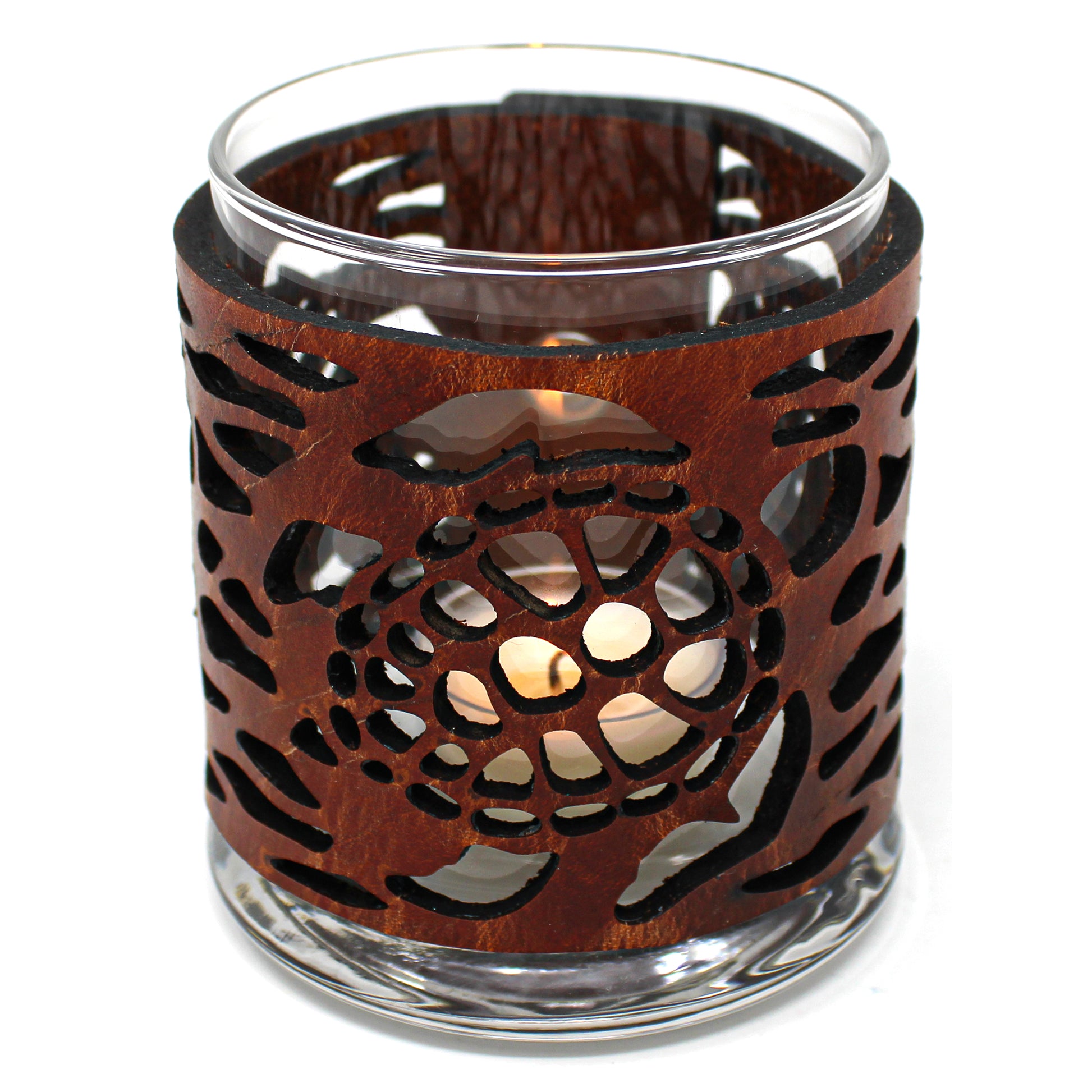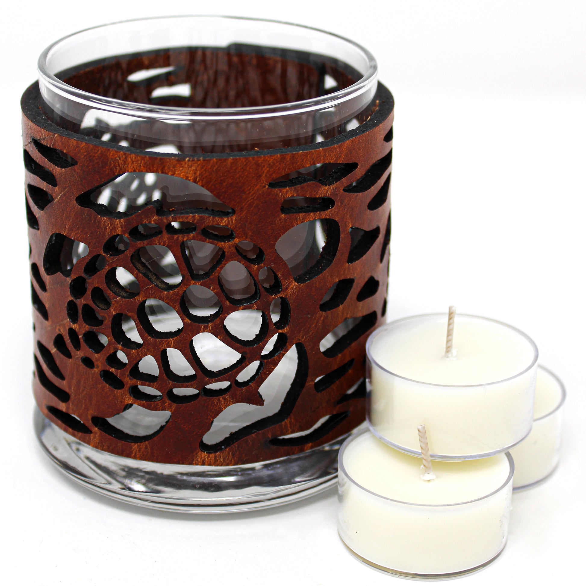 Innovative combination using a 12 oz. glass Libby candle holder and then adding our own unique twist of cut leather which we wrap around it and fasten with a sturdy stainless steel snap. Comes with 3 hand poured seasonal scented tea light candles of our choice to start you out.