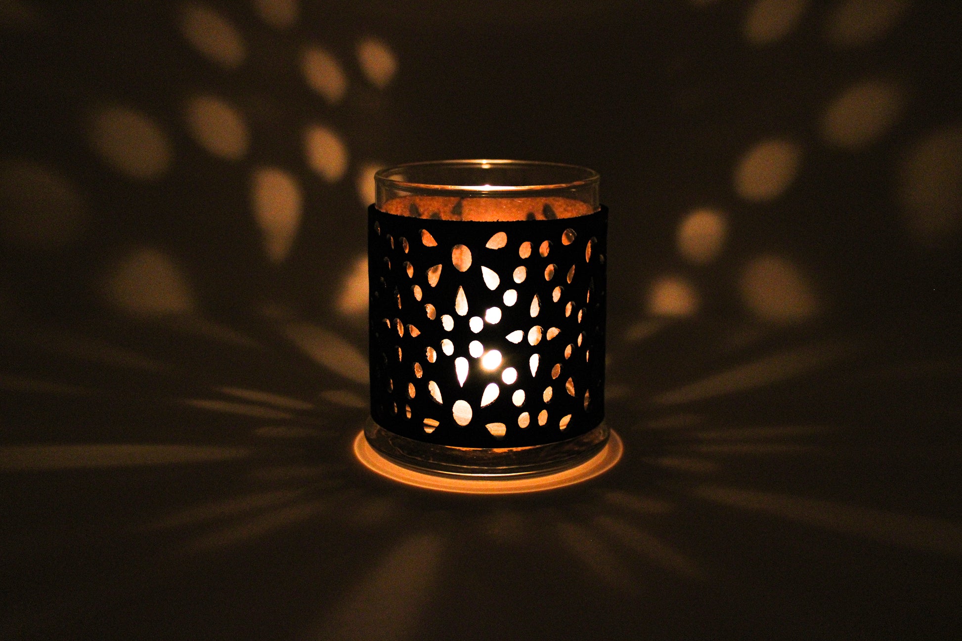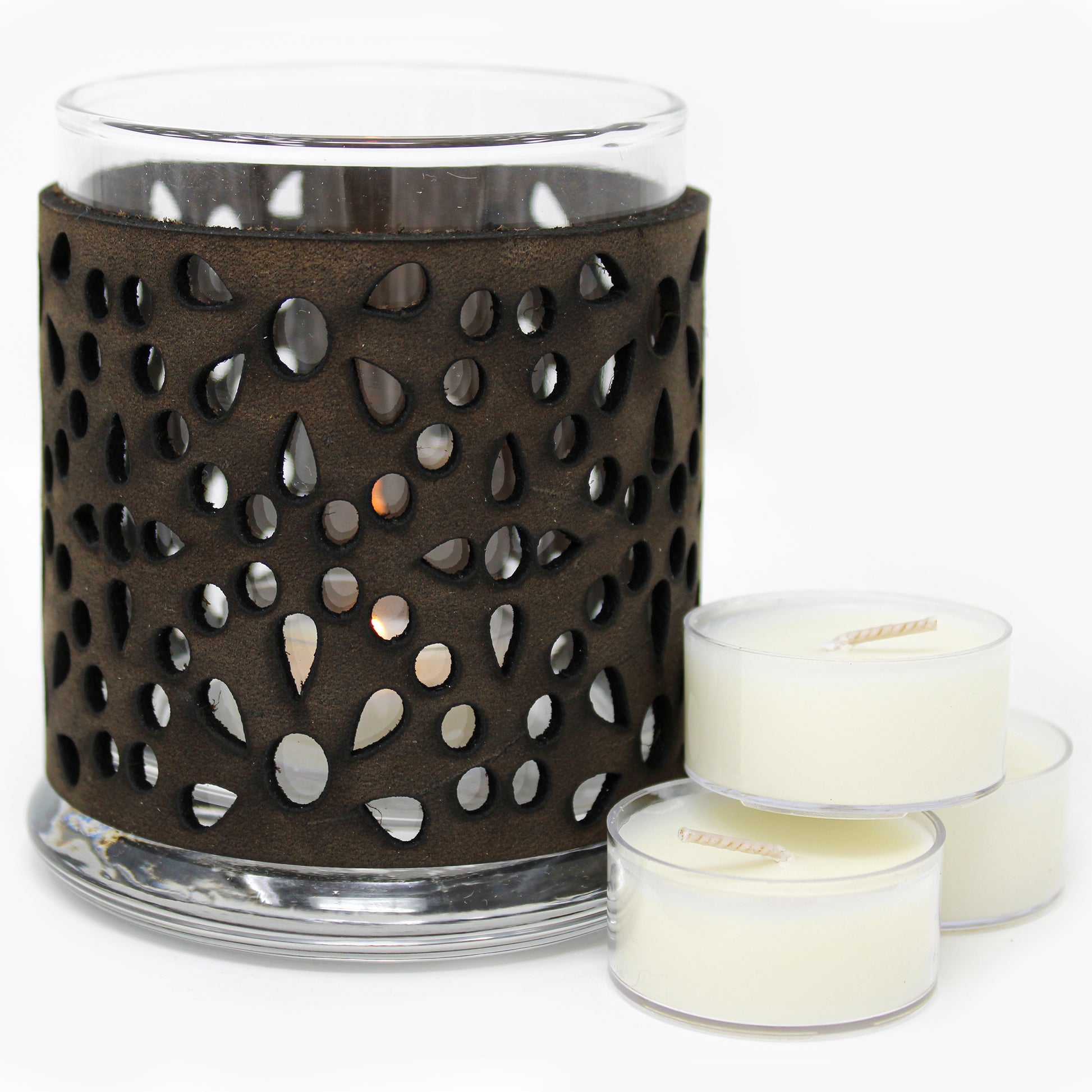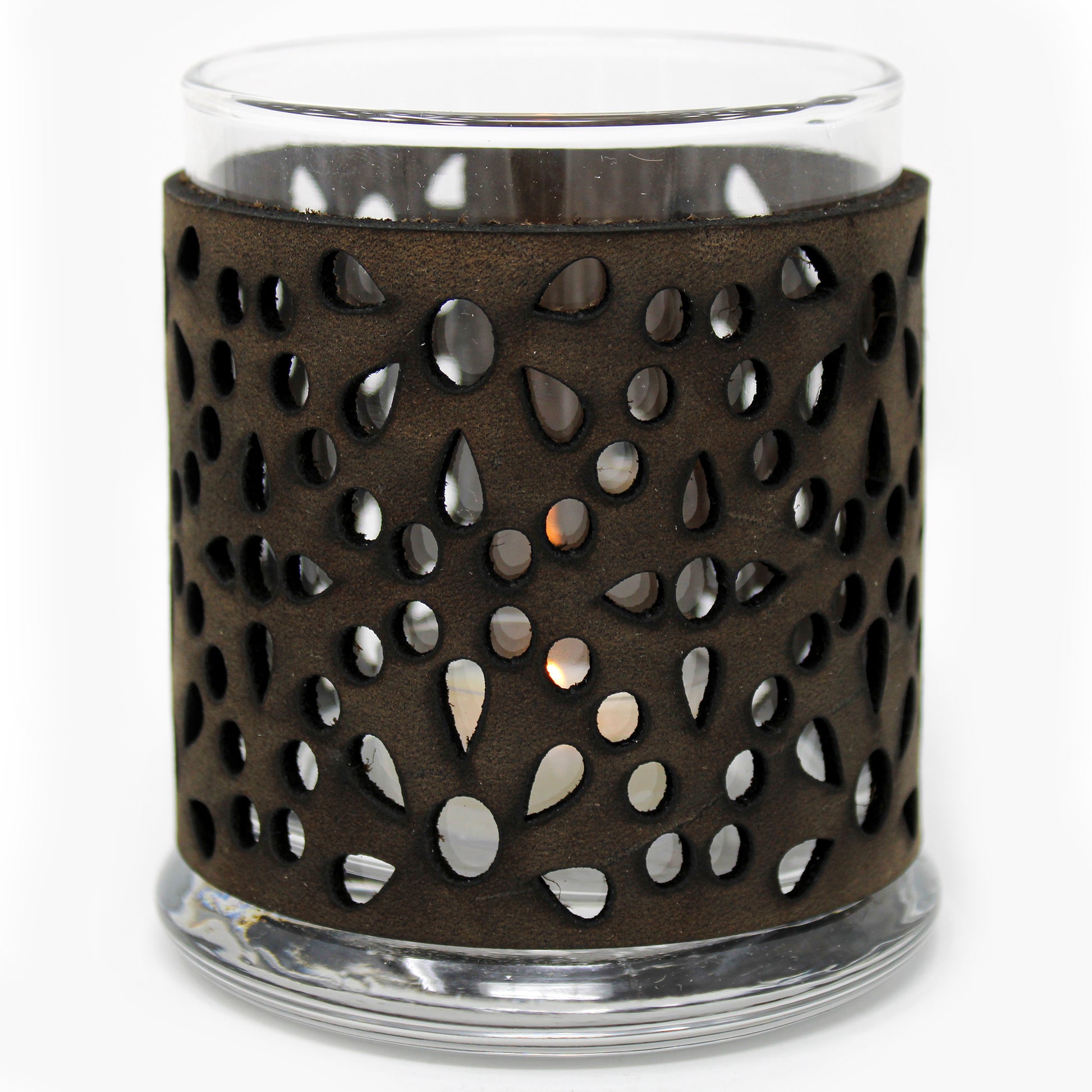 Innovative combination using a 12 oz. glass Libby candle holder and then adding our own unique twist of cut leather which we wrap around it and fasten with a sturdy stainless steel snap. Comes with 3 hand poured seasonal scented tea light candles of our choice to start you out.