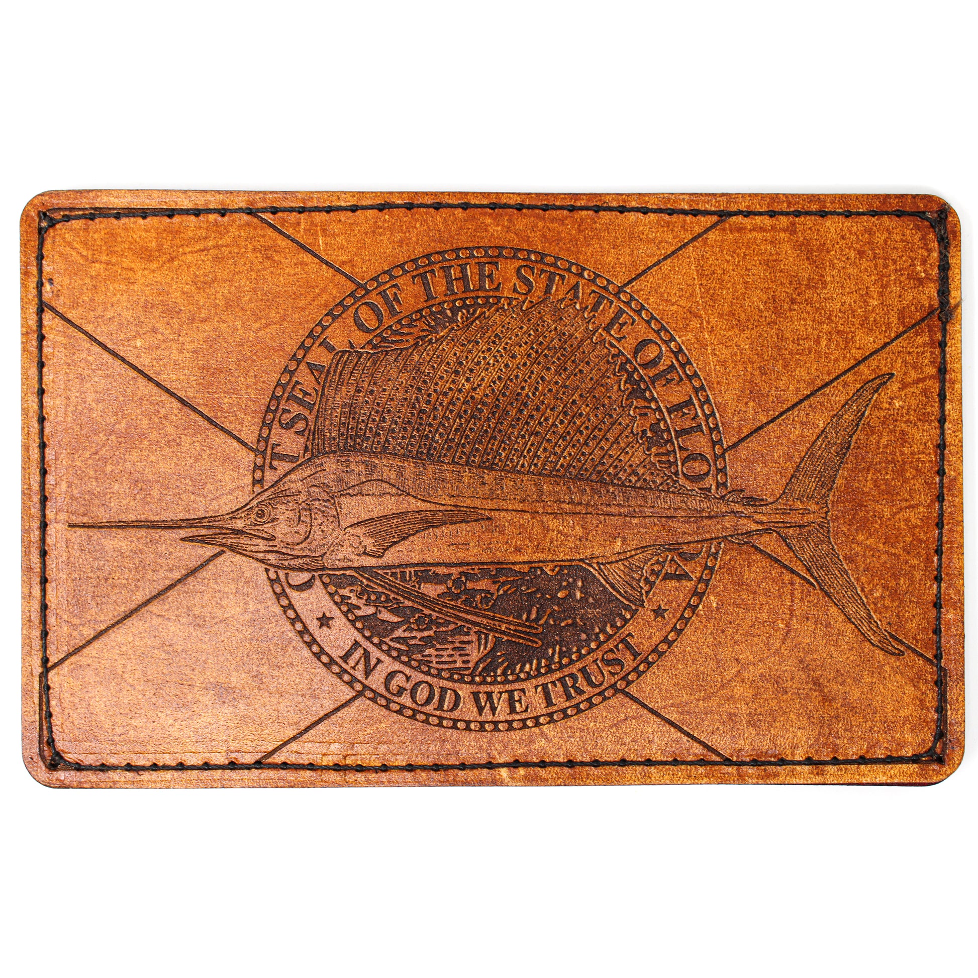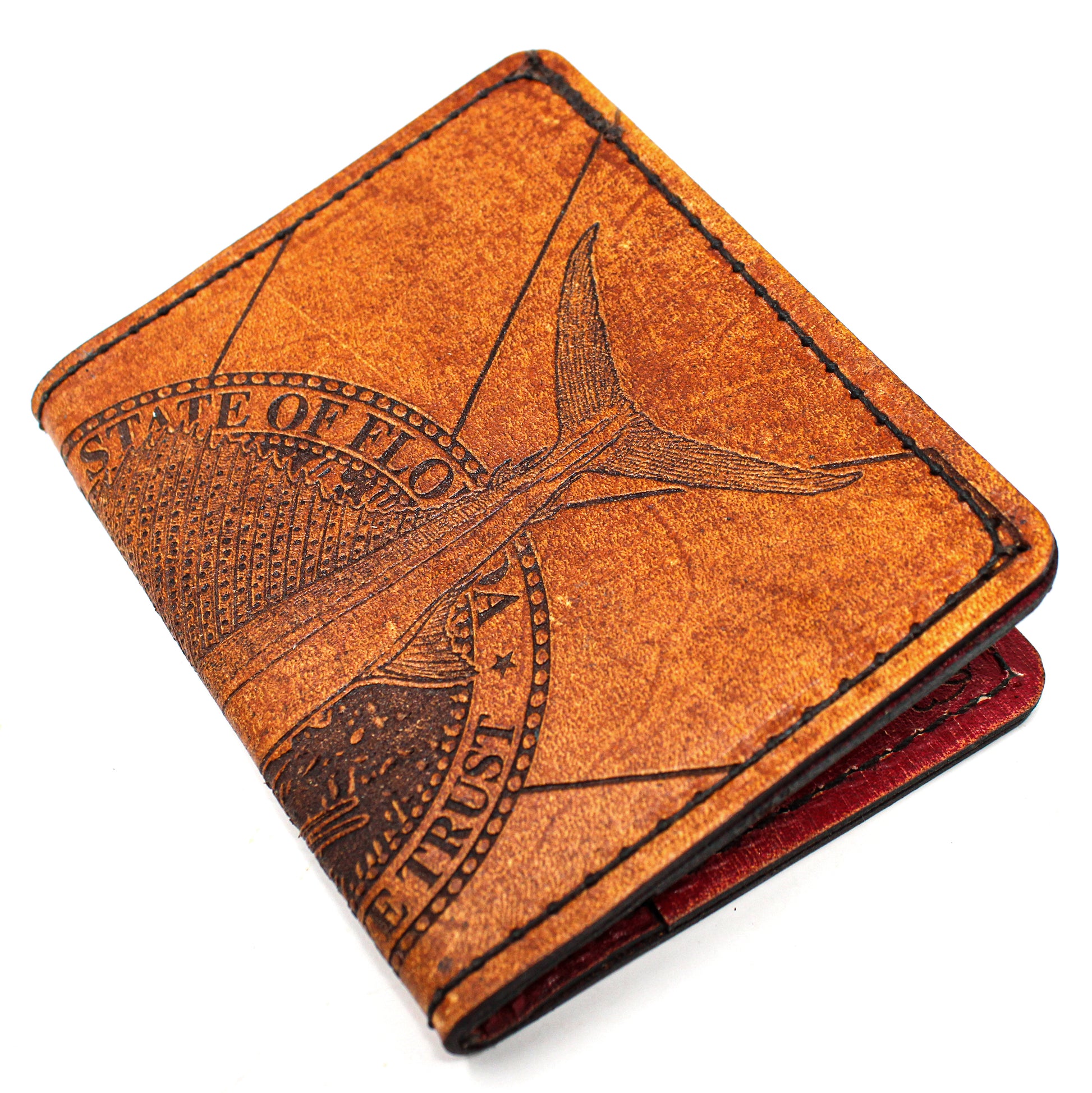 Hand stained. Hand distressed. Each wallet is unique in it's own way. A great rugged look! Using one of Matt Herman’s illustrated scientific study interpretations of a Sailfish as the focal point with the Florida Flag as the backdrop.