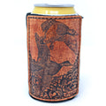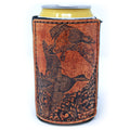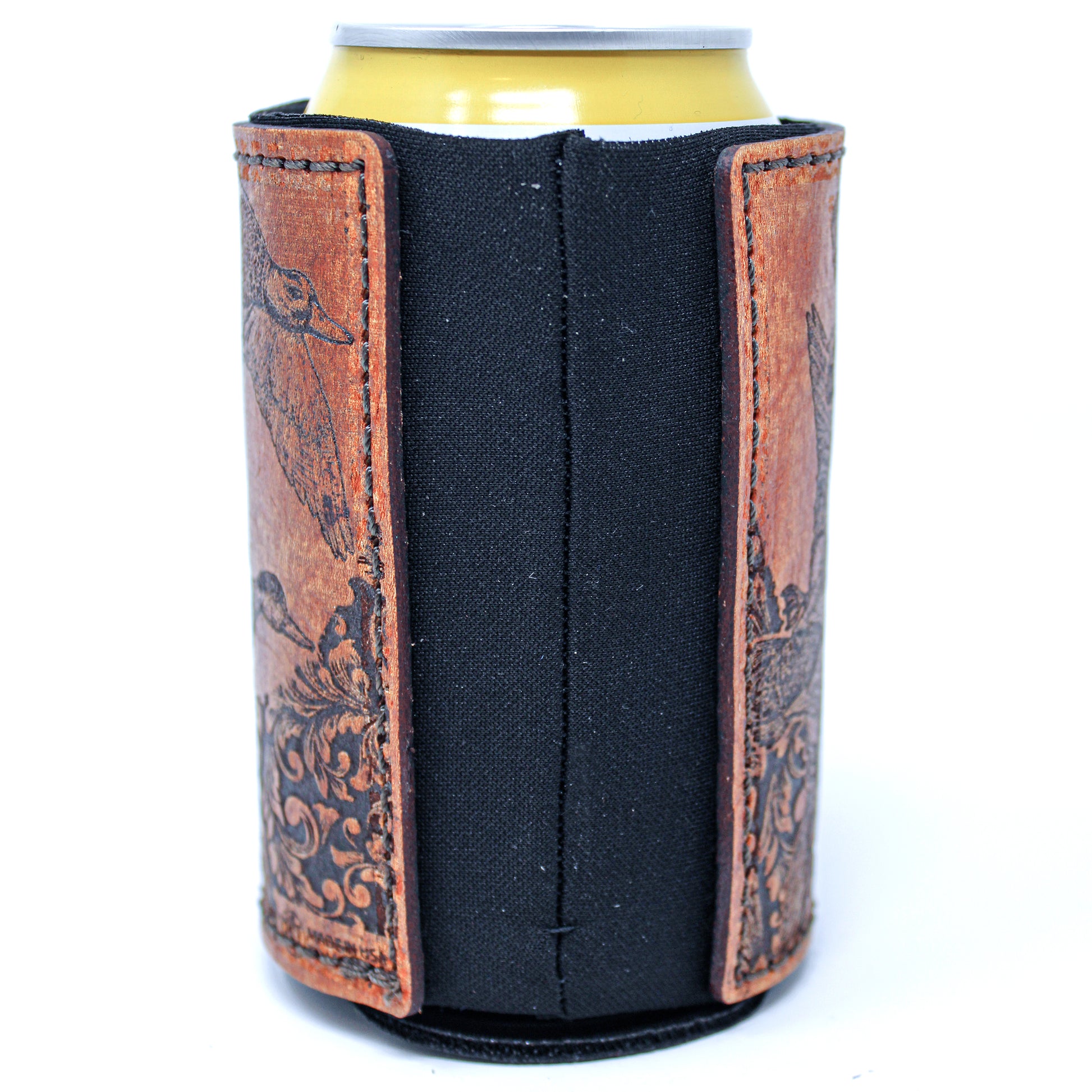 Here's one of our ultimate large leather patch drink sleeve series. Totally built from scratch. Using thick neoprene fabric as inner liner for memory stretch and then framing with 2 decorative large leather 5-7 oz patches on both sides adding support. Hand stained and hand distressed making each one unique. An overall great look that will not only be a great identifier of your beverage, but a great conversation starter.