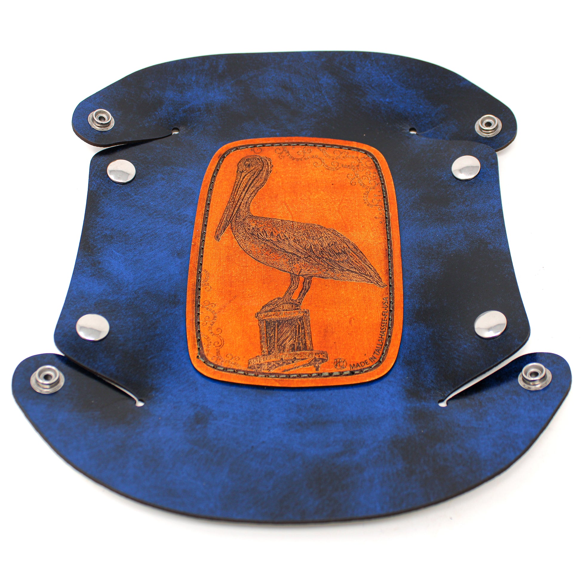 Our custom made valet trays are made with 6-7oz polished stiff leather. A perfect leather for our tray series. Also we've given it extra support with a heavy sewn down leather patch with our own original illustrations.