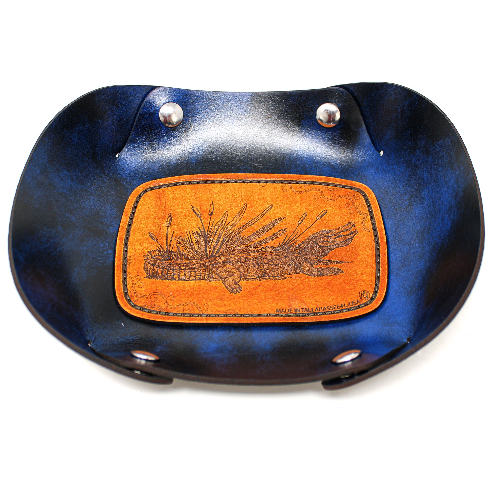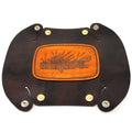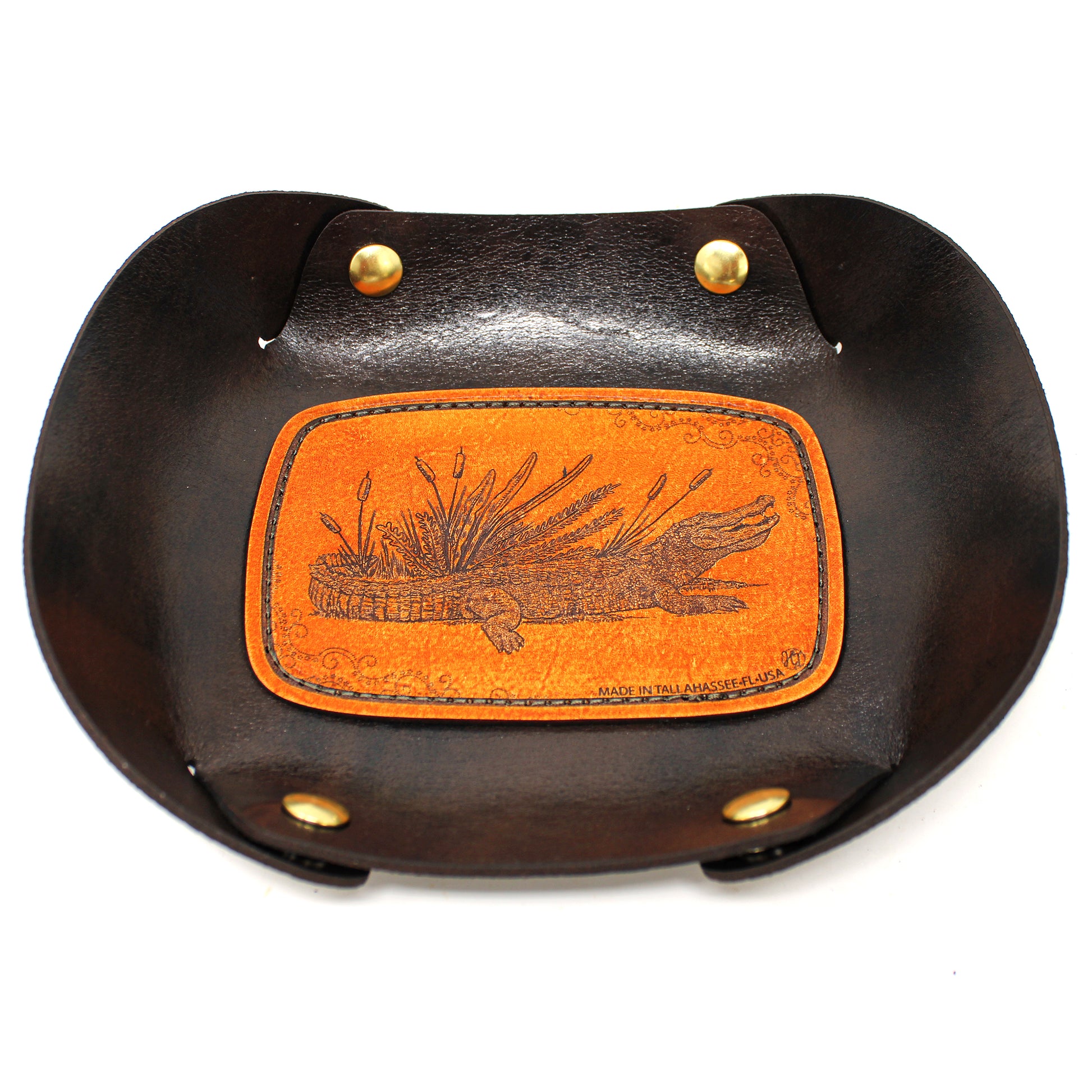 Our custom made valet trays are made with 6-7oz polished stiff leather. A perfect leather for our tray series. Also we've given it extra support with a heavy sewn down leather patch with our own original illustrations.