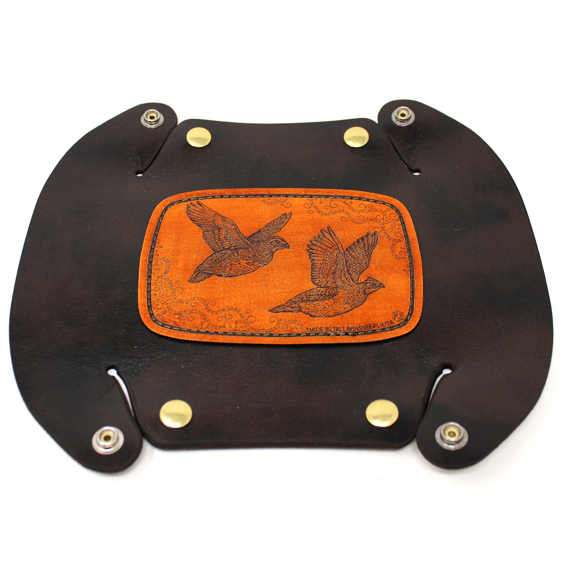 Our custom made valet trays are made with 6-7oz polished stiff leather. A perfect leather for our tray series. Also we've given it extra support with a heavy sewn down leather patch with our own original illustrations.