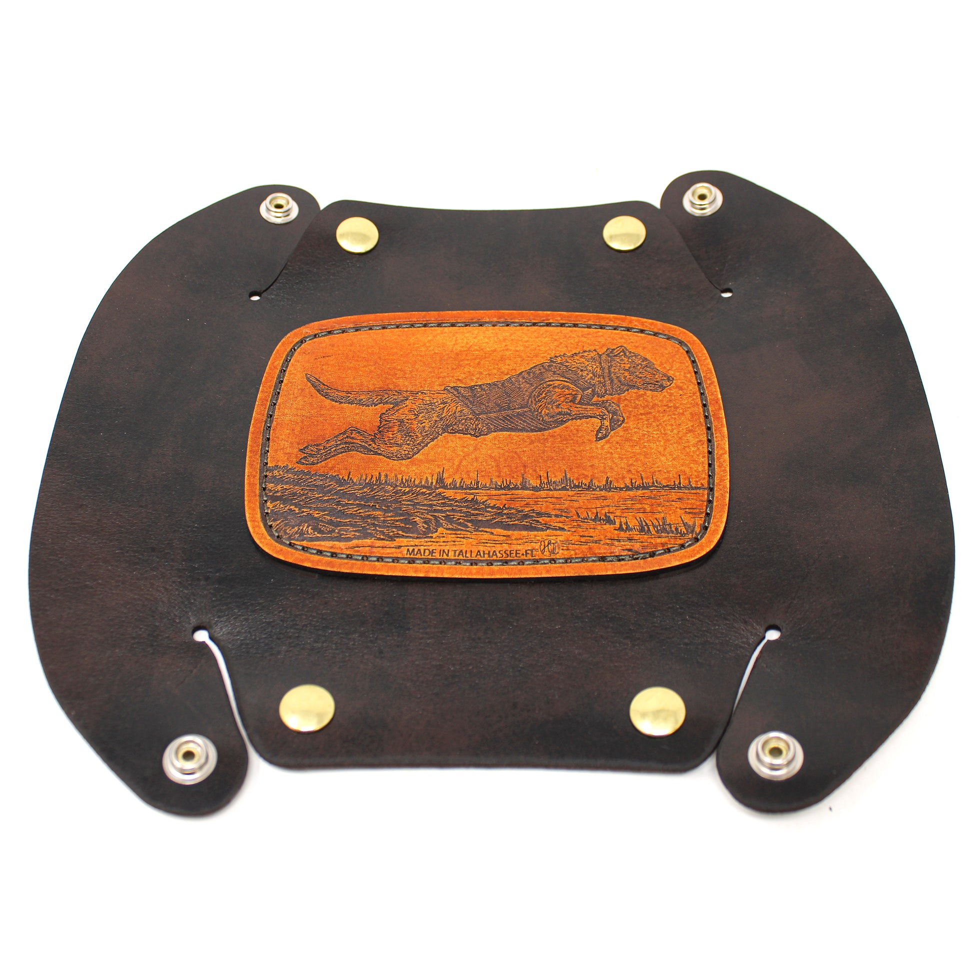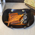 Our custom made valet trays are made with 6-7oz polished stiff leather. A perfect leather for our tray series. Also we've given it extra support with a heavy sewn down leather patch with our own original illustrations.