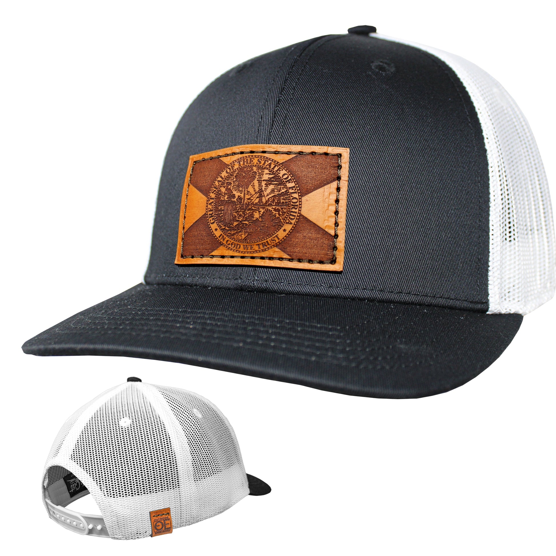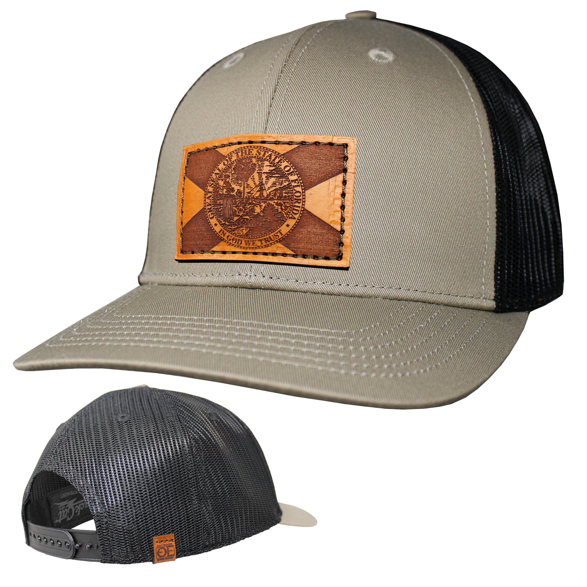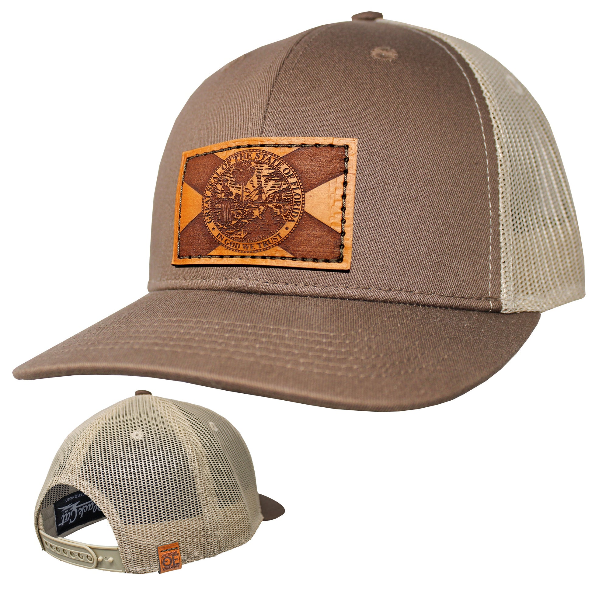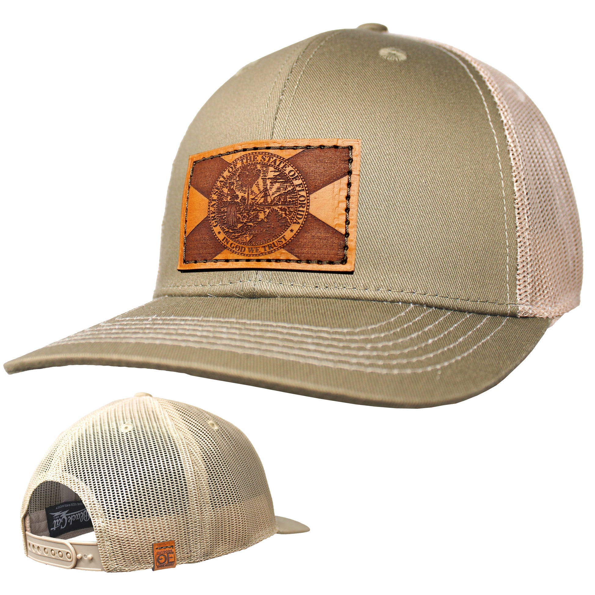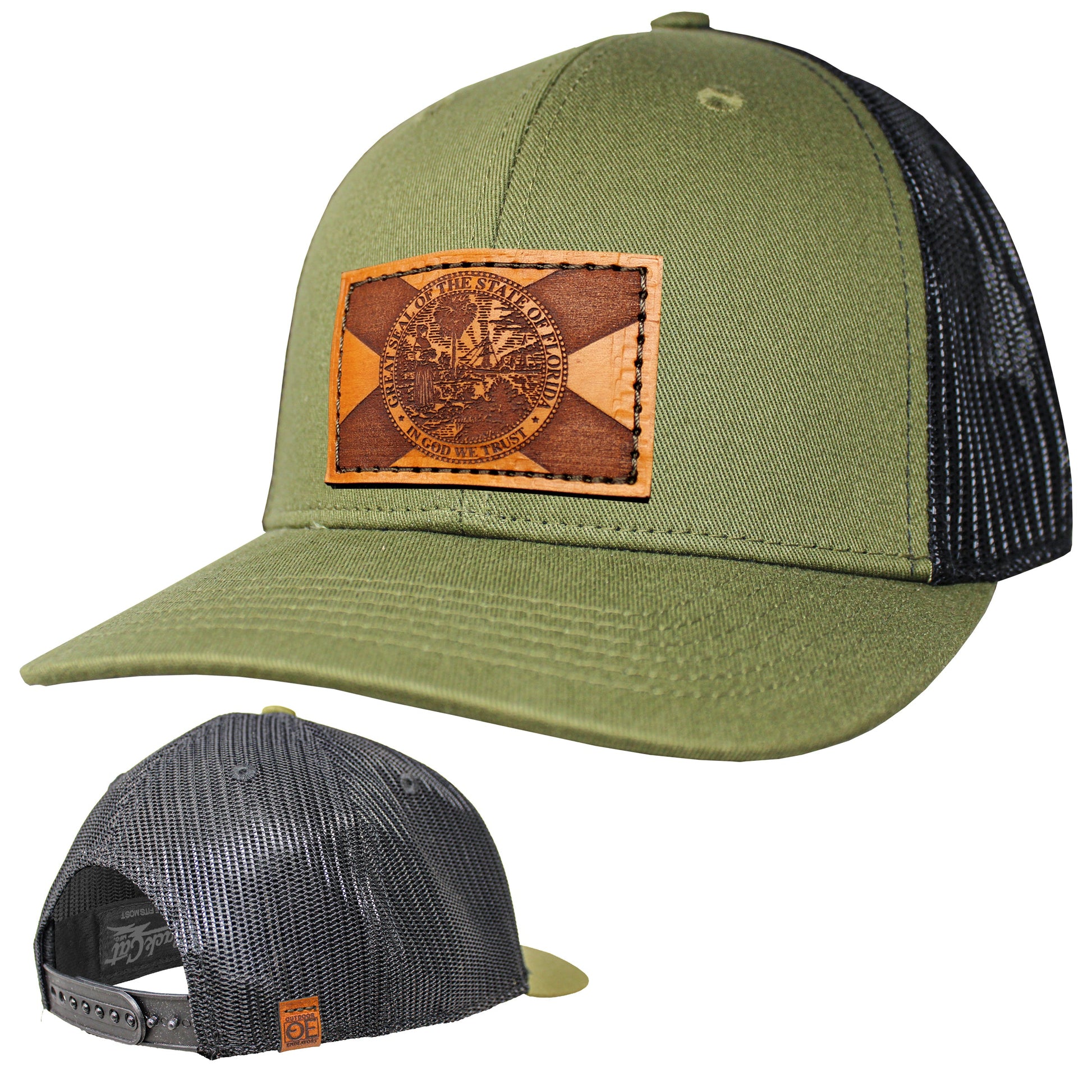 6 panel mid profile trucker cap with plastic closure. Moisture wicking fabrics on sweatband and inner front panel for best performance comfort. Decorated with a quality genuine leather patch with the Florida Flag.