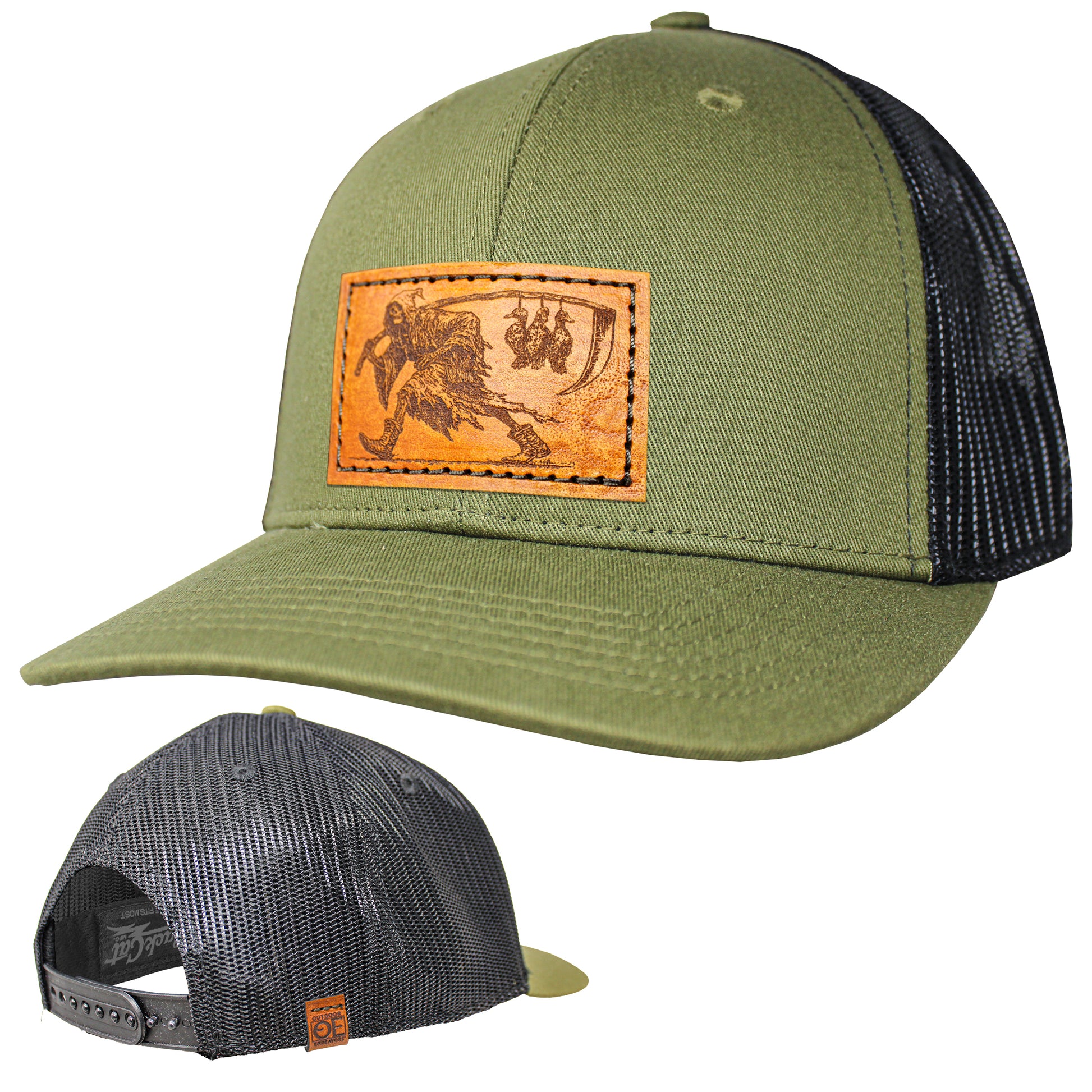 6 panel mid profile trucker cap with plastic closure. Moisture wicking fabrics on sweatband and inner front panel for best performance comfort. Decorated with a quality genuine leather patch with Reaper carry 3 mallard ducks strung up on his scythe illustration from Matt Herman.